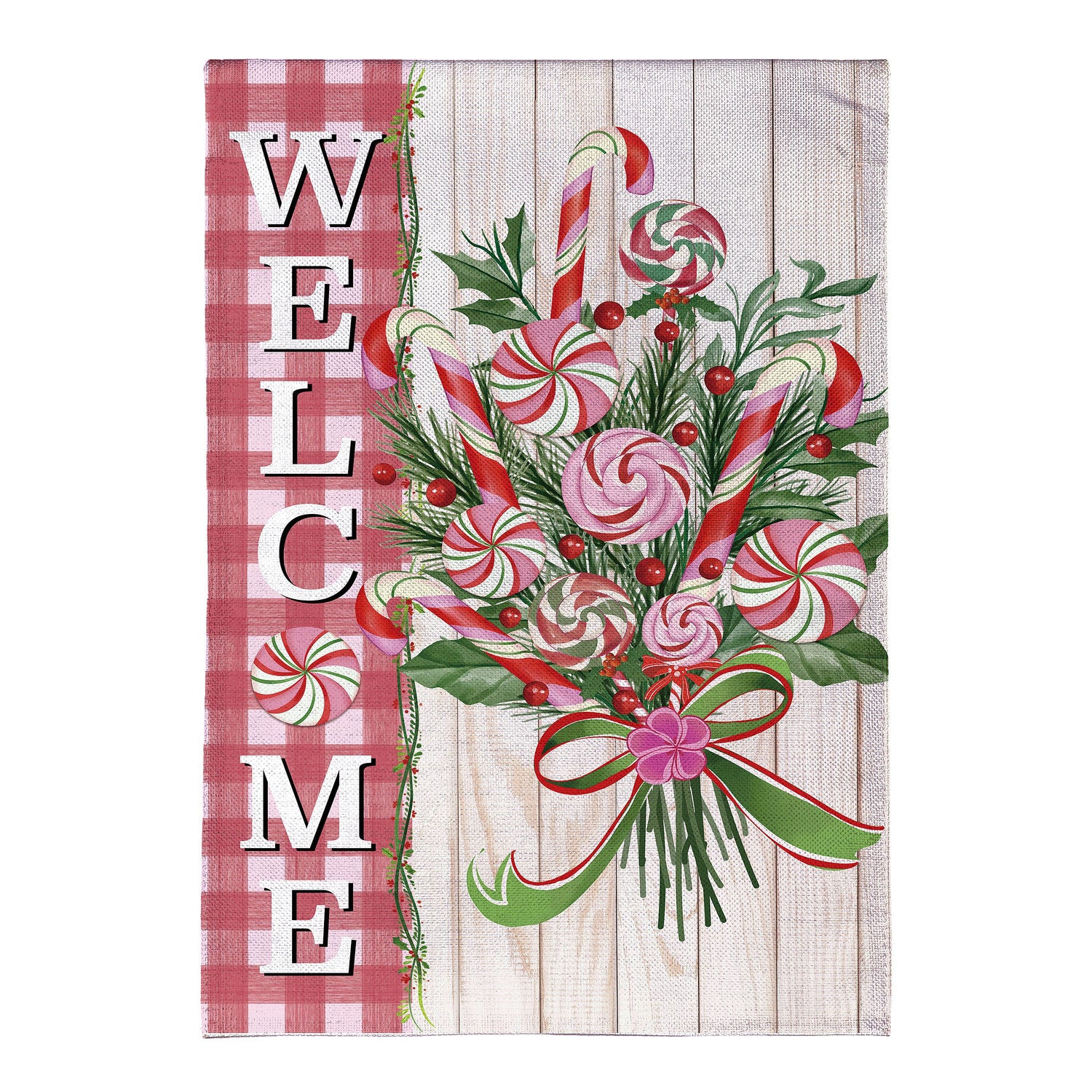 Add magic and wonder to any garden or yard when you hang up this beautiful flag. Featuring a bright candy cane bouquet, this flag is perfect for the festive season. This flag is made of medium-weight, soft burlap fabric that's made from recycled plastic that has the look and feel of real burlap. Artwork is heat transferred onto both sides of the textured fabric to create a natural, crafted look. The flag is durable and weatherproof and will not fade or fray after continued display. This flag features a sleeve for use with any standard flagpole or stand, sold separately.