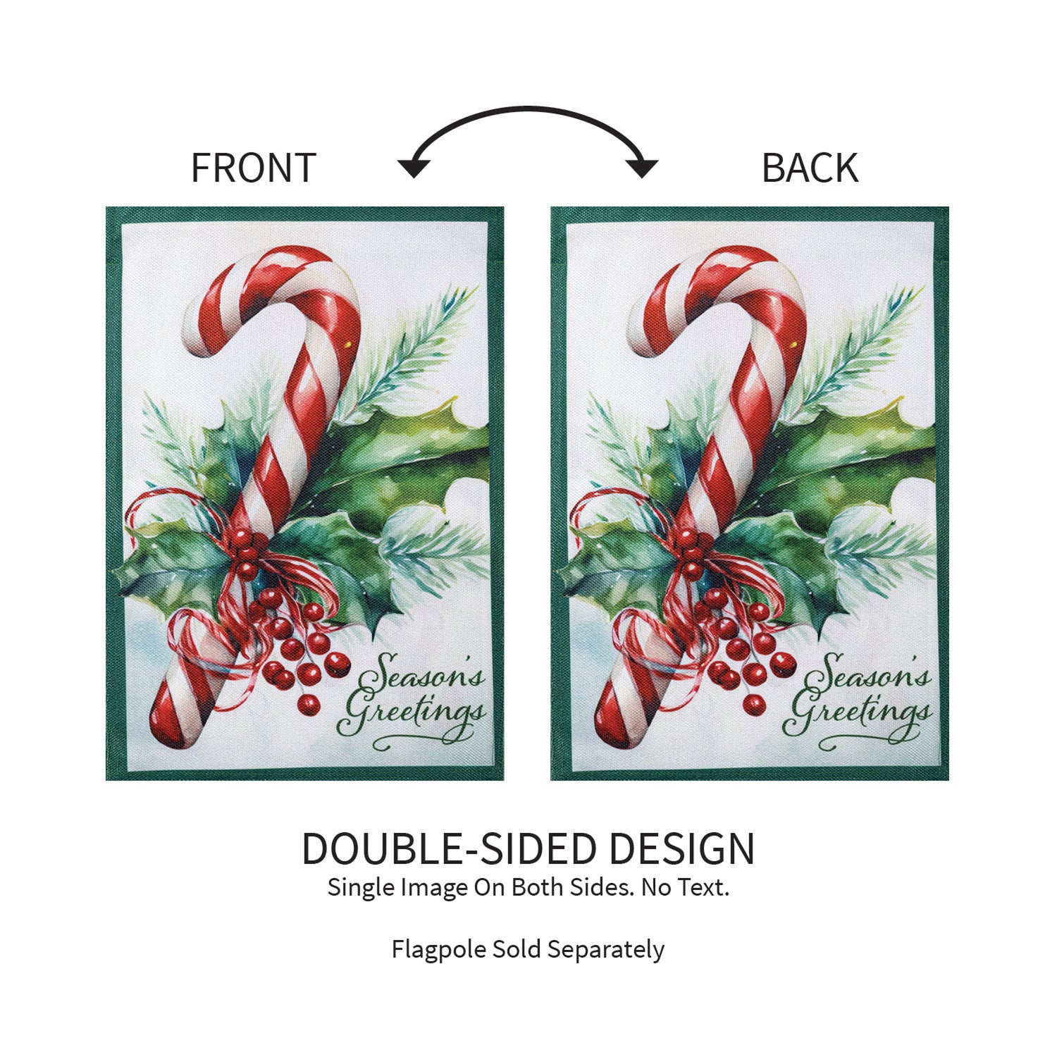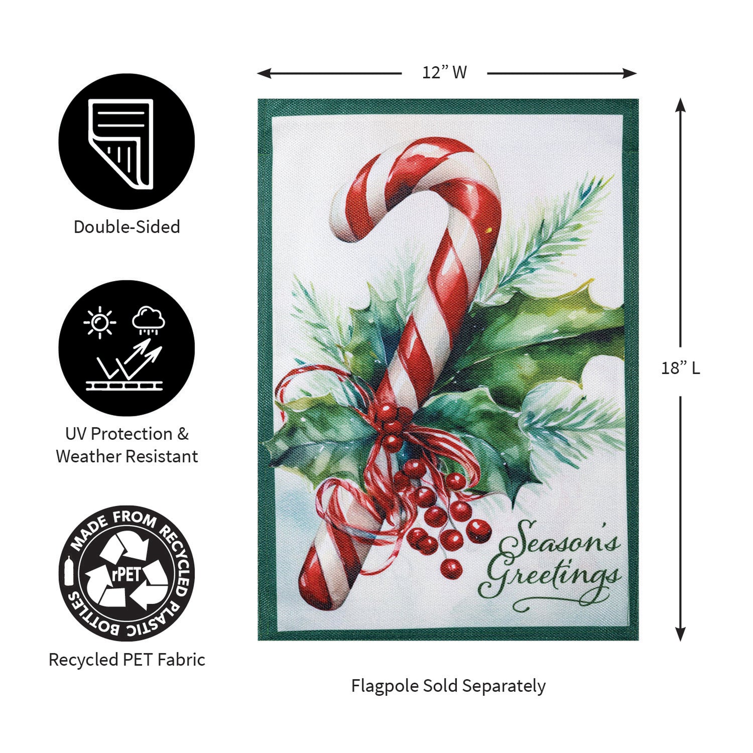 Add magic and wonder to any garden or yard when you hang up this beautiful flag. Featuring a candy cane and holly and berries, this flag is perfect for the festive season. This flag is made of medium-weight, soft burlap fabric that's made from recycled plastic that has the look and feel of real burlap. Artwork is heat transferred onto both sides of the textured fabric to create a natural, crafted look. The flag is durable and weatherproof and will not fade or fray after continued display. This flag features a sleeve for use with any standard flagpole or stand, sold separately.