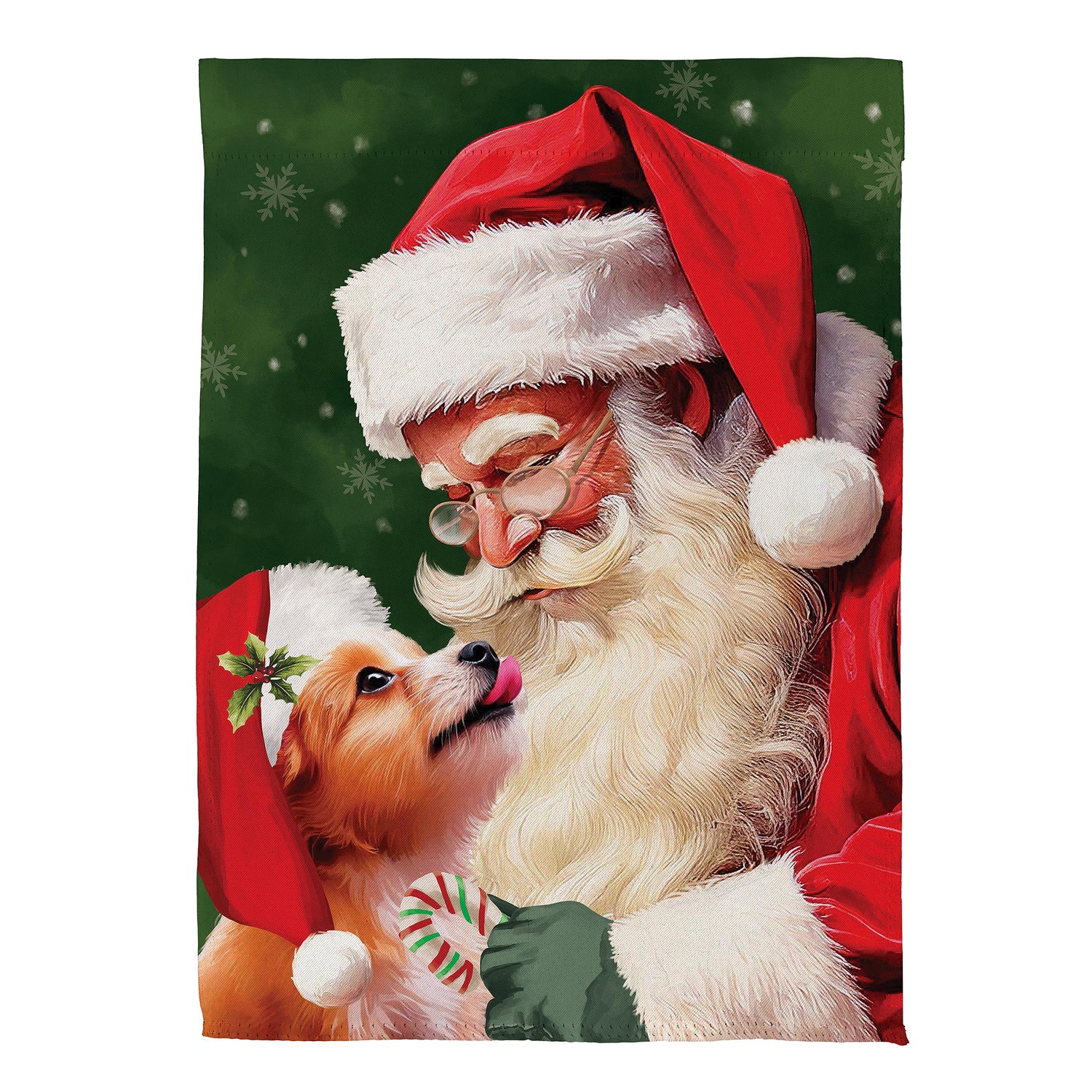 Add magic and wonder to any garden or yard when you hang up this beautiful flag. Featuring an adorable depiction of Santa Claus with a puppy, this flag is perfect for the festive season. Flag is crafted of medium-weight suede fabric made from recycled plastic that provides a soft and durable texture. Artwork is heat transferred onto the sun-blocking material so that it is easily viewed from both sides. The weatherproof flag will not fray or fade with continued outdoor use. This flag features a sleeve for use with any standard flagpole or stand, sold separately.