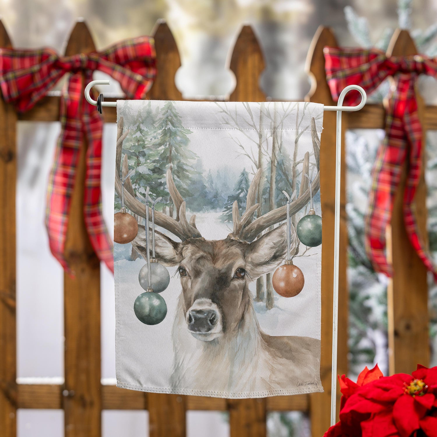 Add magic and wonder to any garden or yard when you hang up this beautiful flag. Featuring a darling deer with ornaments hanging from its antlers, this flag is perfect for the festive season. Flag is crafted of medium-weight suede fabric made from recycled plastic that provides a soft and durable texture. Artwork is heat transferred onto the sun-blocking material so that it is easily viewed from both sides. The weatherproof flag will not fray or fade with continued outdoor use. This flag features a sleeve for use with any standard flagpole or stand, sold separately.