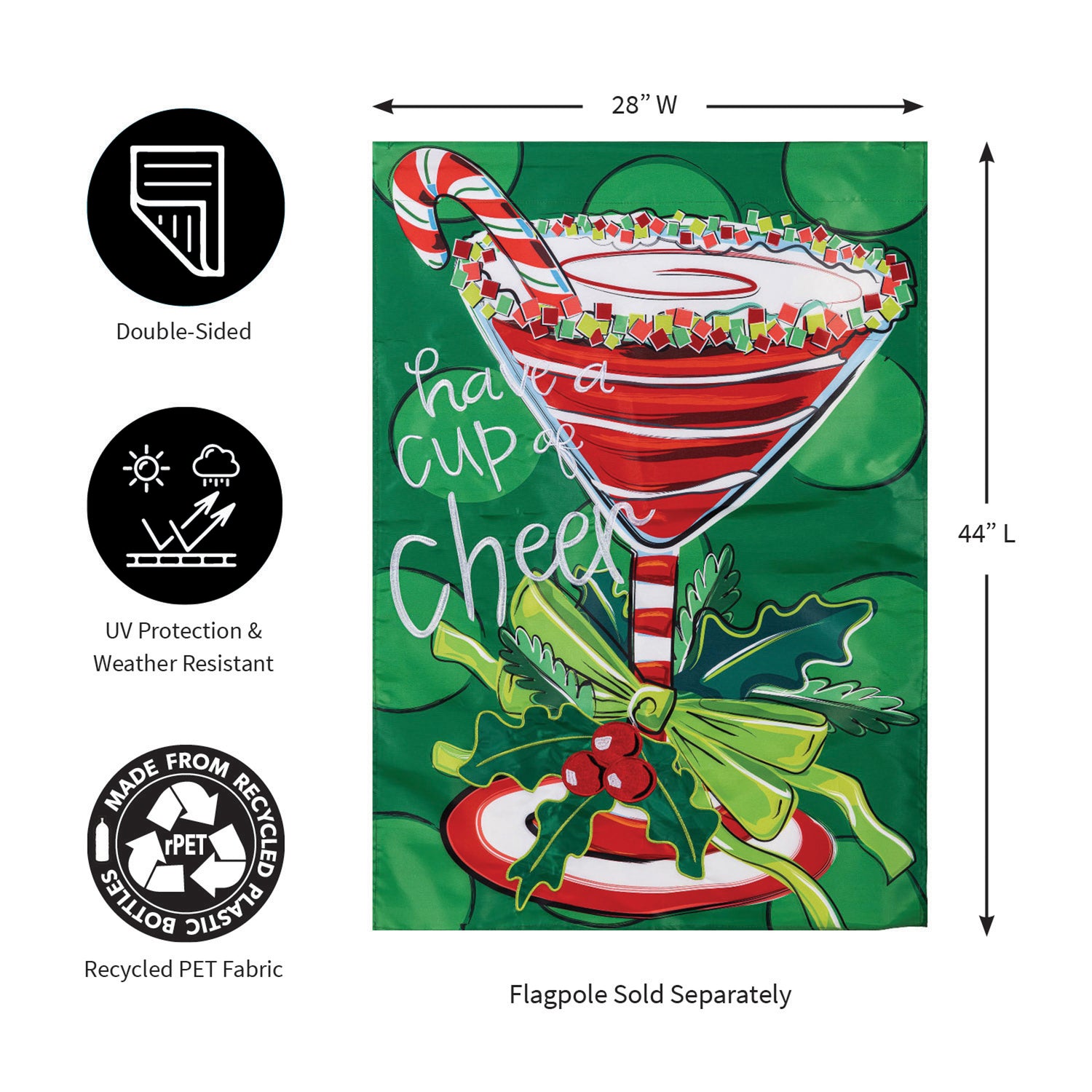 Add magic and wonder to any garden or yard when you hang up this beautiful flag. Featuring a holiday themed design, this flag is perfect for the festive season. Each Evergreen applique flag is carefully crafted from multiple layers of 310 denier nylon made from recycled plastic that can withstand a variety of weather conditions. We combine pieces of fade-resistant, strong fabric with tight, detailed stitching to create a dimensional mosaic effect. The soft yet heavyweight material illuminates beautifully in sunlight. Each flag features a sleeve that fits standard flagpoles or stands, sold separately. Due to the nature of the packaging, wrinkling may have occurred. Once item is unfolded and mounted on hardware, the creases will naturally fall out. Spot clean only. Never put in a dryer. When not in use, flags can be hung in a closet or placed in a storage container.