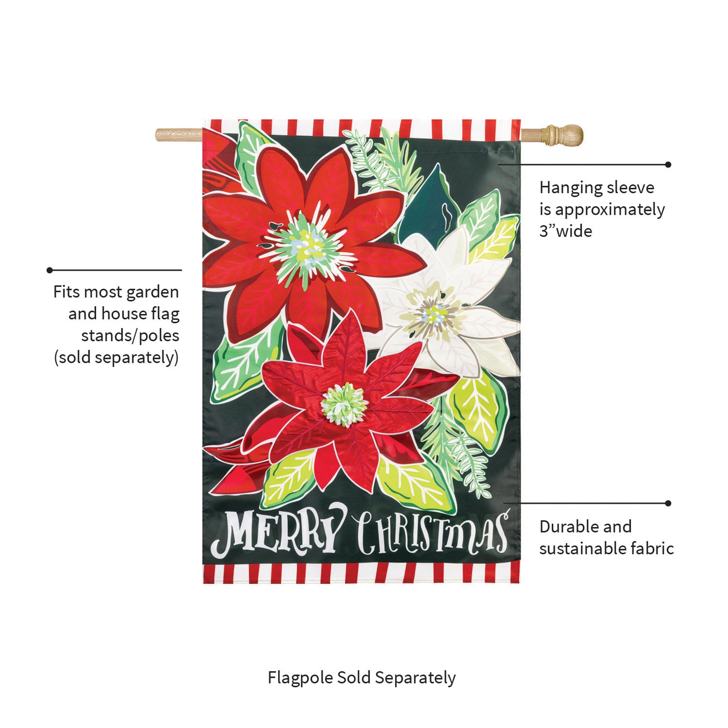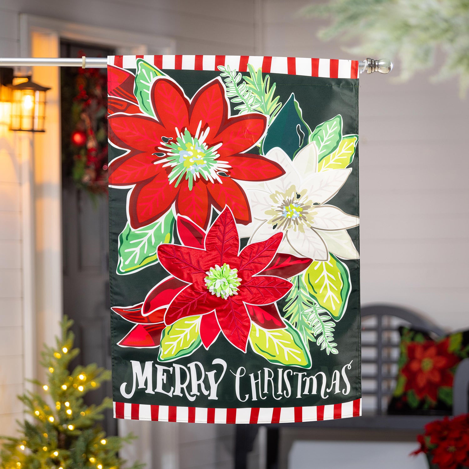 Add magic and wonder to any garden or yard when you hang up this beautiful flag. Featuring a festive design that’s perfect for the holiday season, this flag is perfect for the festive season. Each Evergreen applique flag is carefully crafted from multiple layers of 310 denier nylon made from recycled plastic that can withstand a variety of weather conditions. We combine pieces of fade-resistant, strong fabric with tight, detailed stitching to create a dimensional mosaic effect. The soft yet heavyweight material illuminates beautifully in sunlight. Each flag features a sleeve that fits standard flagpoles or stands, sold separately. Due to the nature of the packaging, wrinkling may have occurred. Once item is unfolded and mounted on hardware, the creases will naturally fall out. Spot clean only. Never put in a dryer. When not in use, flags can be hung in a closet or placed in a storage container.