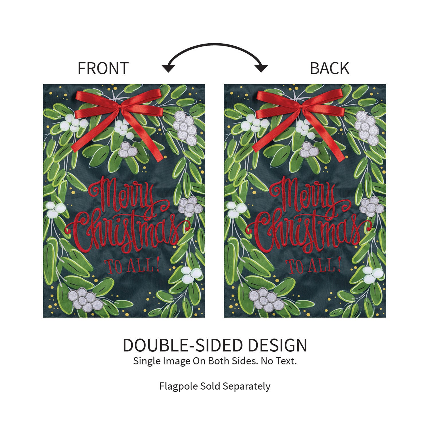 Add magic and wonder to any garden or yard when you hang up this beautiful flag. Featuring a stunning wreath and heartwarming message, this flag is perfect for the festive season. Each Evergreen applique flag is carefully crafted from multiple layers of 310 denier nylon made from recycled plastic that can withstand a variety of weather conditions. We combine pieces of fade-resistant, strong fabric with tight, detailed stitching to create a dimensional mosaic effect. The soft yet heavyweight material illuminates beautifully in sunlight. Each flag features a sleeve that fits standard flagpoles or stands, sold separately. Due to the nature of the packaging, wrinkling may have occurred. Once item is unfolded and mounted on hardware, the creases will naturally fall out. Spot clean only. Never put in a dryer. When not in use, flags can be hung in a closet or placed in a storage container.