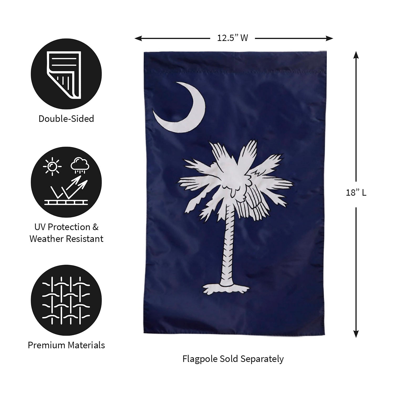 Show your pride for the state of South Carolina with this official state flag featuring the classic crescent moon and palm tree in complementing navy and white. This applique flag is made of durable 310 denier nylon to ensure the design will withstand all types of weather. The applique process combines pieces of fade resistant fabric with tight, detailed stitching to create a mosaic effect. The soft, yet heavy-weight material illuminates in the sunlight, making any of our applique flags a wonderful addition to your home or garden. All flags also feature an insertion sleeve at top for use with any standard flagpole or stand, sold separately.