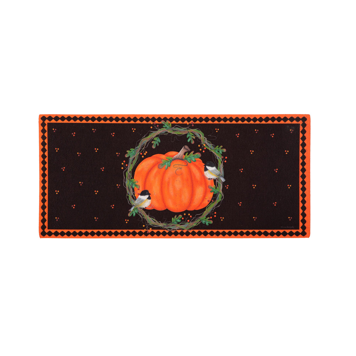 Say hello to fall with this sassafras switch mat. This mat features a giant pumpkin surrounded by a wreath made of branches and leaves. A Welcome message invites guests into the home. Part of our bestselling Sassafras Mat collection, this mat insert is crafted from durable material with a rubber backing and is designed to fit neatly within any of our Sassafras bases and trays. Designs are sublimated onto the outdoor-safe material using fade resistant inks. Perfect for indoor or outdoor use, these versatile Sassafras mats successfully trap dirt while making a stylish statement.