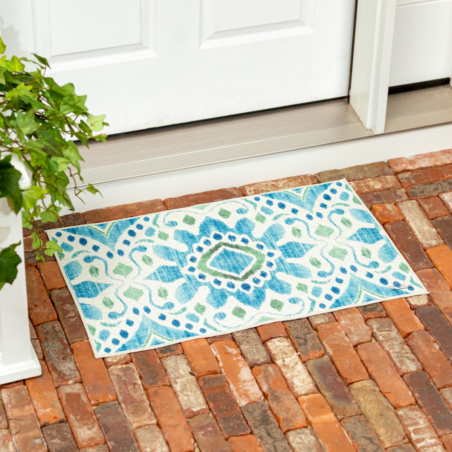 Give guests a warm welcome with this beautiful indoor/outdoor mat. It features a stunning geometric design in a blue and green color palette. This eye-catching mat is made from durable materials. Ideal for high traffic areas, it traps dirt and debris to prevent messes from being tracked into homes. It’s weatherproof so it’s perfect for use indoors or outdoors.