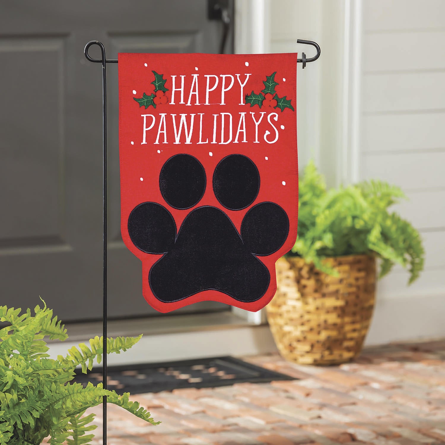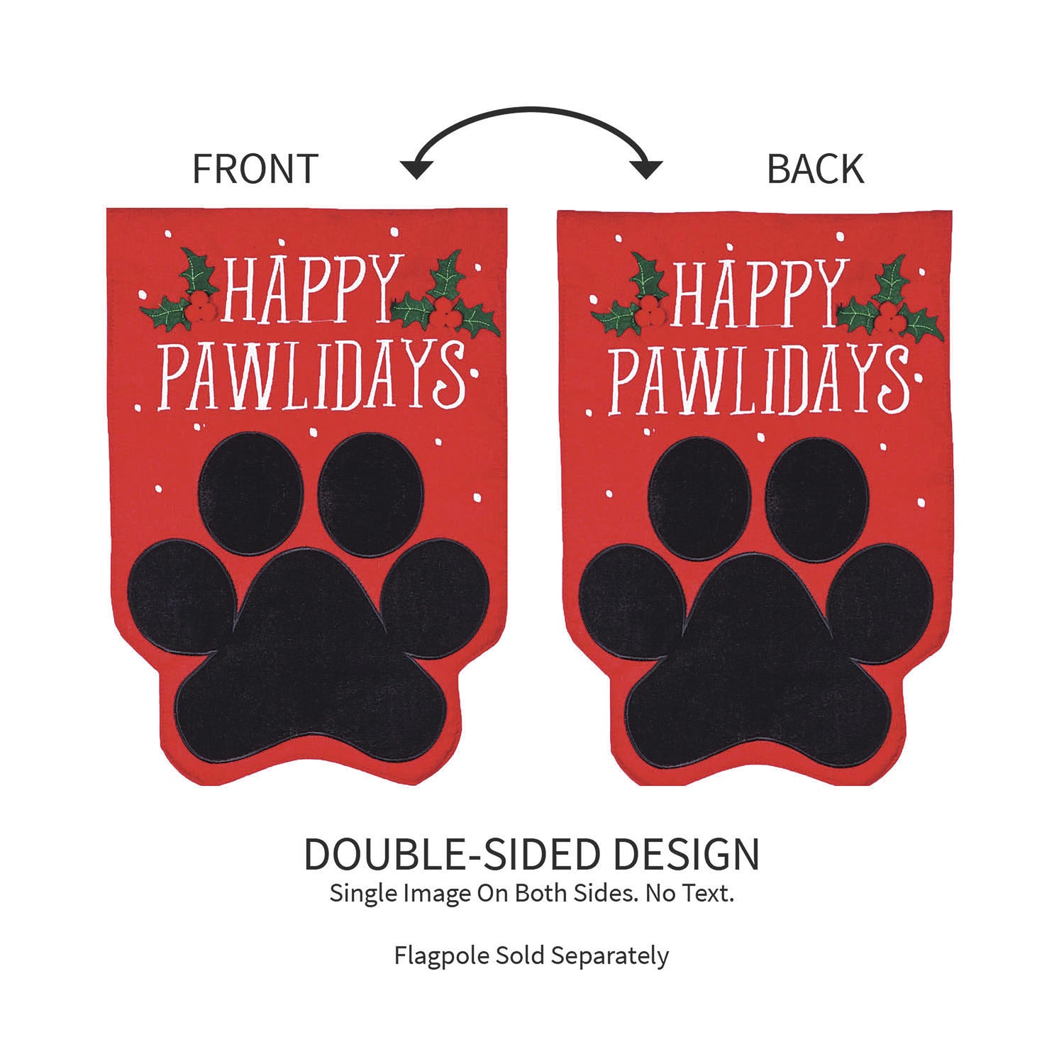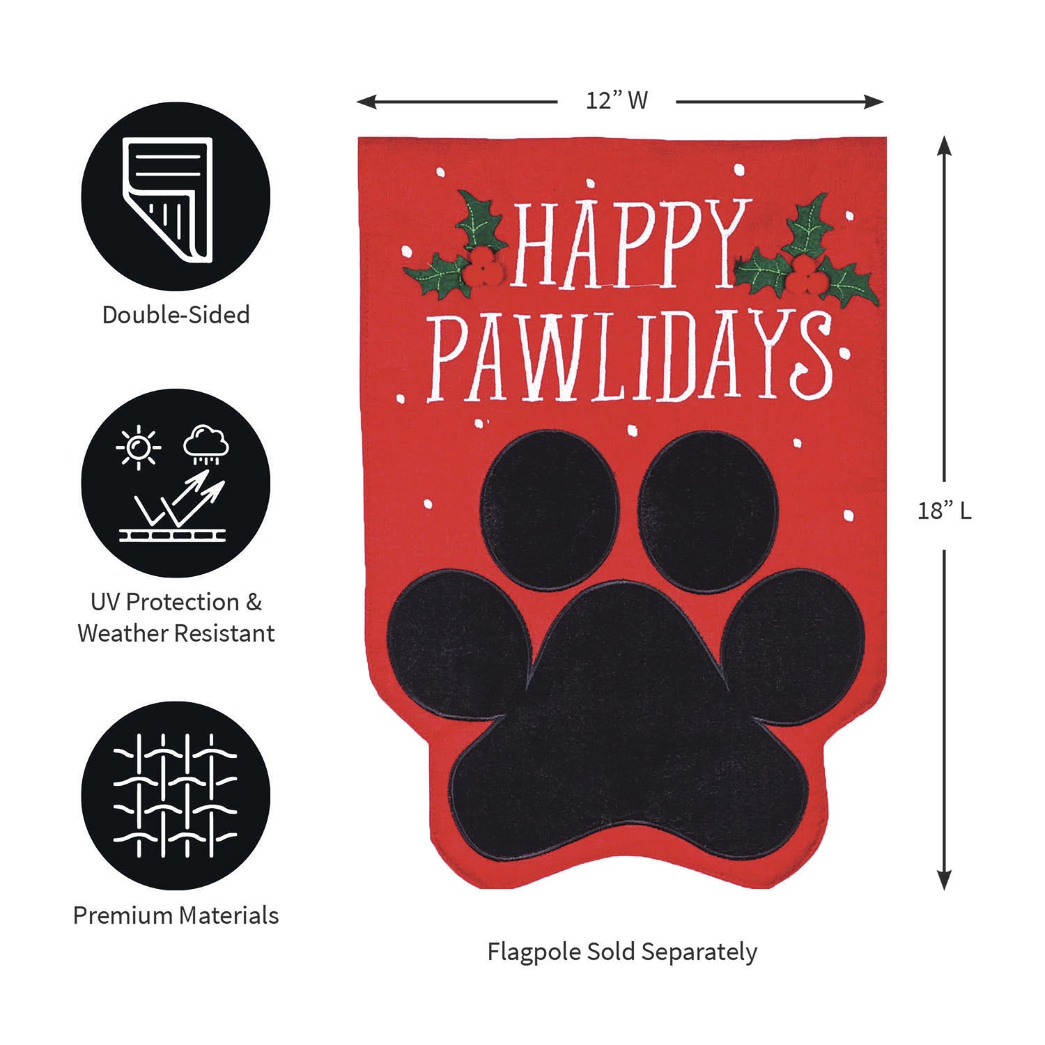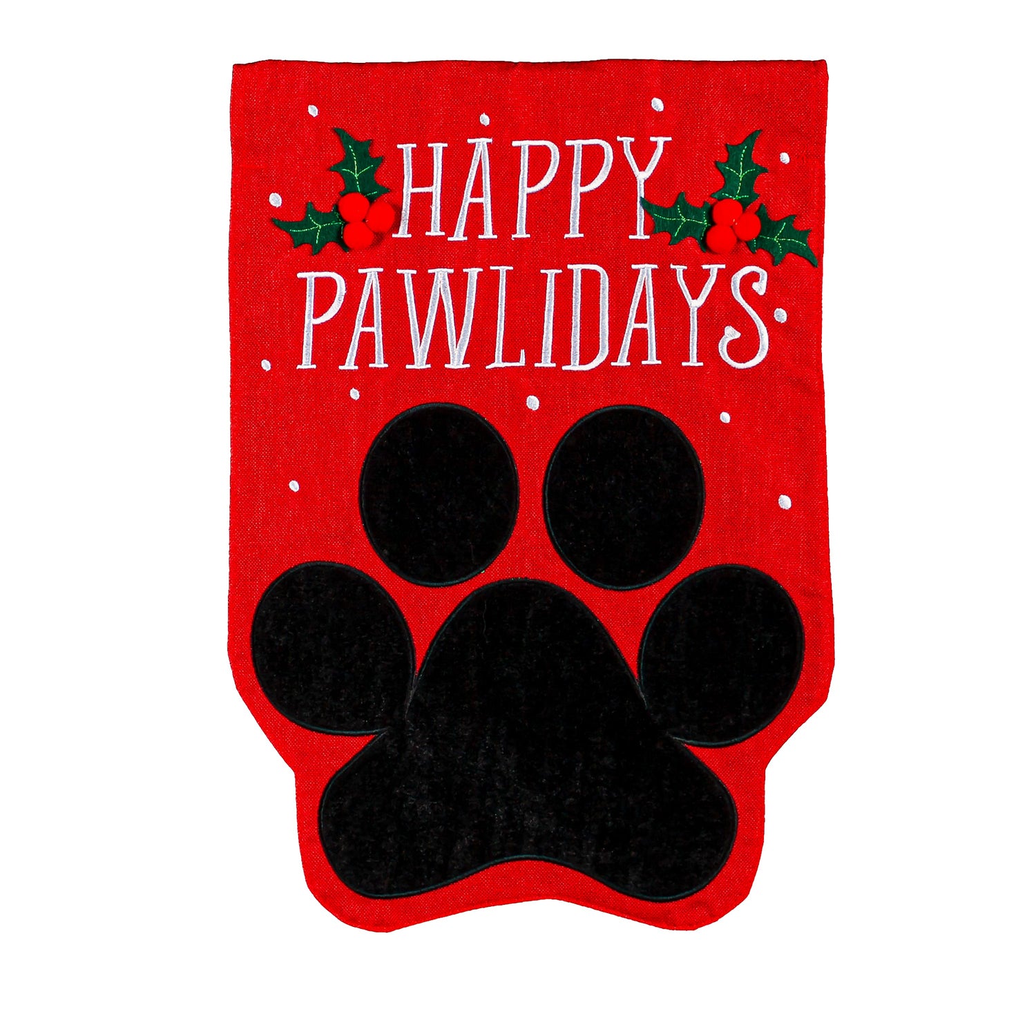 If you're a pet-loving person with an affinity for Christmas, this "Happy Pawlidays" garden burlap flag is the perfect addition to your holiday décor! Featuring a black paw print and holly leaf accents, this bright red flag will help you celebrate any winter holiday in style. This flag is made of medium-weight, soft polyester burlap fabric that has the look and feel of real burlap. Artwork is heat transferred onto both sides of the textured fabric to create a natural, crafted look. The poly-burlap is a durable and weatherproof material that will not fade or fray after continued display. This flag features a sleeve for use with any standard flagpole or stand, sold separately.