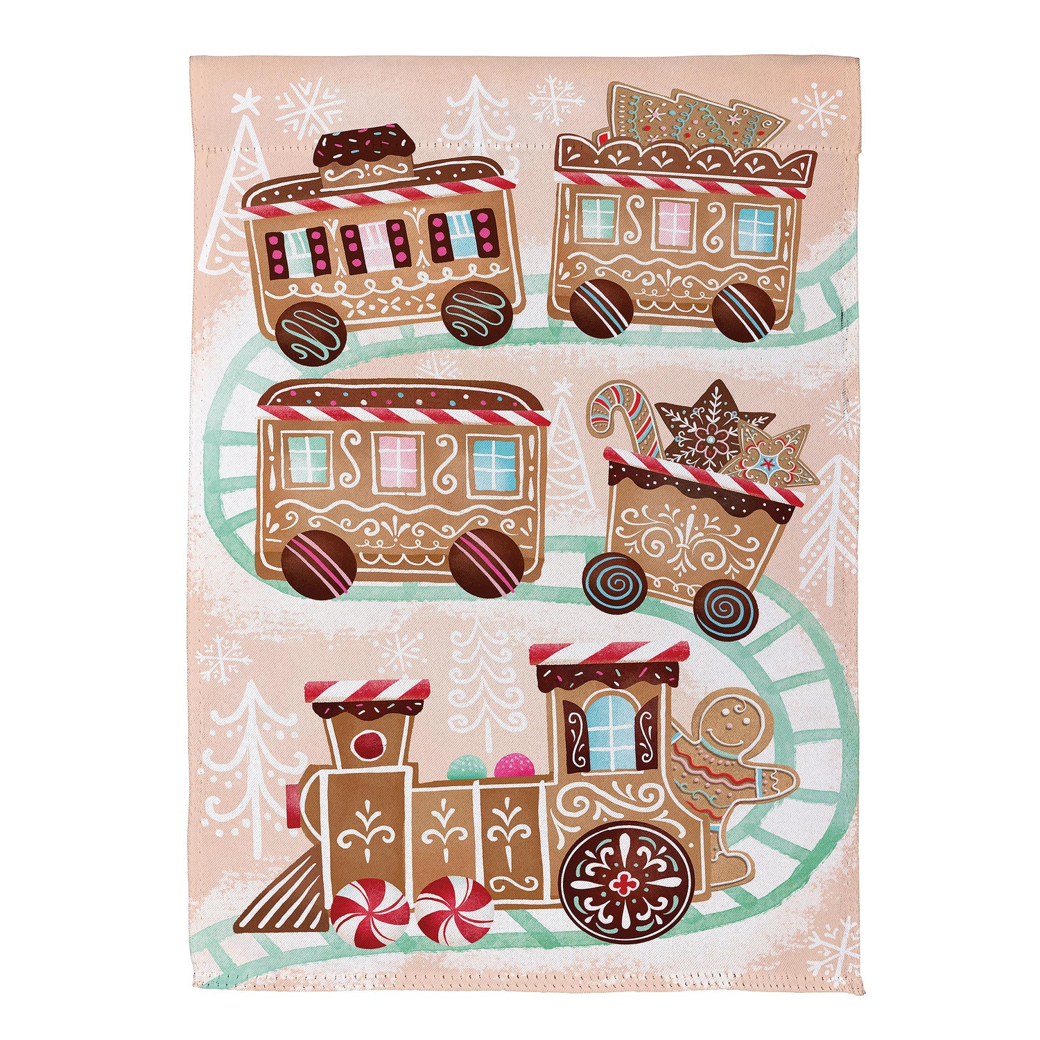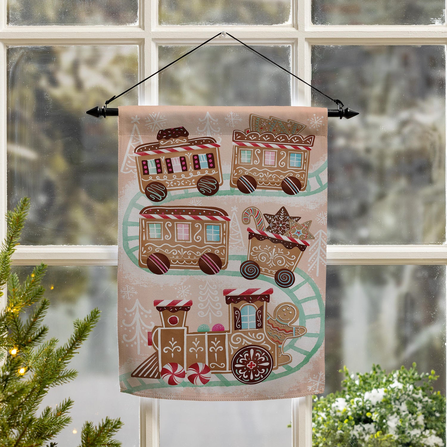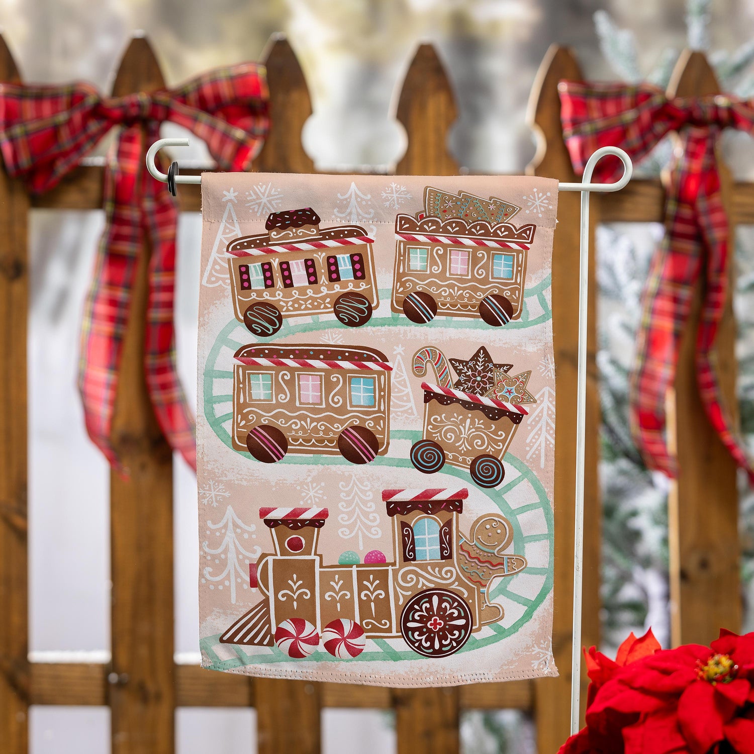 Add magic and wonder to any garden or yard when you hang up this beautiful flag. Featuring a precious gingerbread train decorated with candy, this flag is perfect for the festive season. Flag is crafted of medium-weight suede fabric made from recycled plastic that provides a soft and durable texture. Artwork is heat transferred onto the sun-blocking material so that it is easily viewed from both sides. The weatherproof flag will not fray or fade with continued outdoor use. This flag features a sleeve for use with any standard flagpole or stand, sold separately.