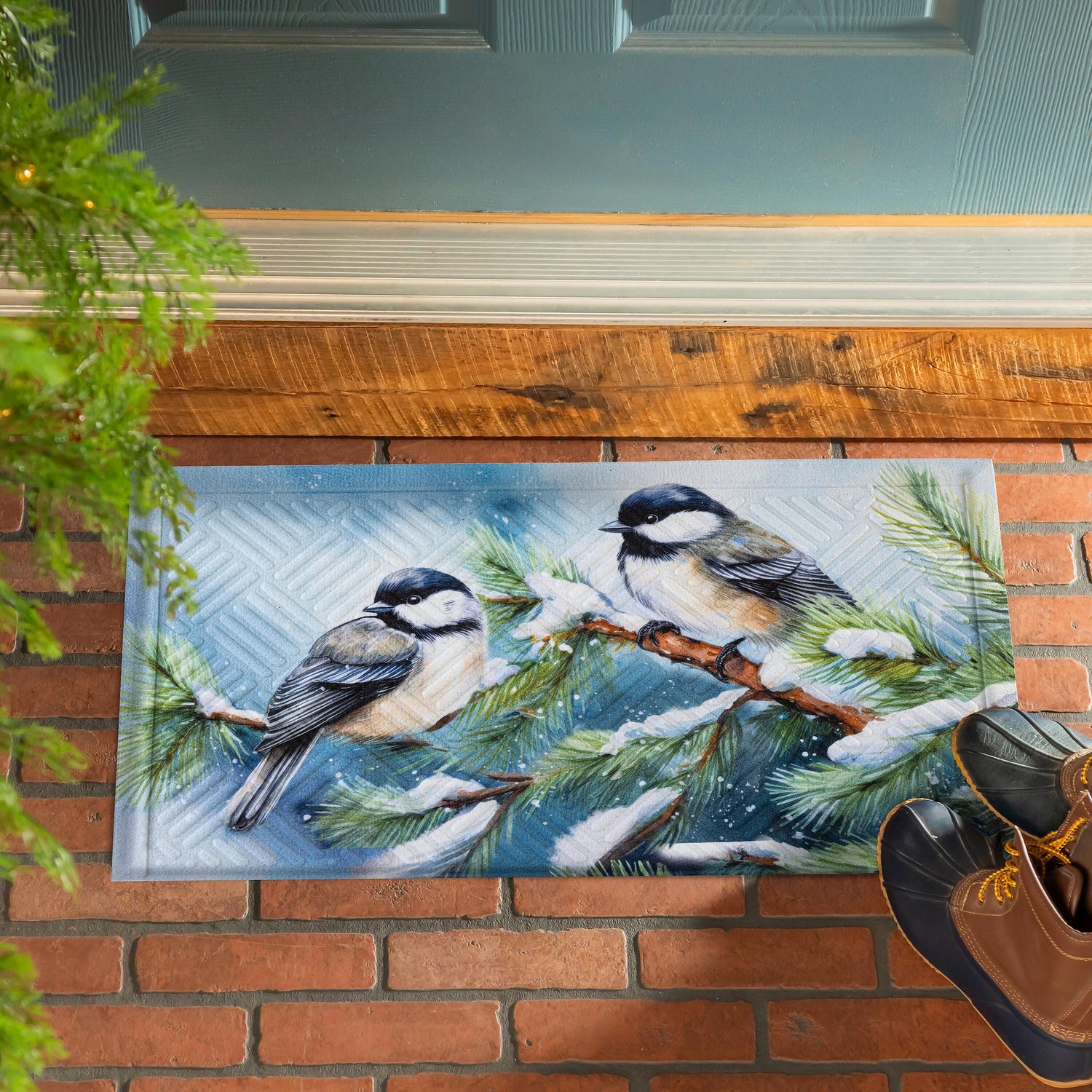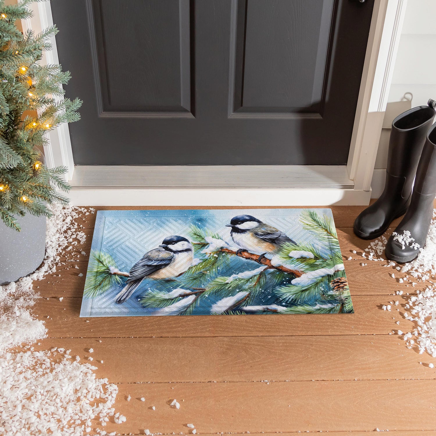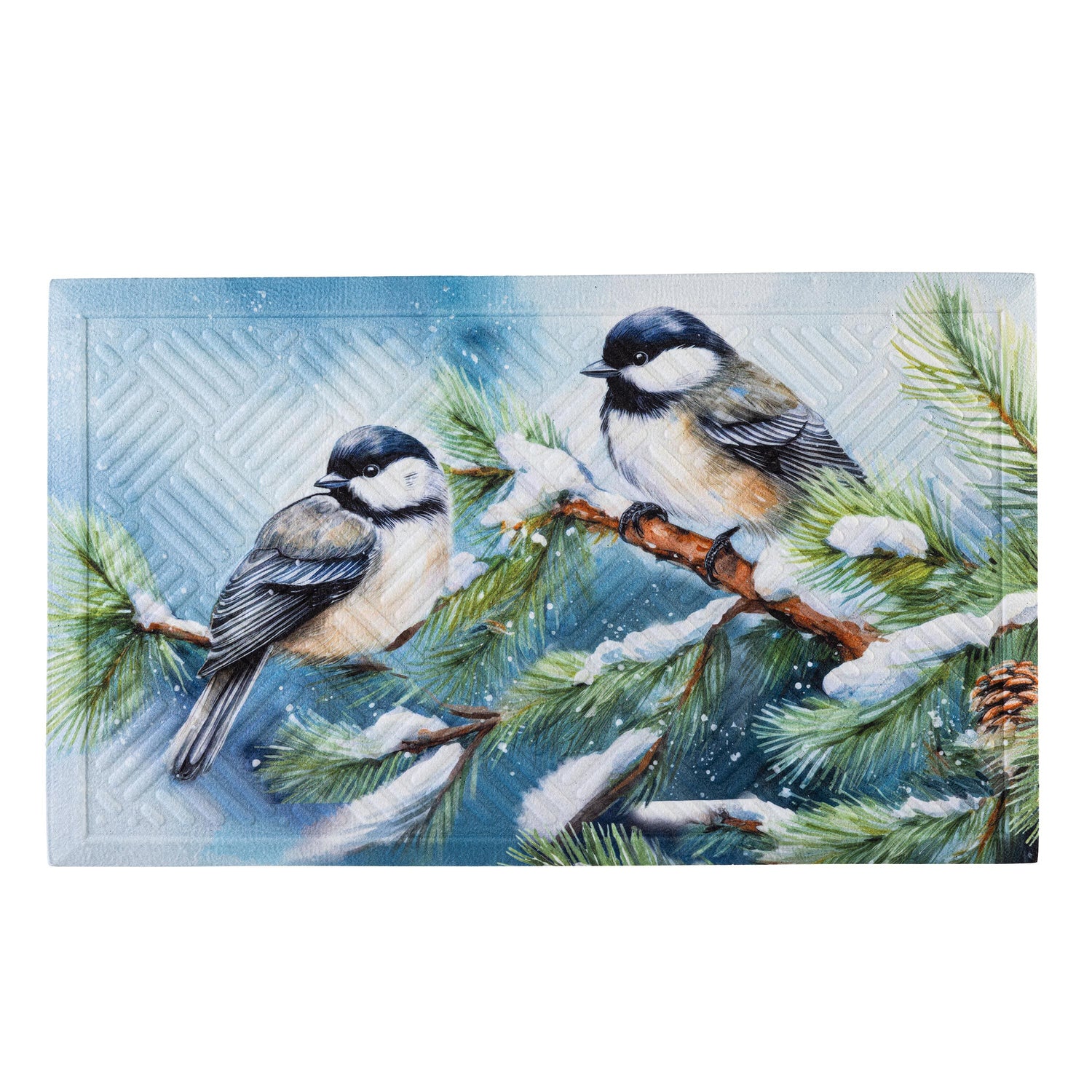Step into winter style with this embossed mat. Perfect for adding an extra charming touch to any entryway, this welcoming design features two adorable chickadees perched on a snowy branch. Evergreen's embossed mats are crafted from outdoor-safe polypropylene and feature a rubber anti-slip backing. The embossed texture makes this mat more effective in trapping dirt, perfect for indoor or outdoor use.