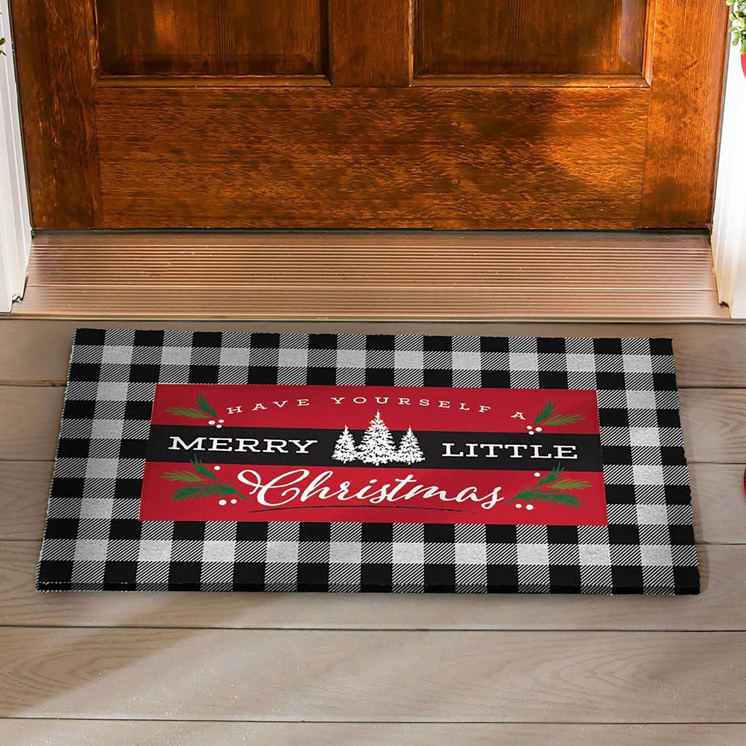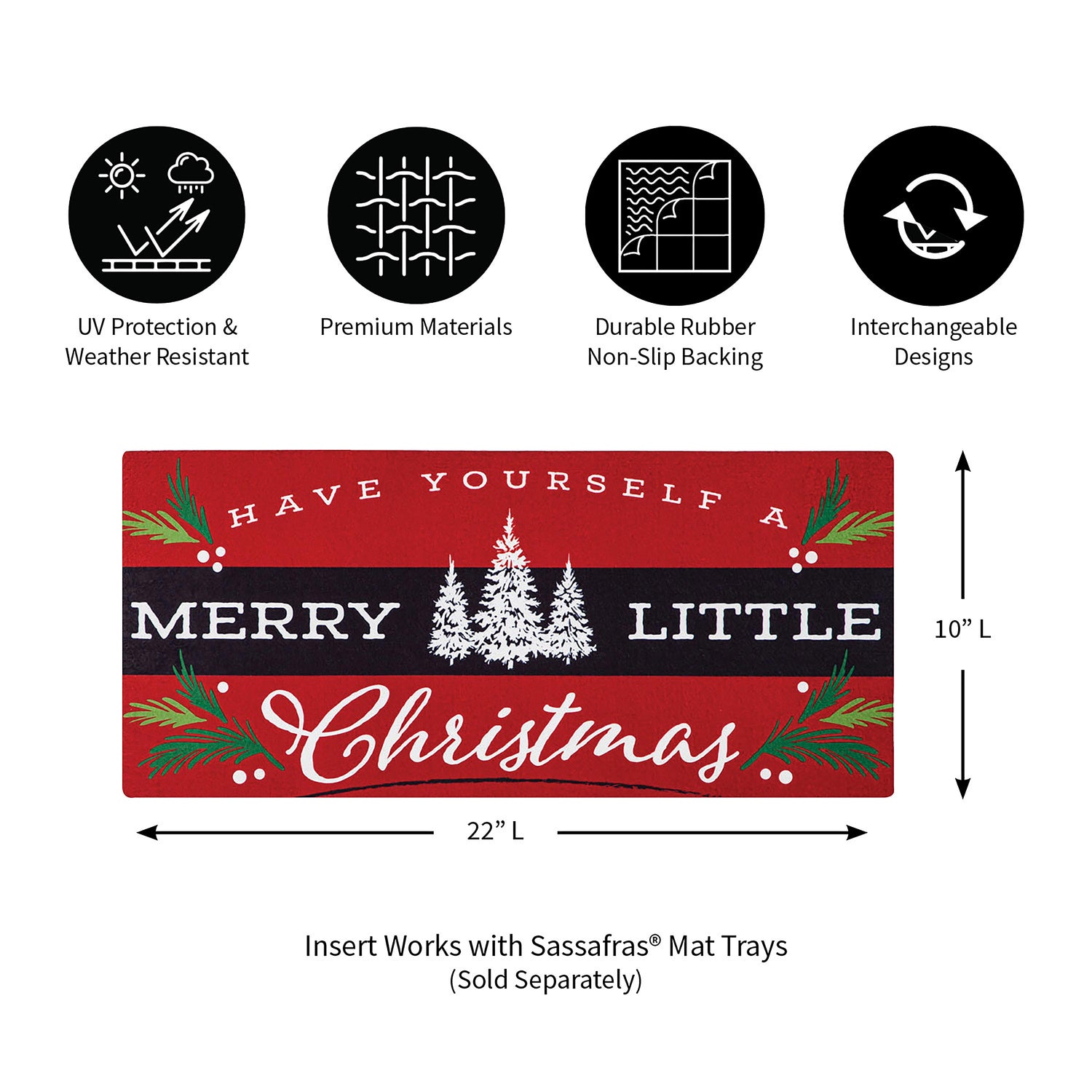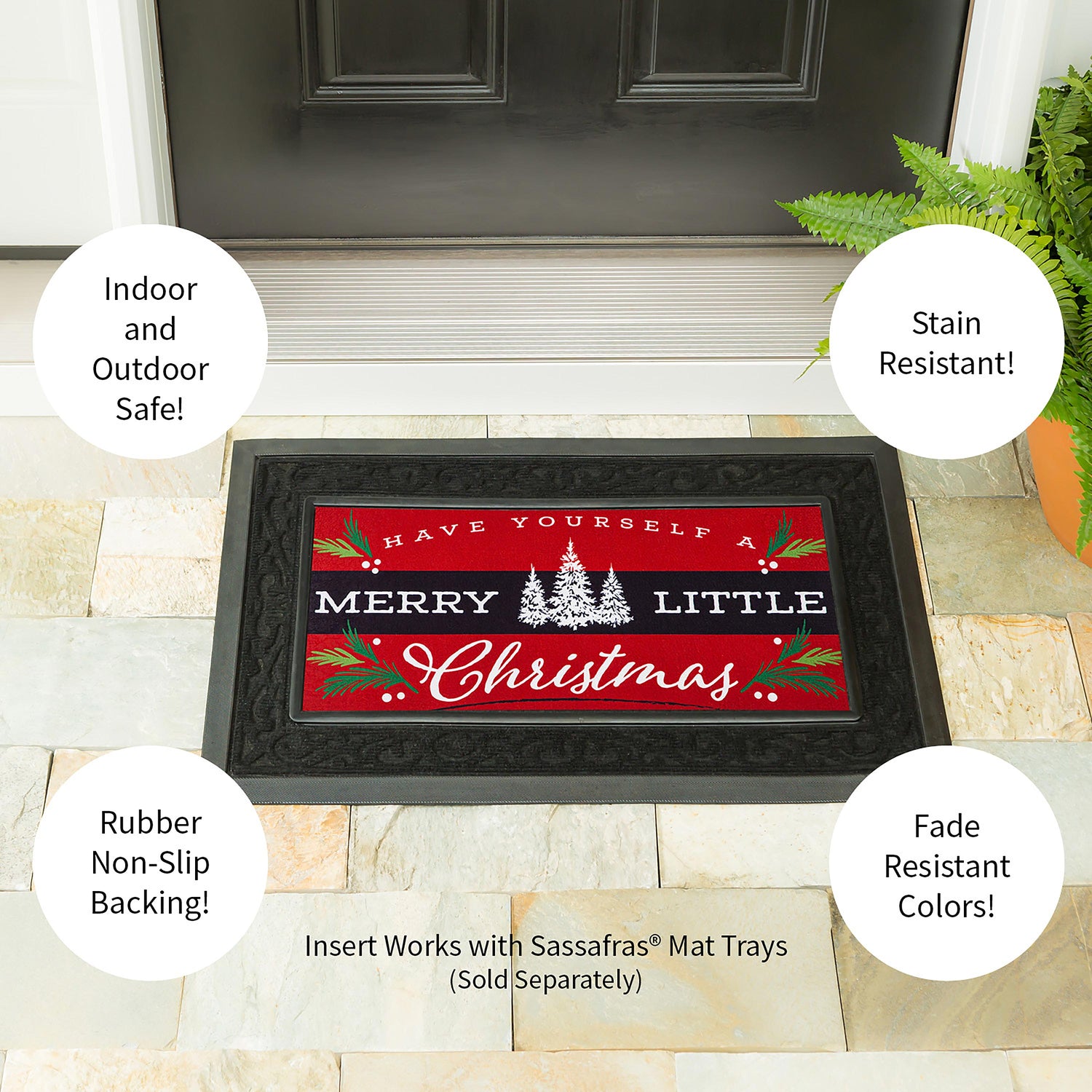 Proudly display this Merry Little Christmas Sassafras Switch Mat during the holiday season. Featuring a "Have Yourself A Merry Little Christmas" message with spruce tree and pine accents, this switch mat is ready to spread seasonal cheer. The durable insert is created for placement in a Sassafras® mat frame or tray, sold separately. Swap mats seasonally to keep things fresh and fun. The charming design is heat sublimated onto the polyester and rubber insert. Suitable for indoor and outdoor use, the floor mat can also be used on its own as a stair tread or small floor mat. It is mildew resistant and features an anti-slip backing. Spot clean with soap and warm water or hose down. For best results, display your mat in a covered or sheltered area to prevent fading.