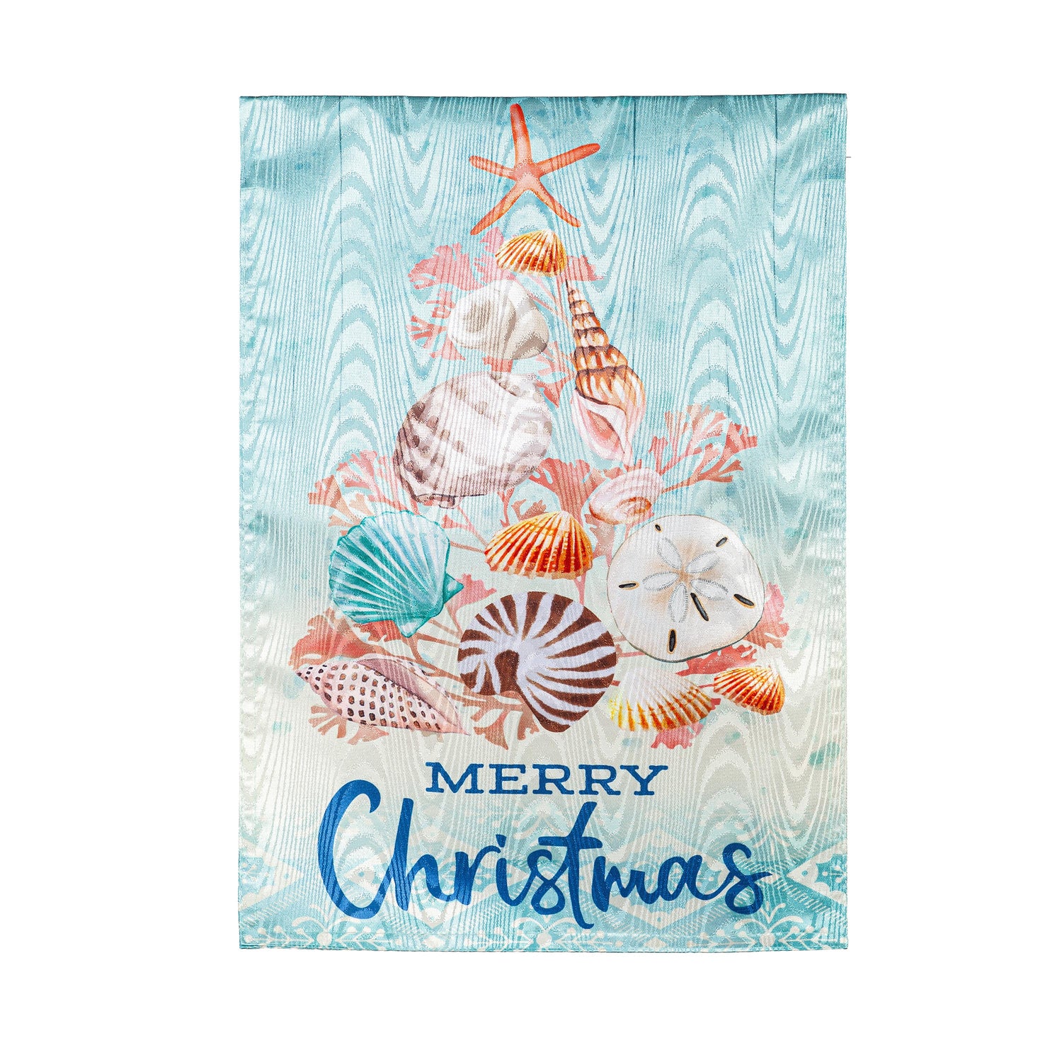 Decorate for the season in tropic style and welcome friends and family to the home with this moire flag. It features colorful seashells shaped like a Christmas tree set against a light blue backdrop. A “Merry Christmas” message greets guests. Evergreen’s Moire flags deliver unmatched shimmer with a beautiful woodgrain effect that enhances each seasonal design. Artwork is heat-transferred onto both sides of the taffeta-like fabric with UV-protected dyes to guarantee vibrancy and durability through all seasons.
