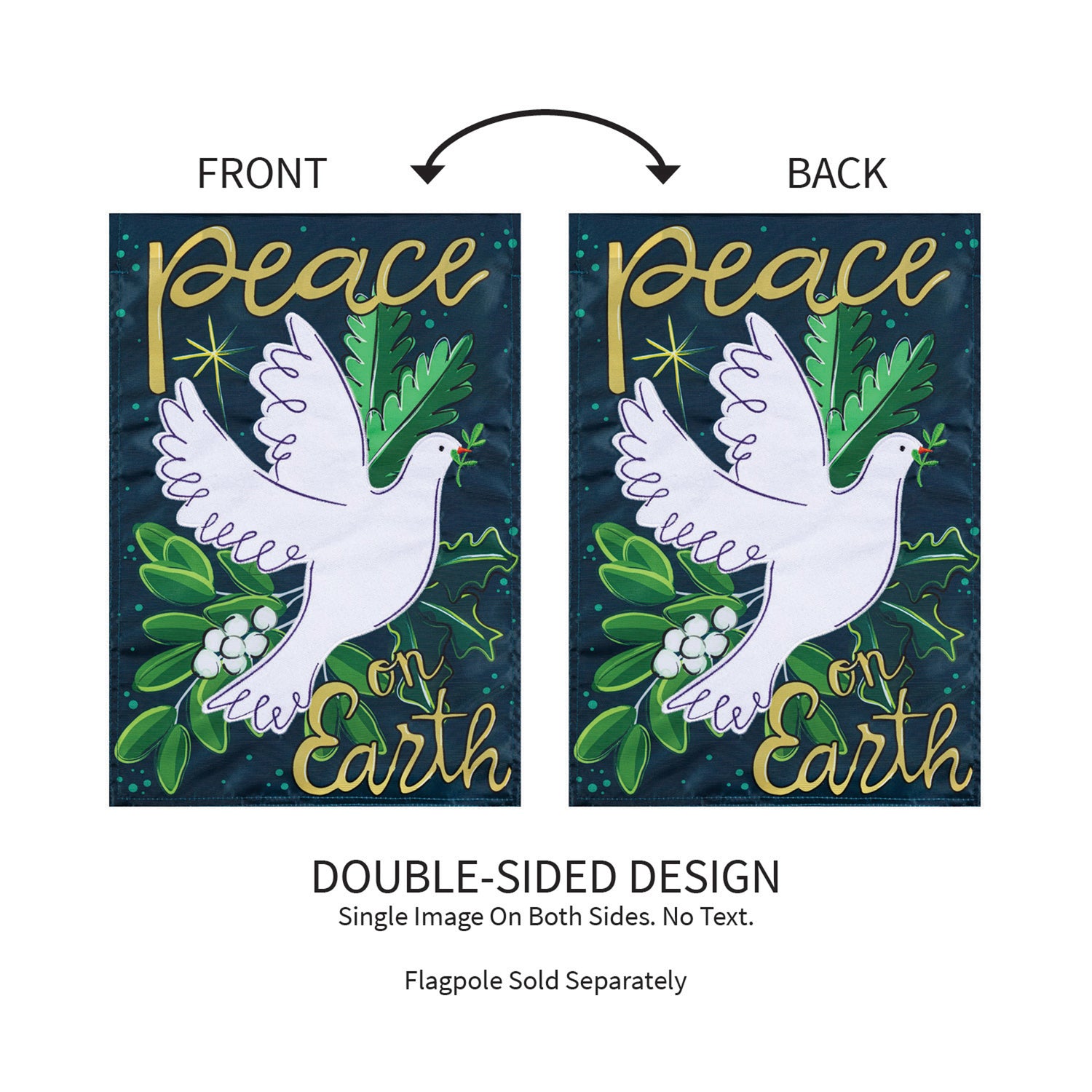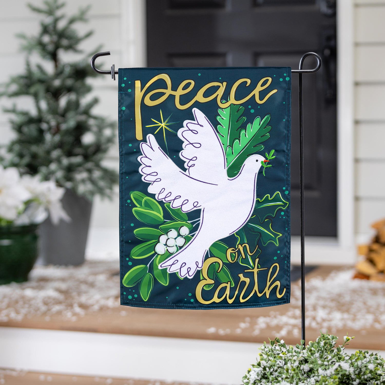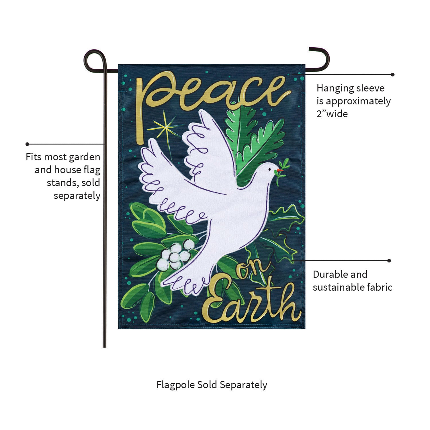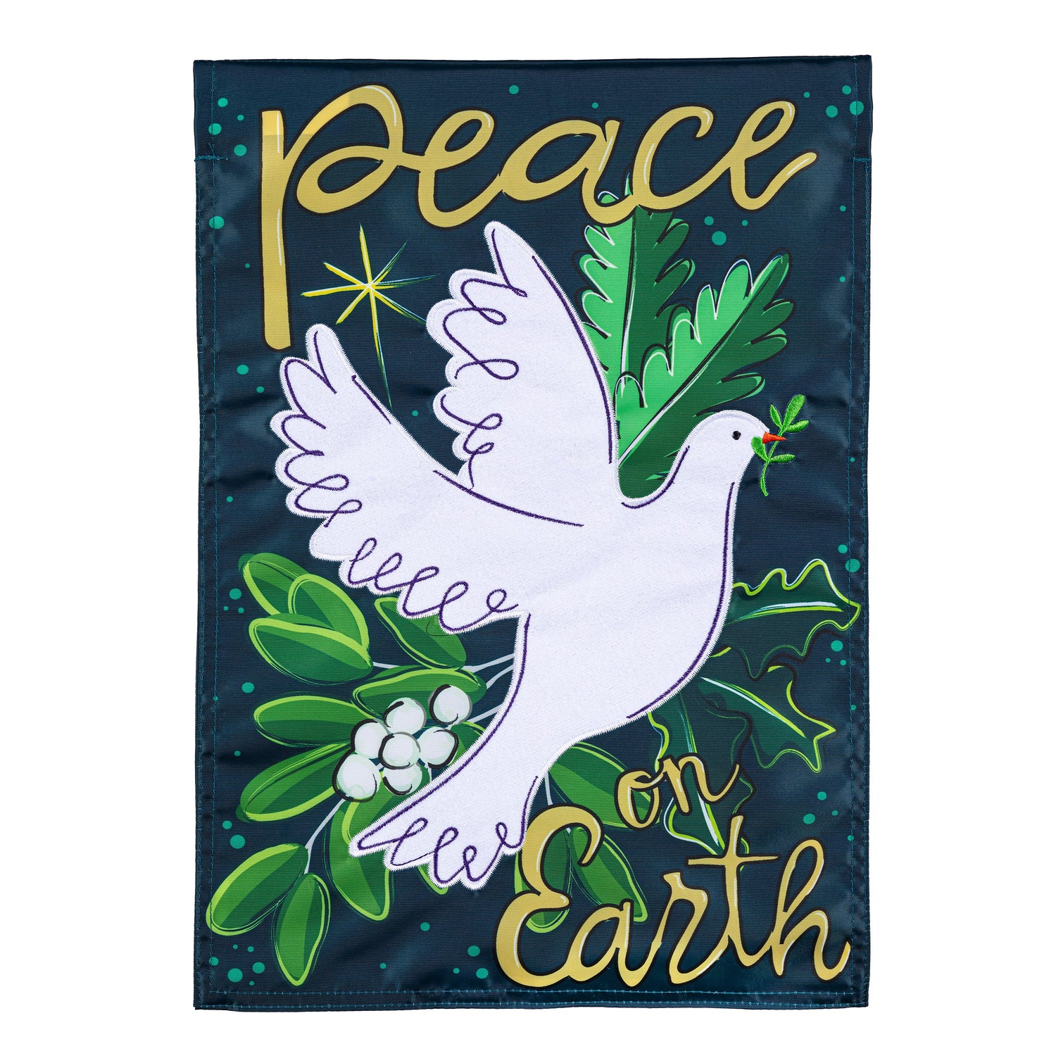 Add magic and wonder to any garden or yard when you hang up this beautiful flag. Featuring a darling dove with a heartwarming message, this flag is perfect for the festive season. Each Evergreen applique flag is carefully crafted from multiple layers of 310 denier nylon made from recycled plastic that can withstand a variety of weather conditions. We combine pieces of fade-resistant, strong fabric with tight, detailed stitching to create a dimensional mosaic effect. The soft yet heavyweight material illuminates beautifully in sunlight. Each flag features a sleeve that fits standard flagpoles or stands, sold separately. Due to the nature of the packaging, wrinkling may have occurred. Once item is unfolded and mounted on hardware, the creases will naturally fall out. Spot clean only. Never put in a dryer. When not in use, flags can be hung in a closet or placed in a storage container.