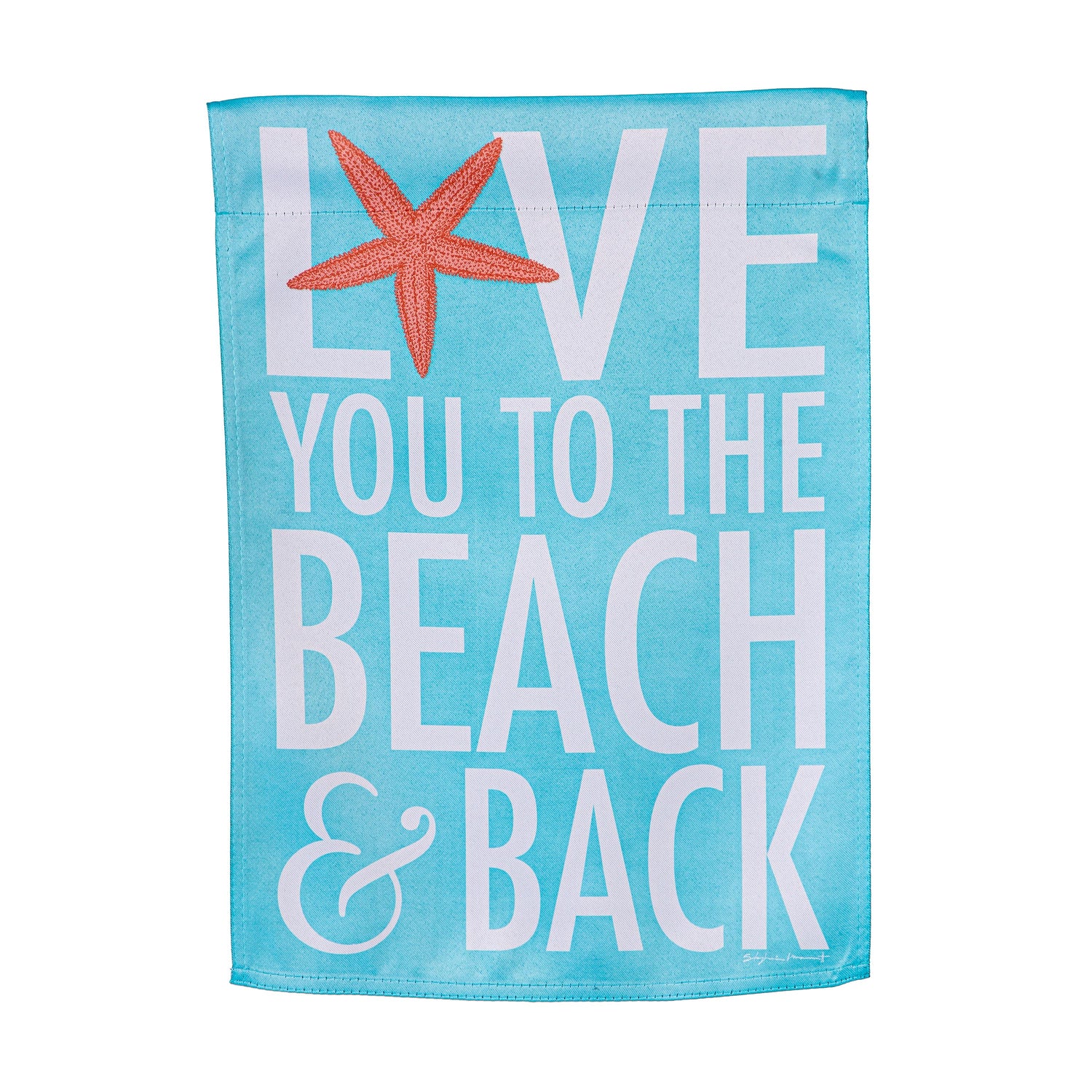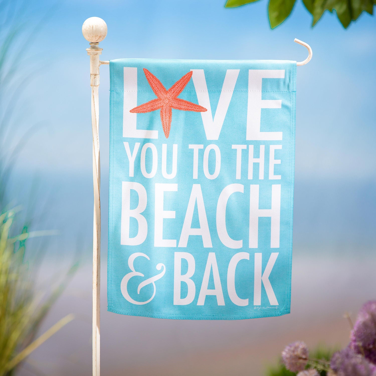 This charming flag adds an extra special touch to any home. Features lively colors and attractive Love To The Beach design. Flag is crafted of medium-weight suede fabric made from recycled plastic that provides a soft and durable texture. Artwork is heat transferred onto the sun-blocking material so that it is easily viewed from both sides. The weatherproof flag will not fray or fade with continued outdoor use. This flag features a sleeve for use with any standard flagpole or stand, sold separately.
