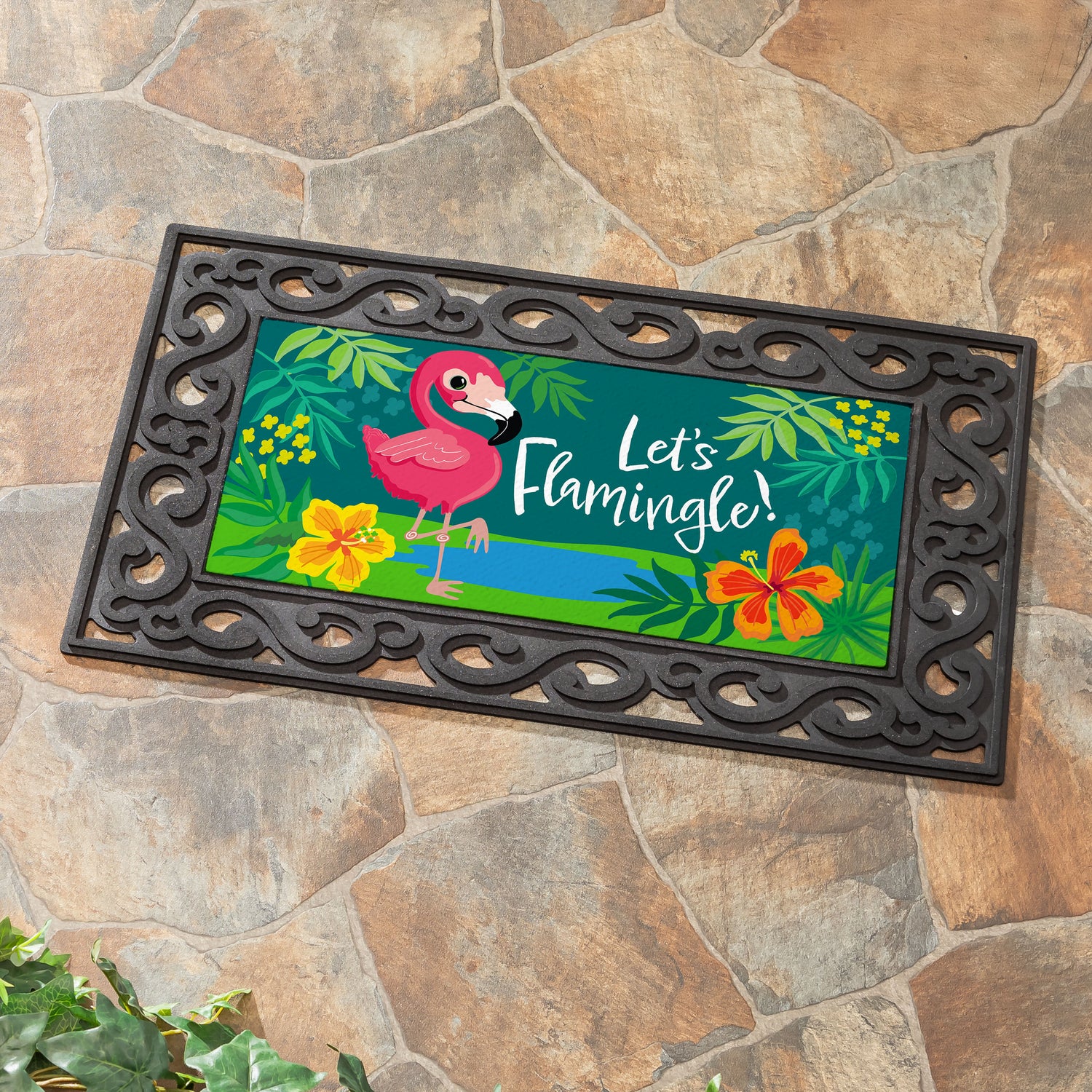 Sweep guests off their feet with our beautifully made Sassafras mats! Made with bright pops of color that are perfect for the season, this mat will put pep in anyone's step. Crafted from heat-sublimated polyester with a rubber backing, this versatile mat is designed to fit perfectly within Evergreen's switch doormat bases. The mildew resistant mat is ideal for indoor or outdoor use and features a skid-resistant backing to help keep it in place. This welcoming mat will freshen up your stoop season after season while ensuring your home stays debris-free. For stains, simply spot clean with soap and warm water.