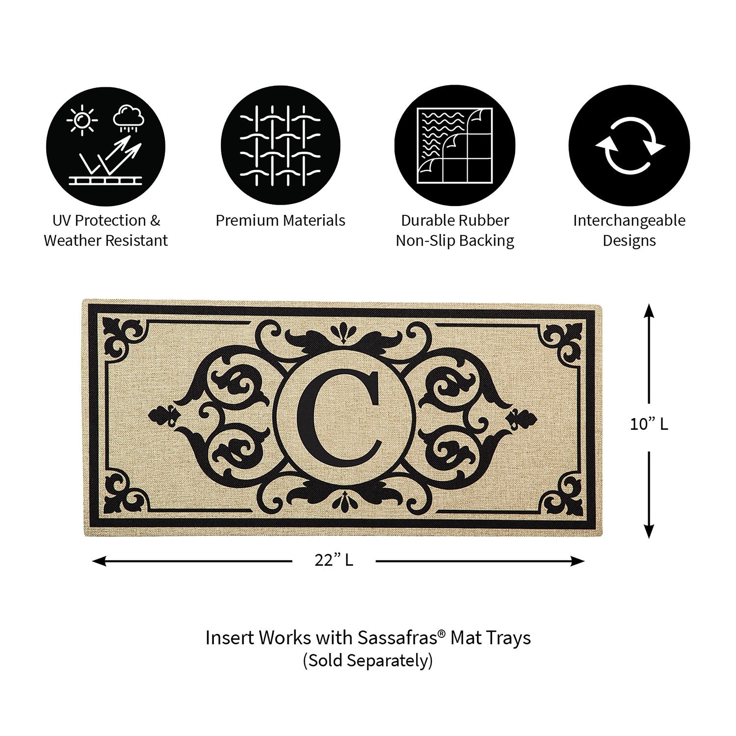 This Cambridge Monogram Burlap Sassafras Switch Mat, Letter C will make a sweet statement wherever it's displayed. The durable insert is created for placement in a Sassafras® mat frame or tray, sold separately. Swap mats seasonally to keep things fresh and fun. The charming design is heat sublimated onto the polyester and rubber insert. Suitable for indoor and outdoor use, the floor mat can also be used on its own as a stair tread or small floor mat. It is mildew resistant and features an anti-slip backing. Spot clean with soap and warm water or hose down. For best results, display your mat in a covered or sheltered area to prevent fading.