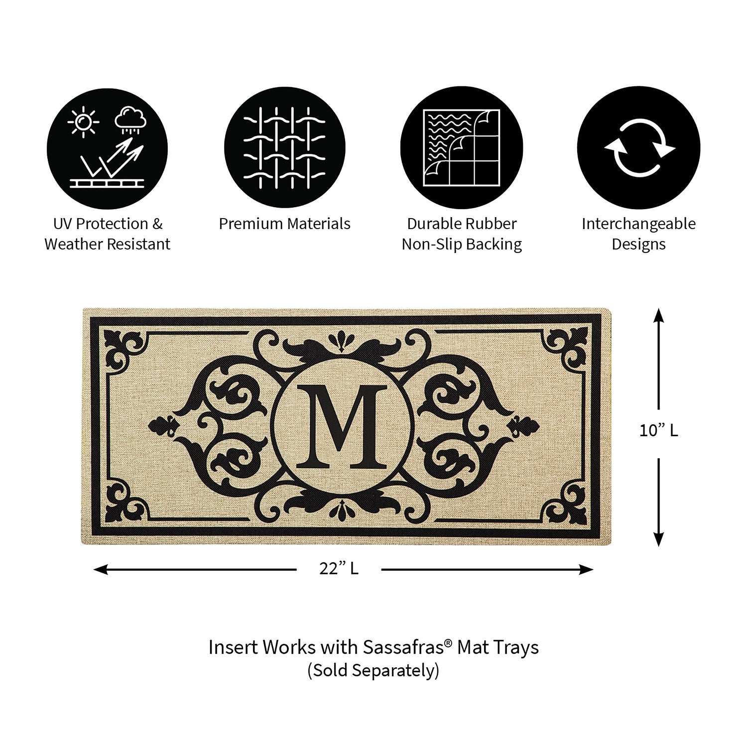 This Cambridge Monogram Burlap Sassafras Switch Mat, Letter M will make a sweet statement wherever it's displayed. The durable insert is created for placement in a Sassafras® mat frame or tray, sold separately. Swap mats seasonally to keep things fresh and fun. The charming design is heat sublimated onto the polyester and rubber insert. Suitable for indoor and outdoor use, the floor mat can also be used on its own as a stair tread or small floor mat. It is mildew resistant and features an anti-slip backing. Spot clean with soap and warm water or hose down. For best results, display your mat in a covered or sheltered area to prevent fading.