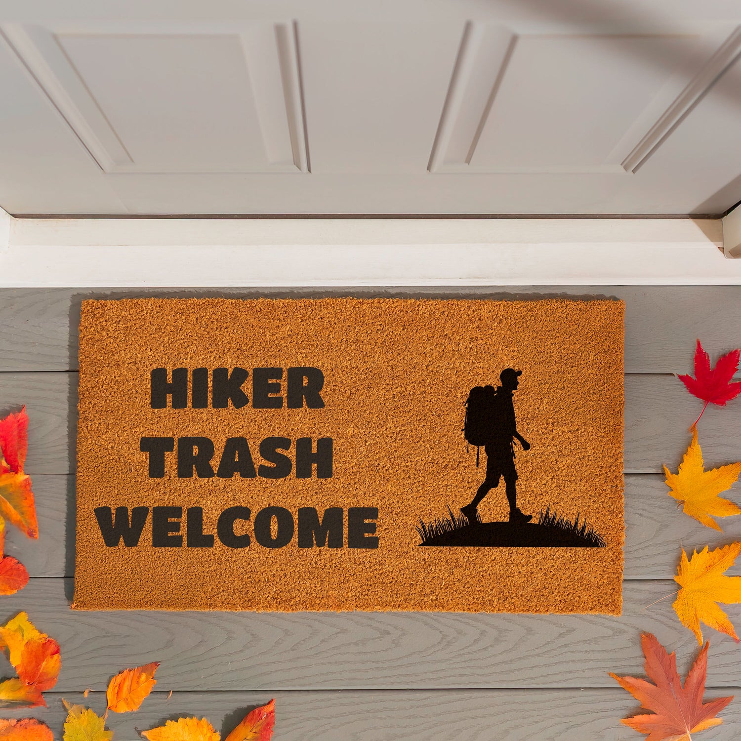 Celebrate trail culture and outdoor adventure with this humorous coir doormat featuring a bold “Hiker Trash Welcome” message. Crafted from heat-sublimated polyester with a rubber backing, this versatile mat is designed to fit perfectly within Evergreen's switch doormat bases. The mildew resistant mat is ideal for indoor or outdoor use and features a skid-resistant backing to help keep it in place. This welcoming mat will freshen up your stoop season after season while ensuring your home stays debris-free. For stains, simply spot clean with soap and warm water.