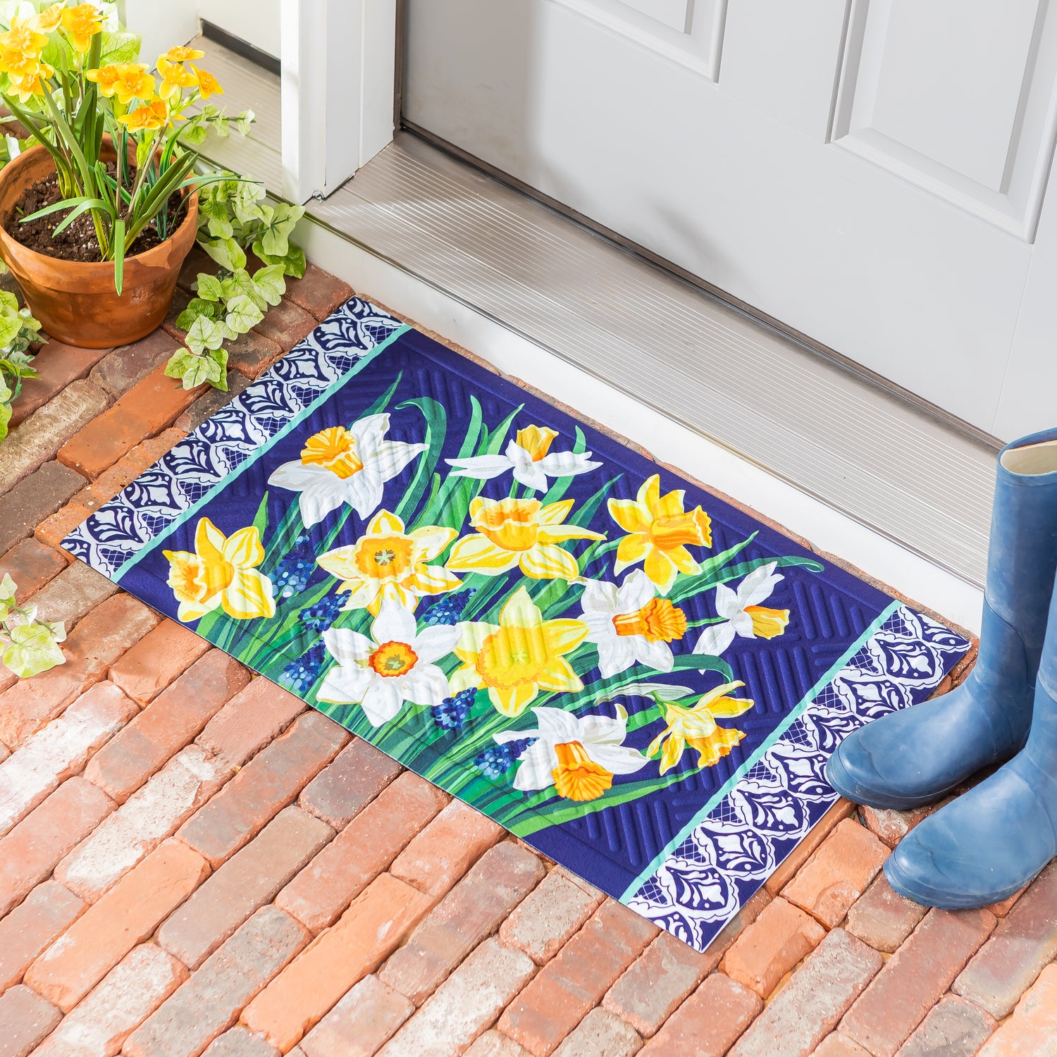 Sweep guests off their feet with our beautifully made embossed mats! Made with bright pops of color that are perfect for the season, this mat will put pep in anyone's step. Evergreen's embossed mats are crafted from outdoor-safe polypropylene and feature a rubber anti-slip backing. The embossed texture makes this mat more effective in trapping dirt, perfect for indoor or outdoor use. Place it in a high-traffic area to keep debris out of the home.