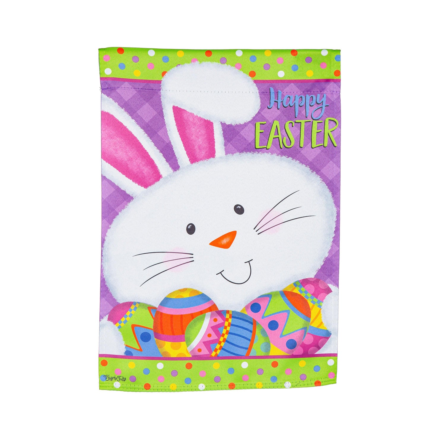 This charming flag adds an extra special touch to any home. Features lively colors and attractive Easter Bunny design. Flag is crafted of medium-weight suede fabric made from recycled plastic that provides a soft and durable texture. Artwork is heat transferred onto the sun-blocking material so that it is easily viewed from both sides. The weatherproof flag will not fray or fade with continued outdoor use. This flag features a sleeve for use with any standard flagpole or stand, sold separately.