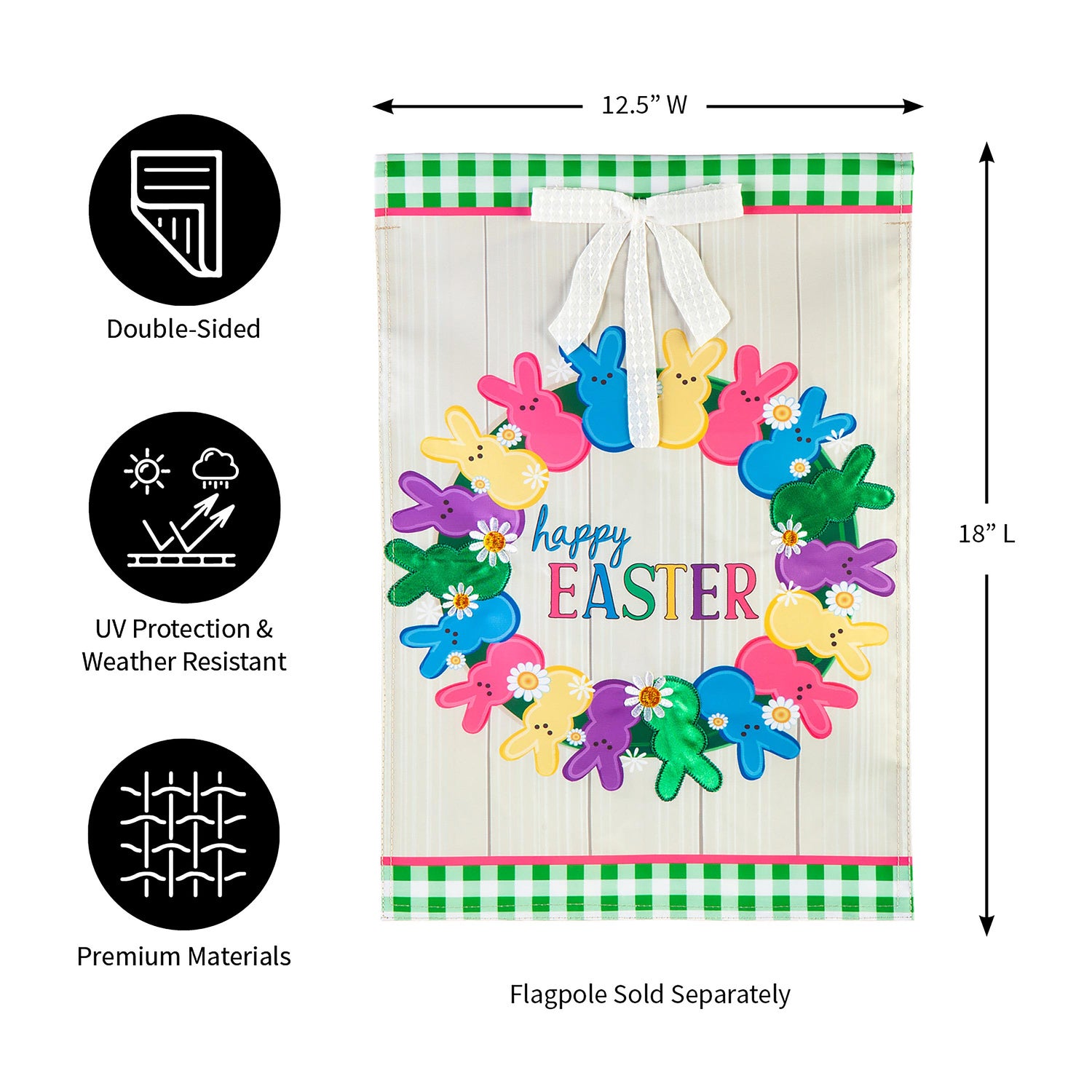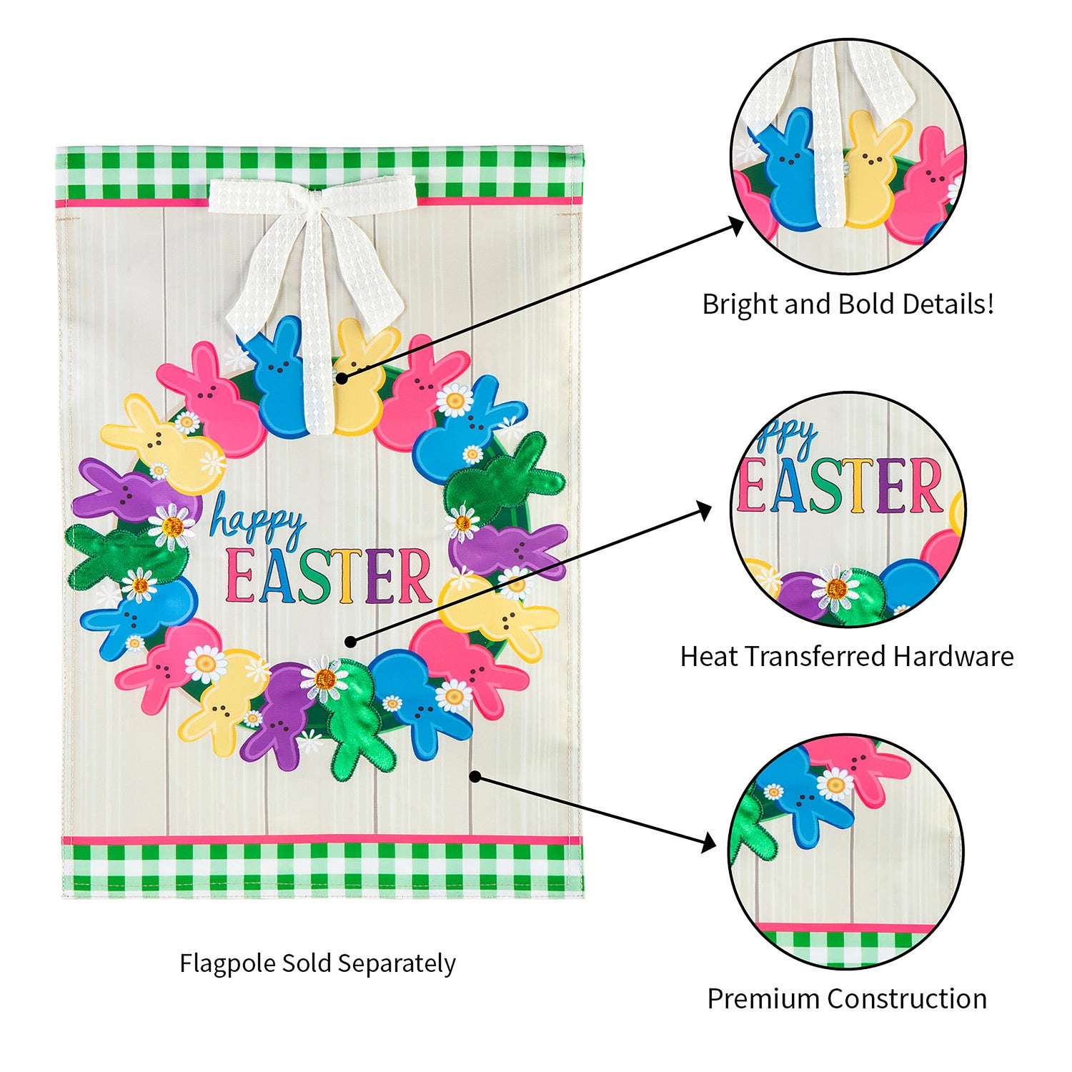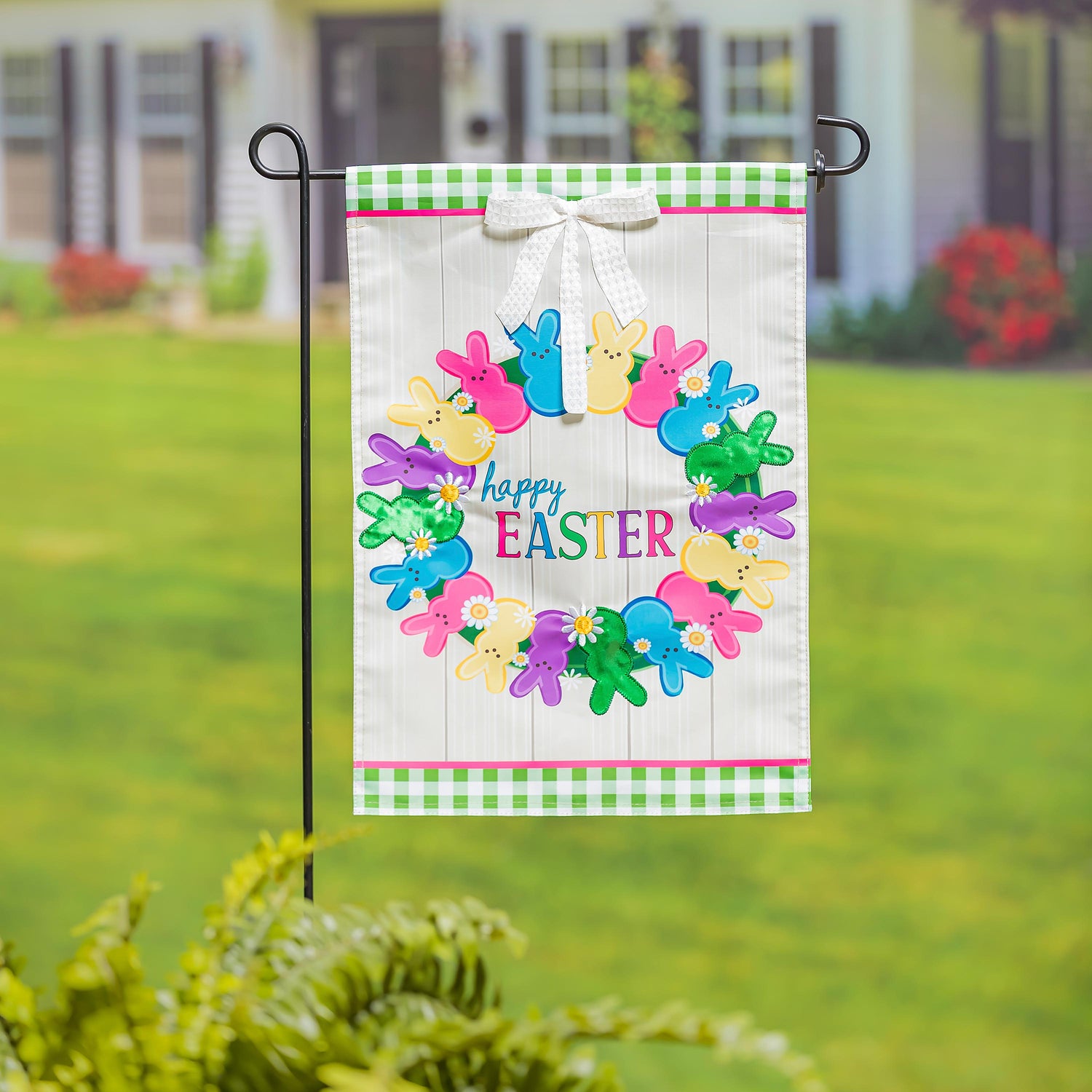 Our Colorful Bunny Wreath Garden Applique Flag is the perfect eye-catching accent for your Easter garden. A "Happy Easter" message is a cheerful way to greet guests inside a wreath made of seasonally colored Easter bunnies and textured floral accents. Plaid borders compliment a wood background with a real bow bringing the design to life. Each applique flag is made of durable 310 denier nylon to ensure the design will withstand all types of weather. The applique process combines pieces of fade-resistant fabric with tight, detailed stitching to create a mosaic effect. The soft yet heavy-weight material illuminates in the sunlight, making any of our applique flags a wonderful addition to your home or garden. All flags also feature an insertion sleeve at the top for use with any standard flagpole or stand, sold separately.