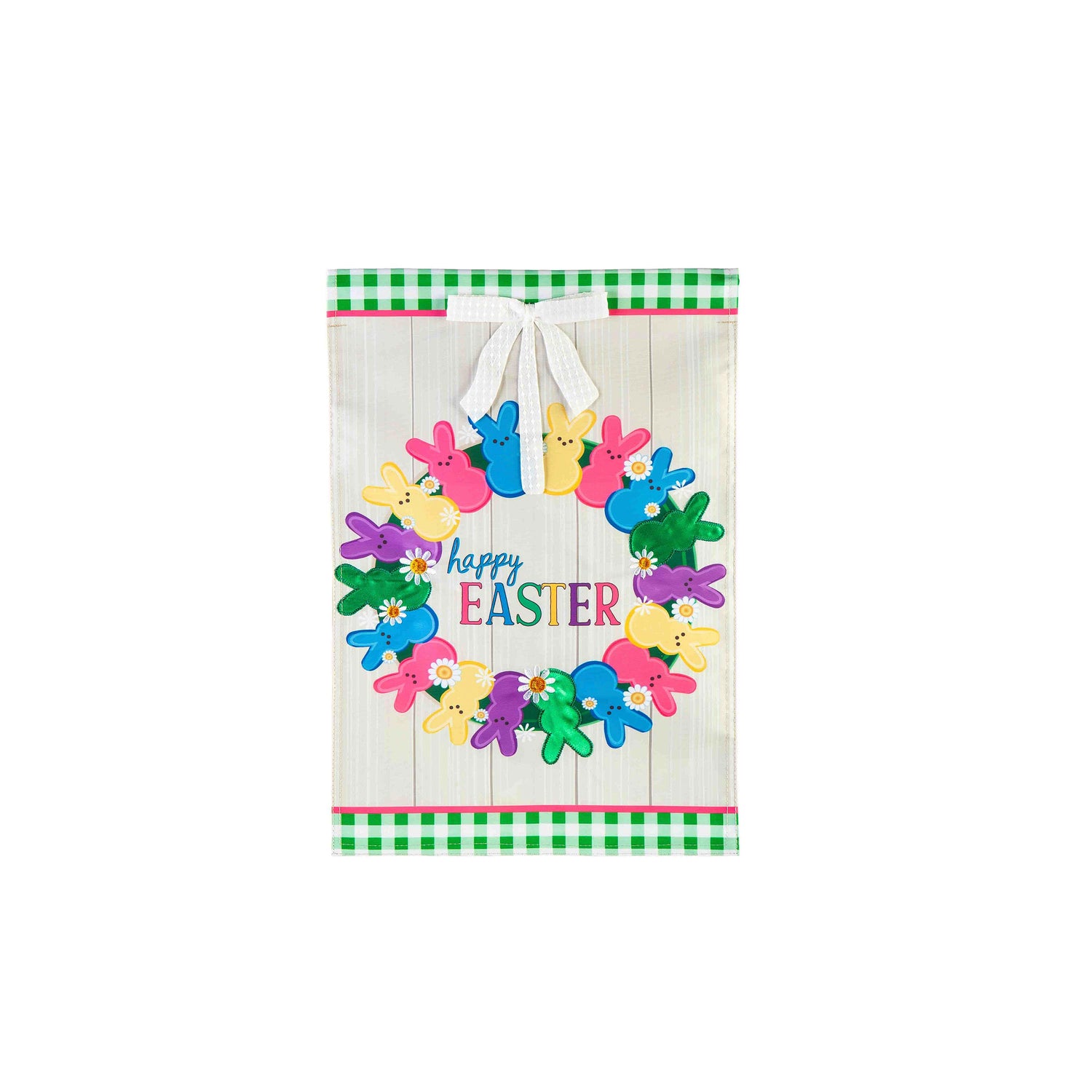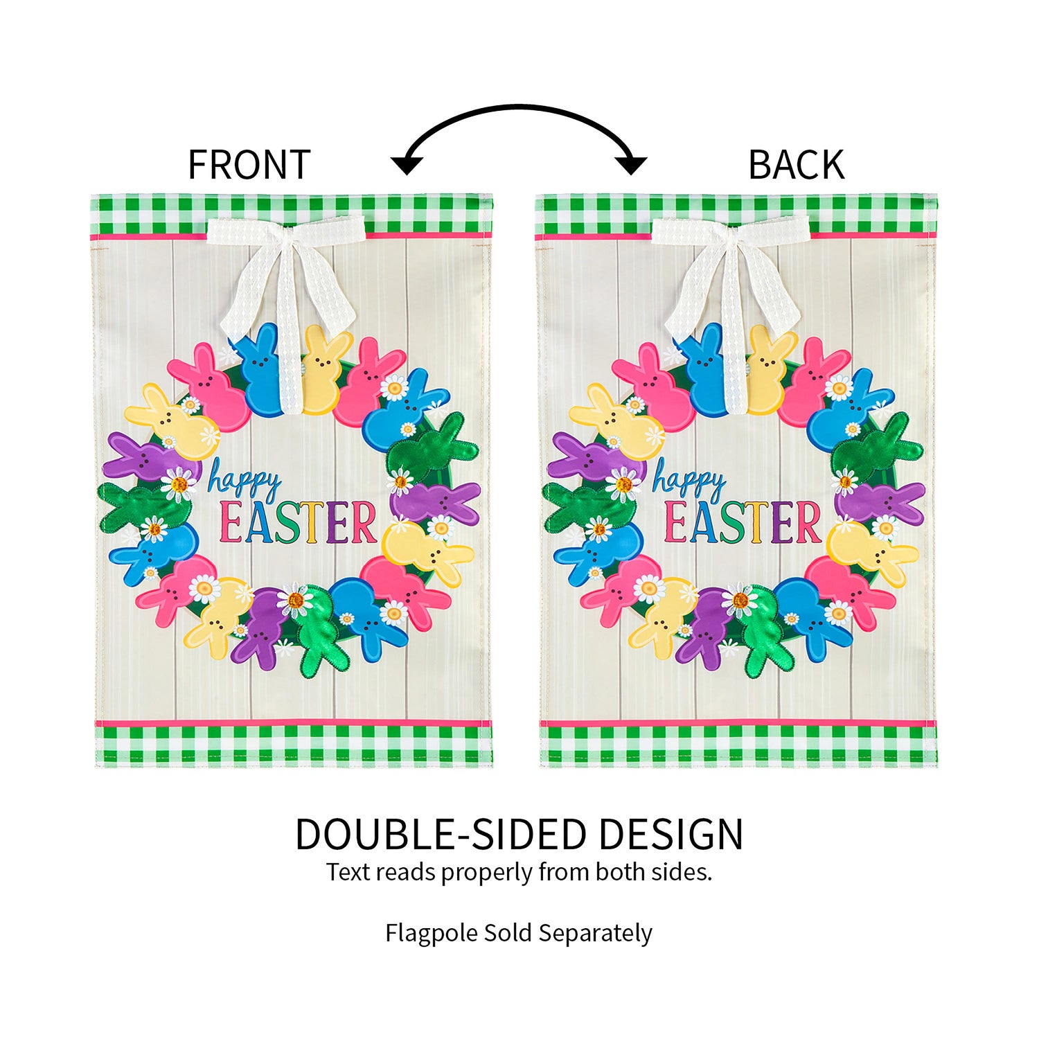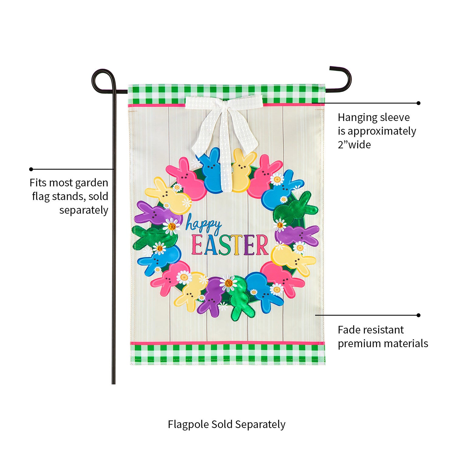 Our Colorful Bunny Wreath Garden Applique Flag is the perfect eye-catching accent for your Easter garden. A "Happy Easter" message is a cheerful way to greet guests inside a wreath made of seasonally colored Easter bunnies and textured floral accents. Plaid borders compliment a wood background with a real bow bringing the design to life. Each applique flag is made of durable 310 denier nylon to ensure the design will withstand all types of weather. The applique process combines pieces of fade-resistant fabric with tight, detailed stitching to create a mosaic effect. The soft yet heavy-weight material illuminates in the sunlight, making any of our applique flags a wonderful addition to your home or garden. All flags also feature an insertion sleeve at the top for use with any standard flagpole or stand, sold separately.
