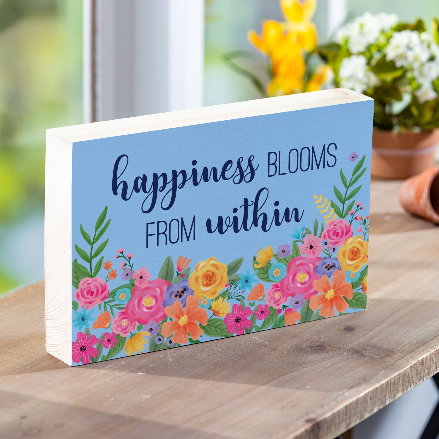 Bunny Blooms Sign Wood Block "Happiness Blooms…", 12"L x 8"H