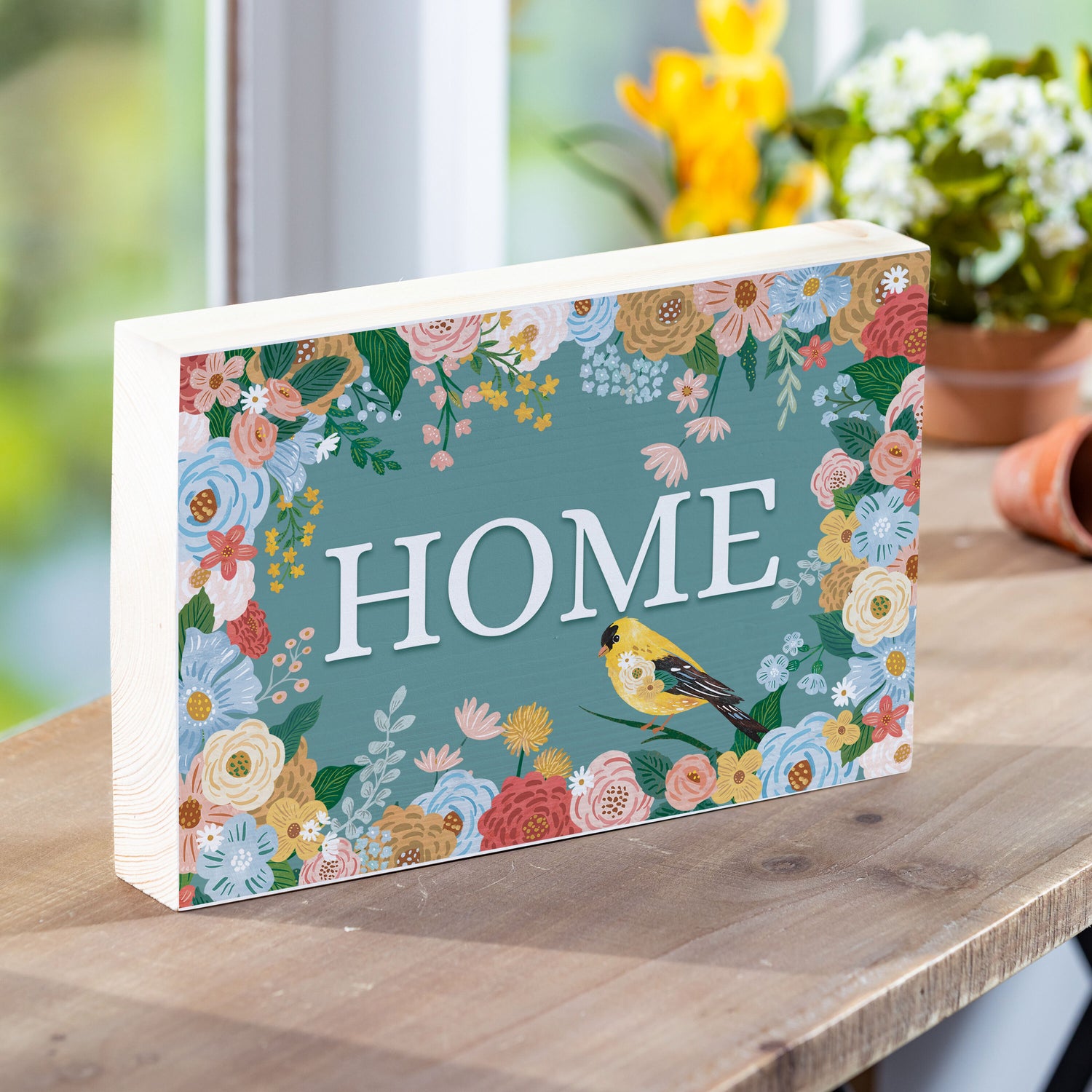 What She Shed Floral Bird Sign Wood Block "Home", 12"L x 8"H