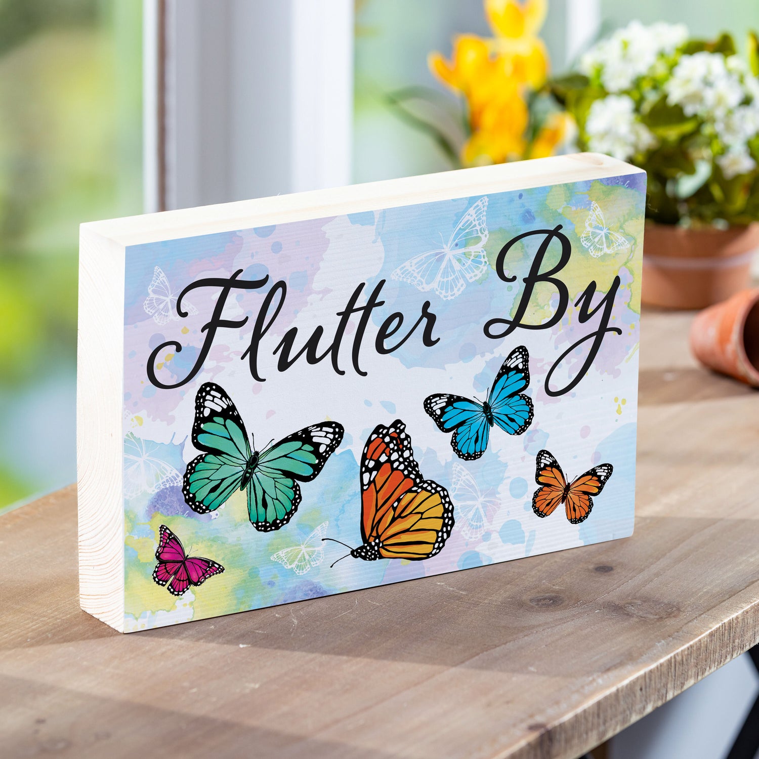 Pollinator Garden Butterfly Sign Wood Block "Flutter By", 12"L x 8"H