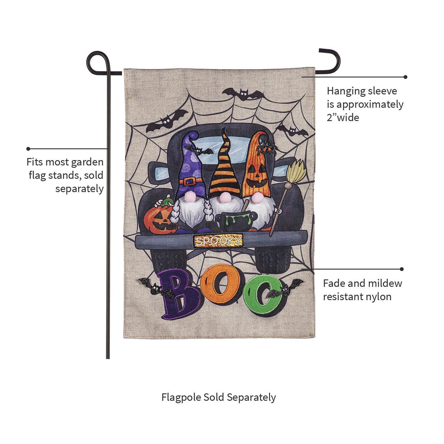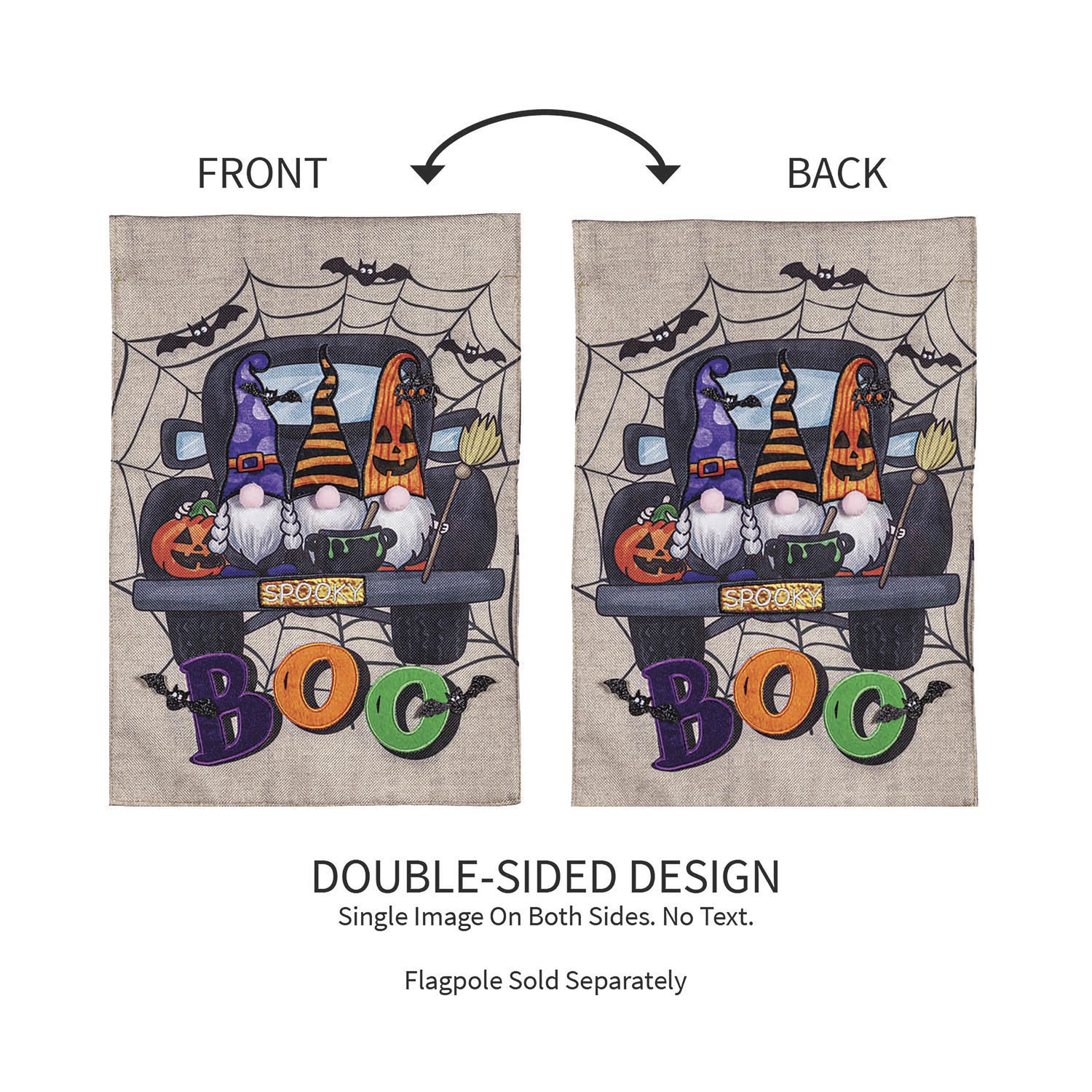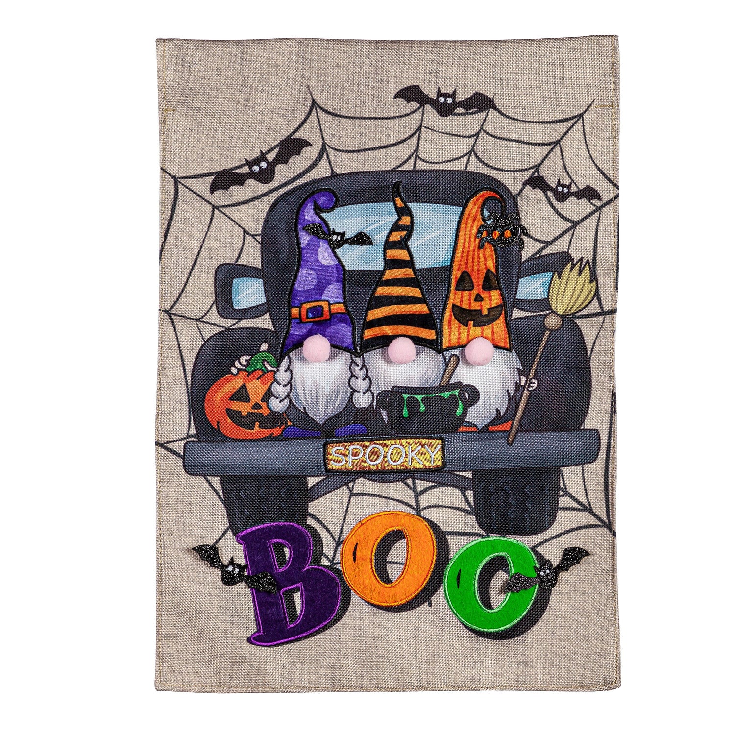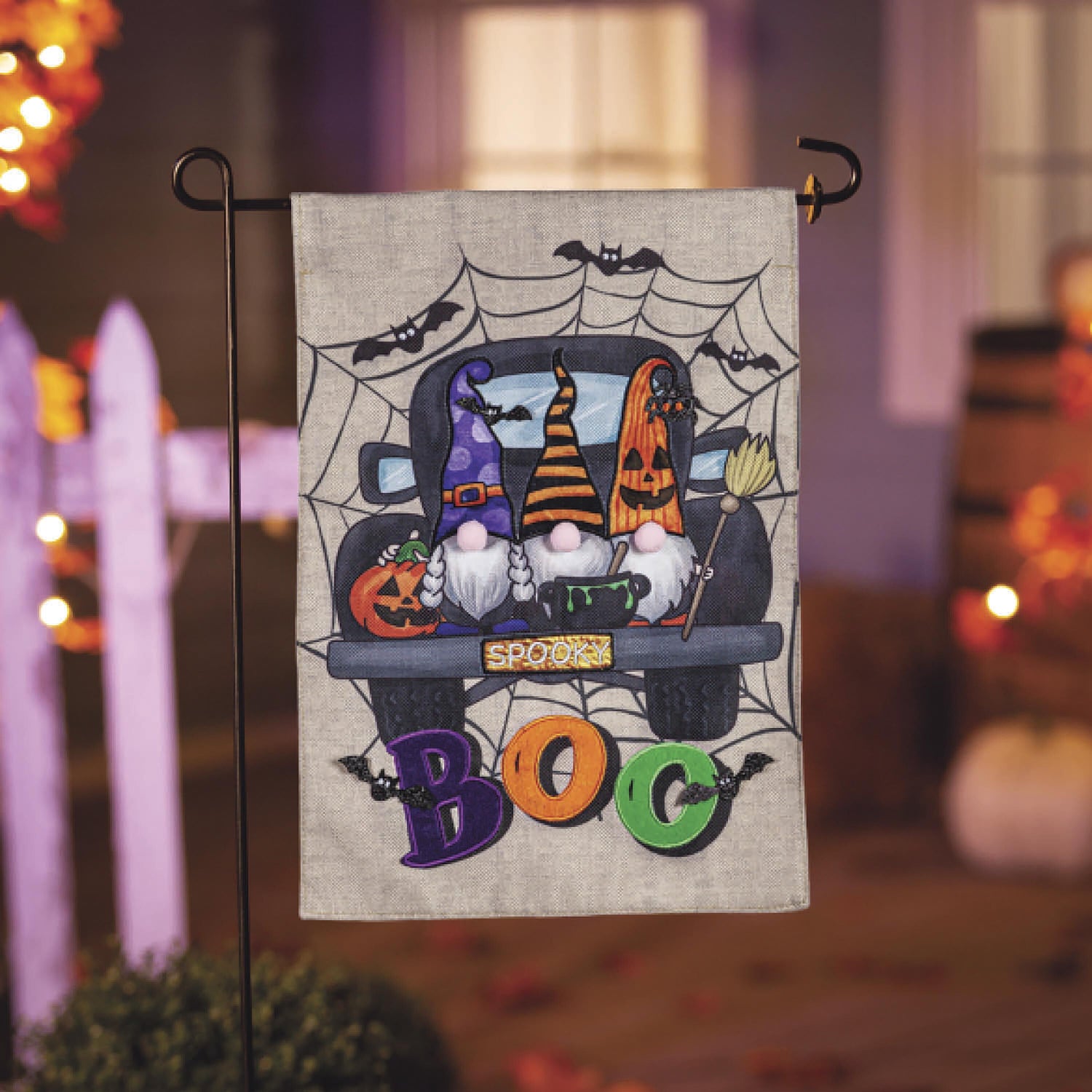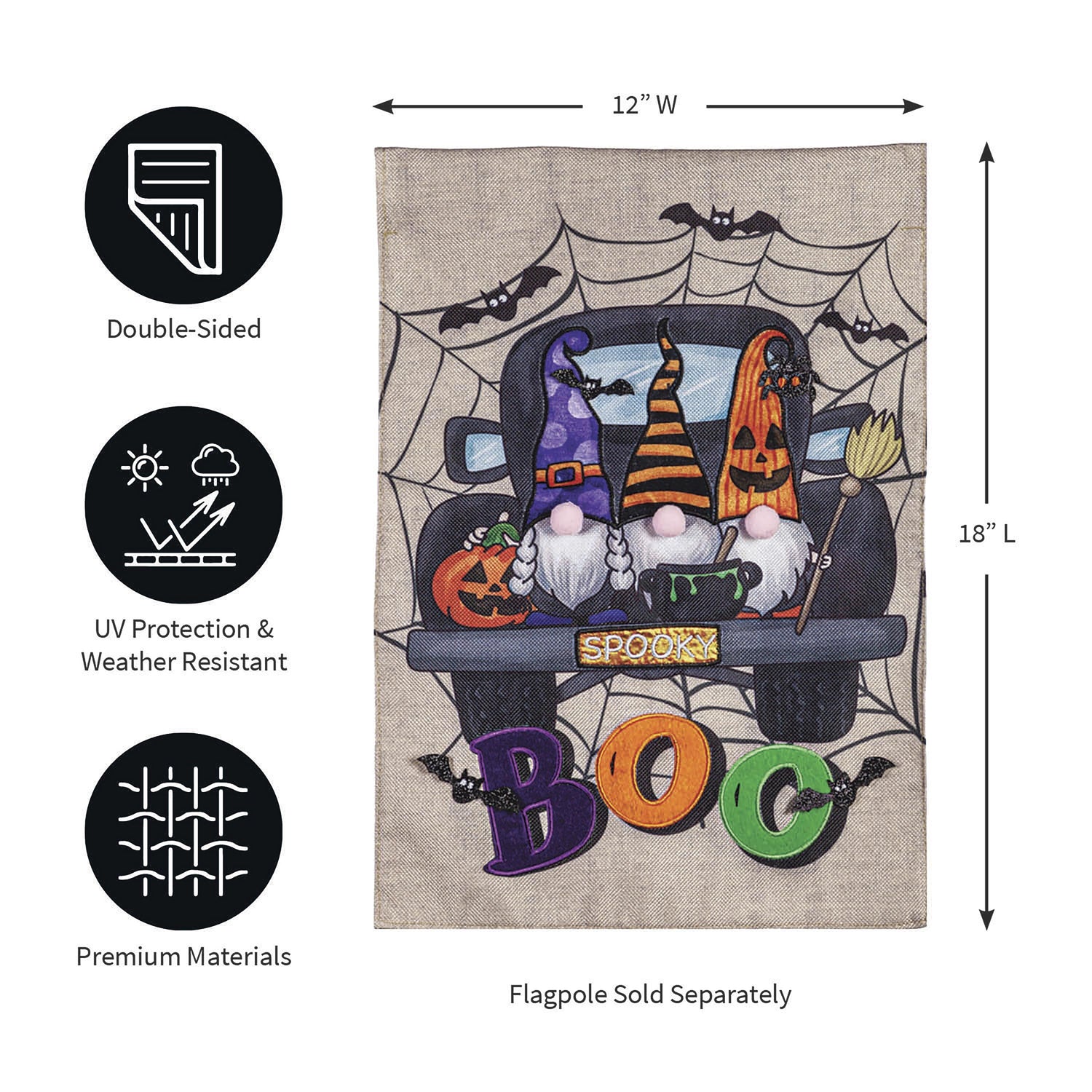 Add a playful touch to your Halloween décor with this unique garden flag. Three gnomes ride in the back of a vintage pickup truck with the license plate "spooky." Bats, brooms and a "Boo" message round out gnomes' fun-filled road trip. It's perfect in the yard to greet trick-or-treaters or in the garden to celebrate your love of Halloween and gnomes! Made of medium-weight, soft polyester burlap fabric, this flag has the look and feel of real burlap. Artwork is heat transferred onto both sides of the textured fabric to create a natural, crafted look. The poly-burlap is a durable and weatherproof material that will not fade or fray after continued use. All flags also feature a sleeve for use with any standard garden flag stand, sold separately.