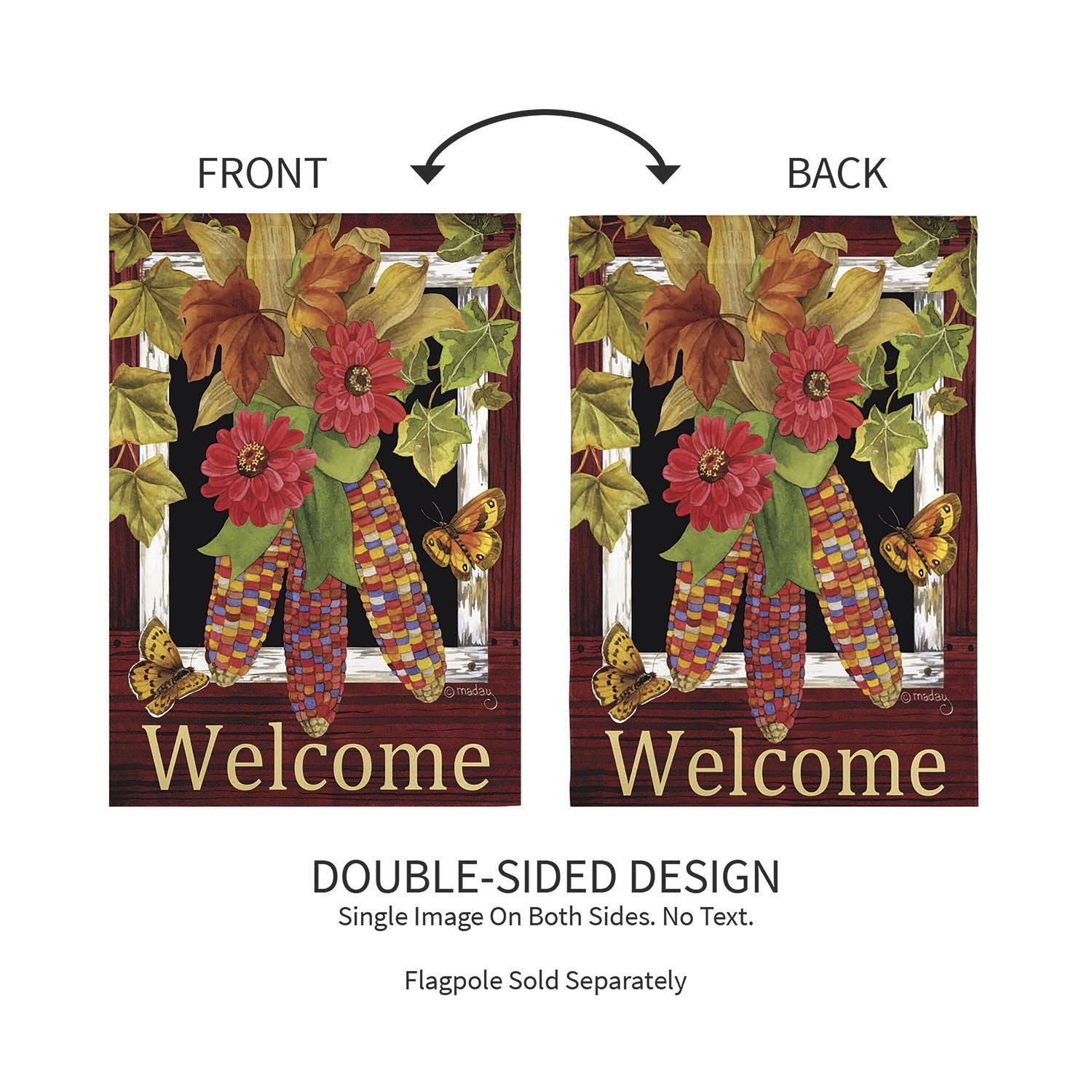 Welcome friends and family to the home with this suede garden flag. This flag features fall icons like corn and flowers surrounded by leaves and butterflies. It has a sweet Welcome message to invite in guests. The eye-catching artwork is carefully heat transferred onto sun-blocking material, resulting in beautiful, high-quality finished product. Each Suede Reflection flag is made of weatherproof material that is soft yet durable. Our attention to detail and level craftsmanship ensure that the flag wont fade or fray, even with continued outdoor use.