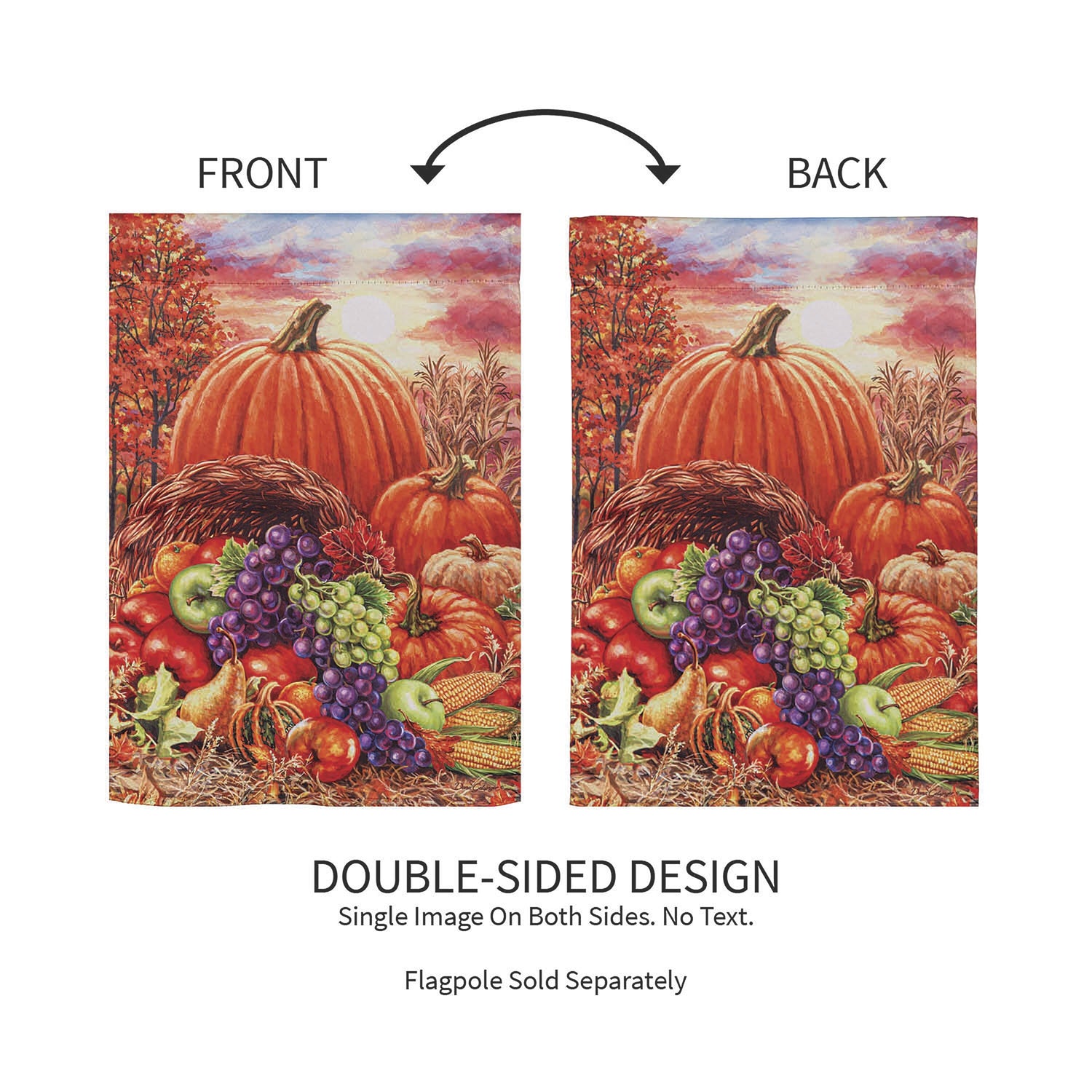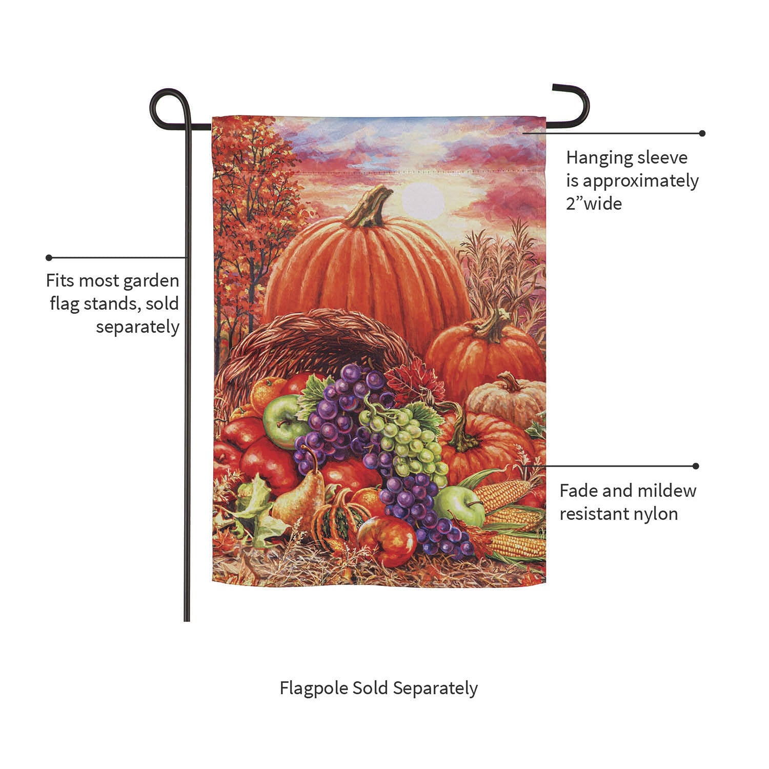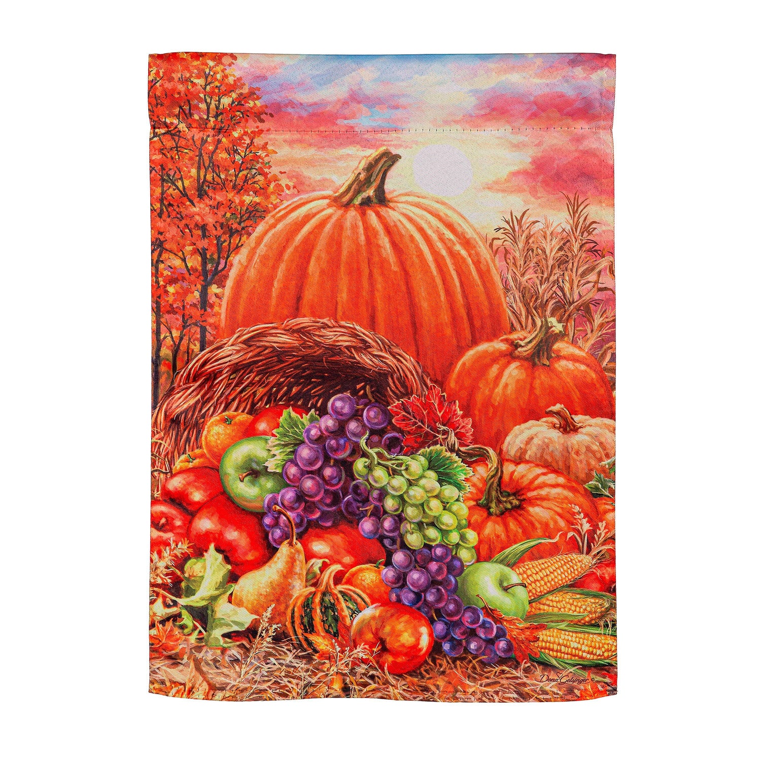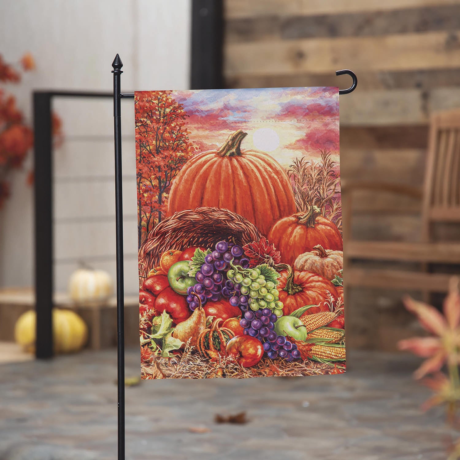Welcome friends and family to the home with this suede garden flag. This flag features a plentiful fall harvest of pumpkins, grapes, apples and corn with a pink and yellow sky in the background. The eye-catching artwork is carefully heat transferred onto sun-blocking material, resulting in beautiful, high-quality finished product. Each Suede Reflection flag is made of weatherproof material that is soft yet durable. Our attention to detail and level craftsmanship ensure that the flag wont fade or fray, even with continued outdoor use.