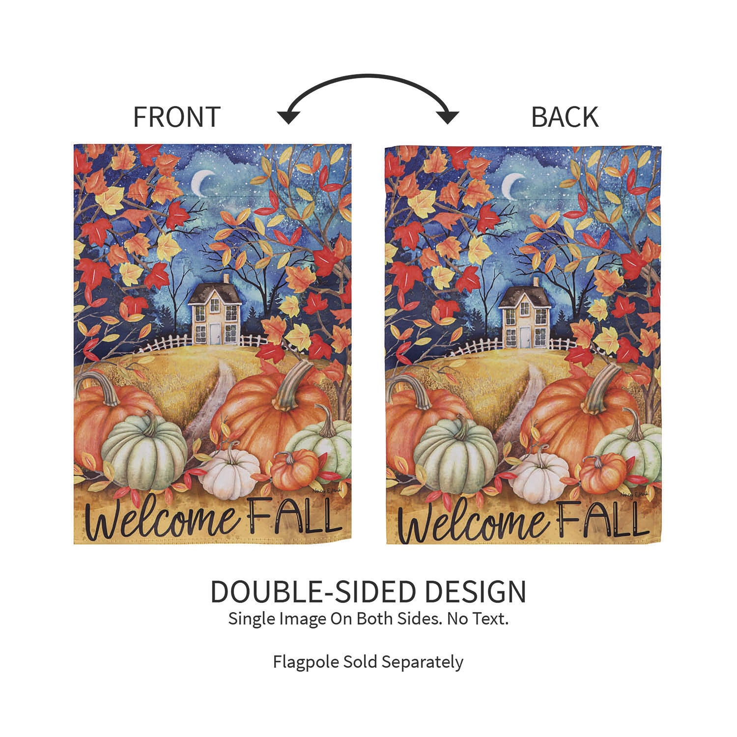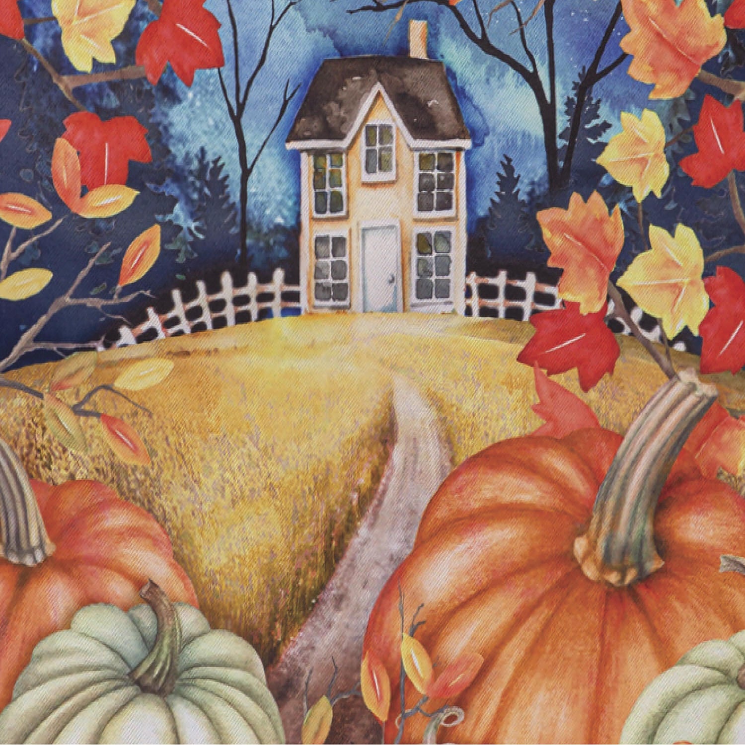 Welcome friends and family to the home with this suede garden flag. This flag features a gorgeous fall night with a path surrounded by leaves and pumpkins leading to a house. The eye-catching artwork is carefully heat transferred onto sun-blocking material, resulting in beautiful, high-quality finished product. Each Suede Reflection flag is made of weatherproof material that is soft yet durable. Our attention to detail and level craftsmanship ensure that the flag wont fade or fray, even with continued outdoor use.