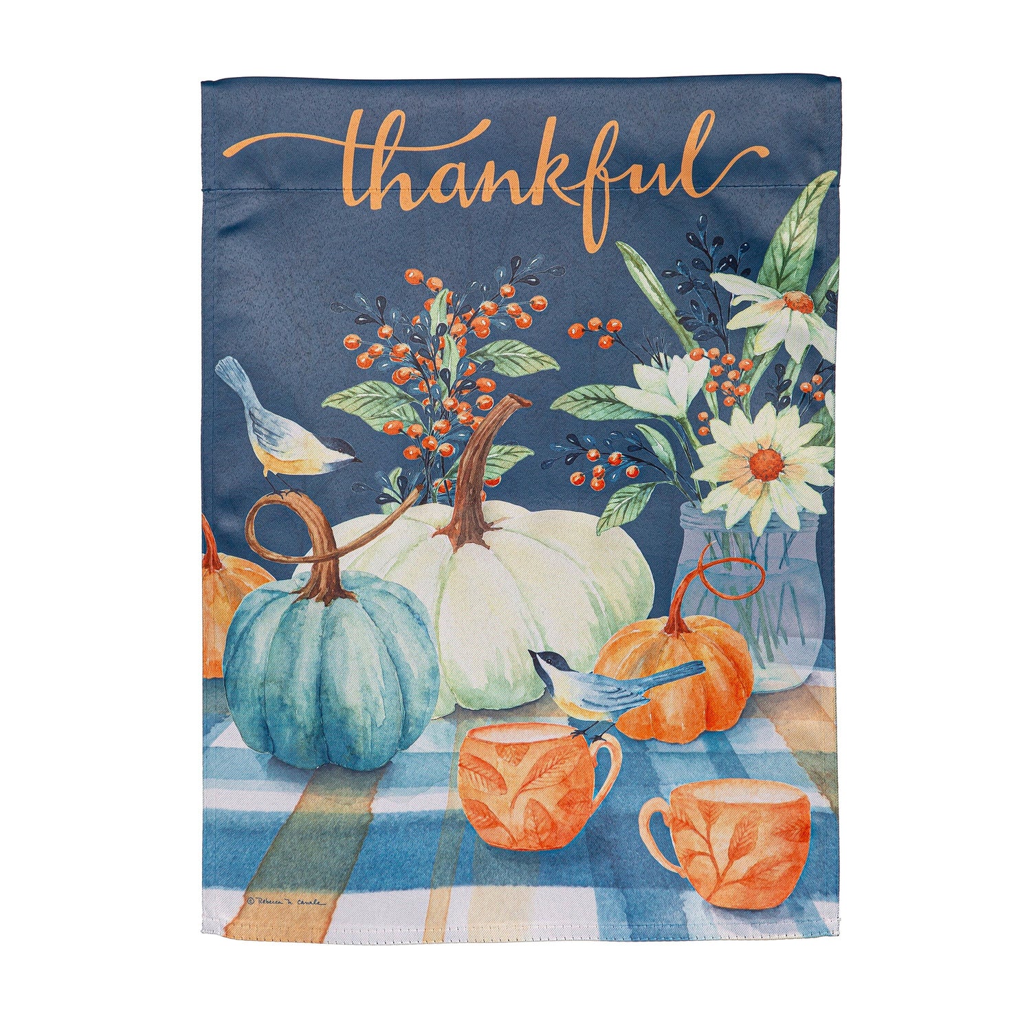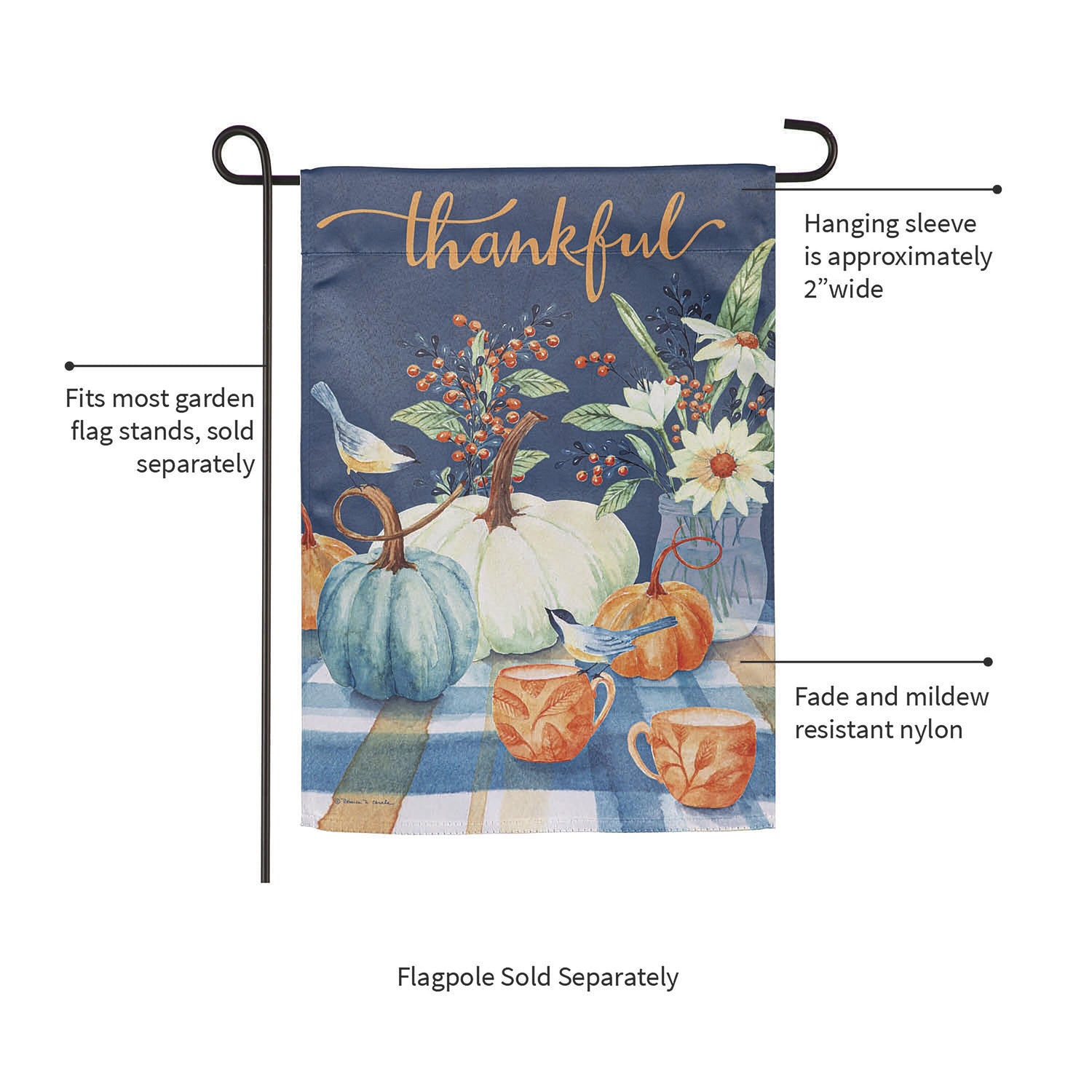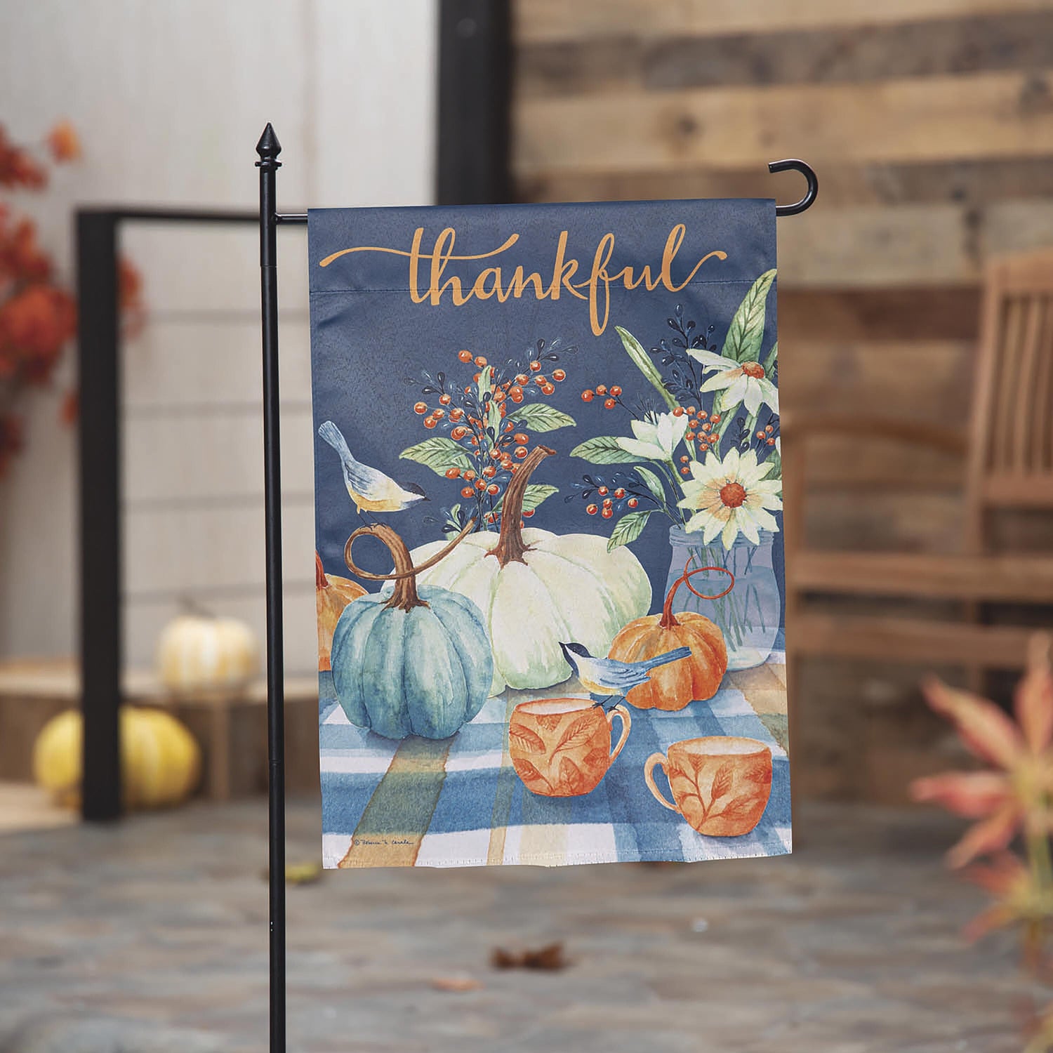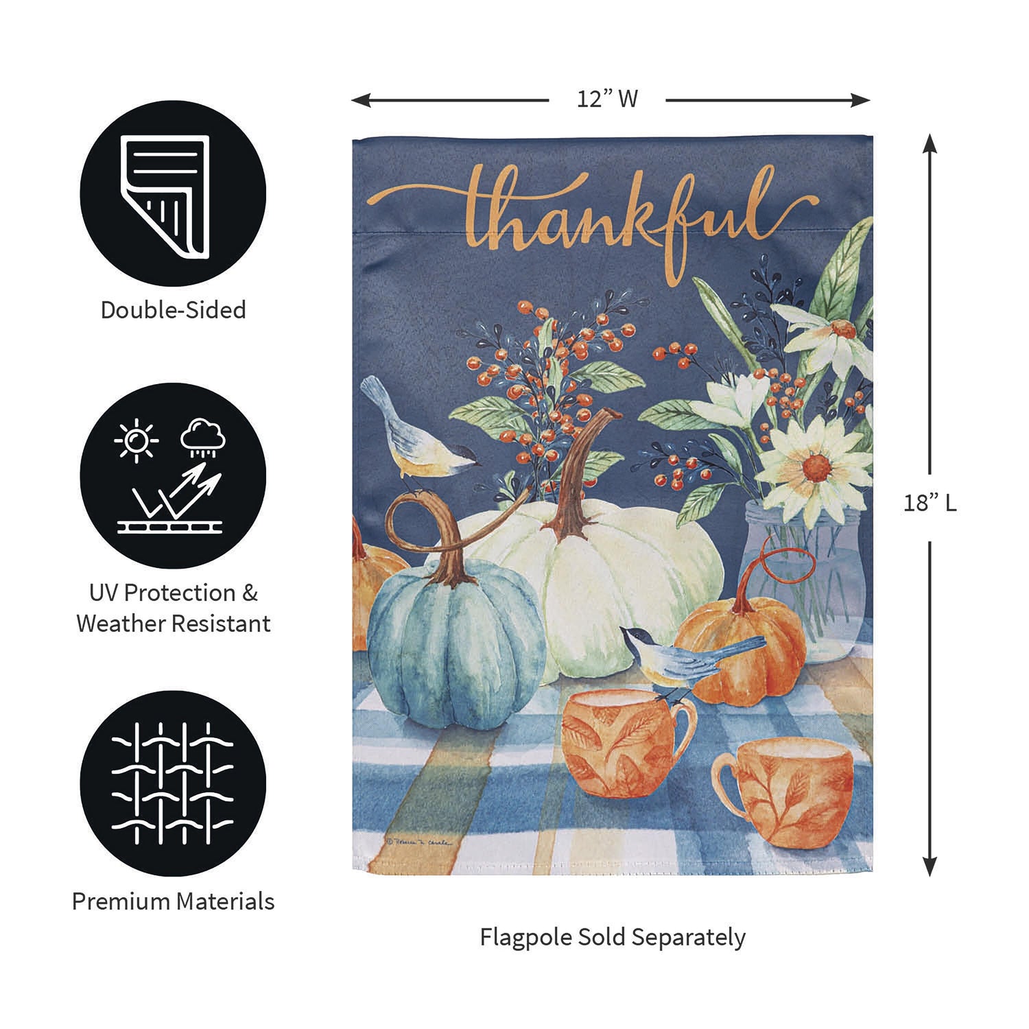 Welcome friends and family to the home with this suede garden flag. features a Thankful message over a spread of pumpkins, berries, and coffee mugs. The eye-catching artwork is carefully heat transferred onto sun-blocking material, resulting in beautiful, high-quality finished product. Each Suede Reflection flag is made of weatherproof material that is soft yet durable. Our attention to detail and level craftsmanship ensure that the flag wont fade or fray, even with continued outdoor use.