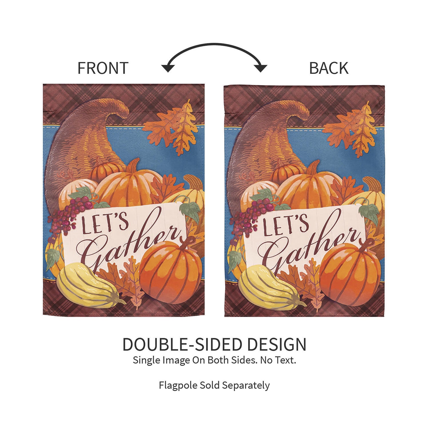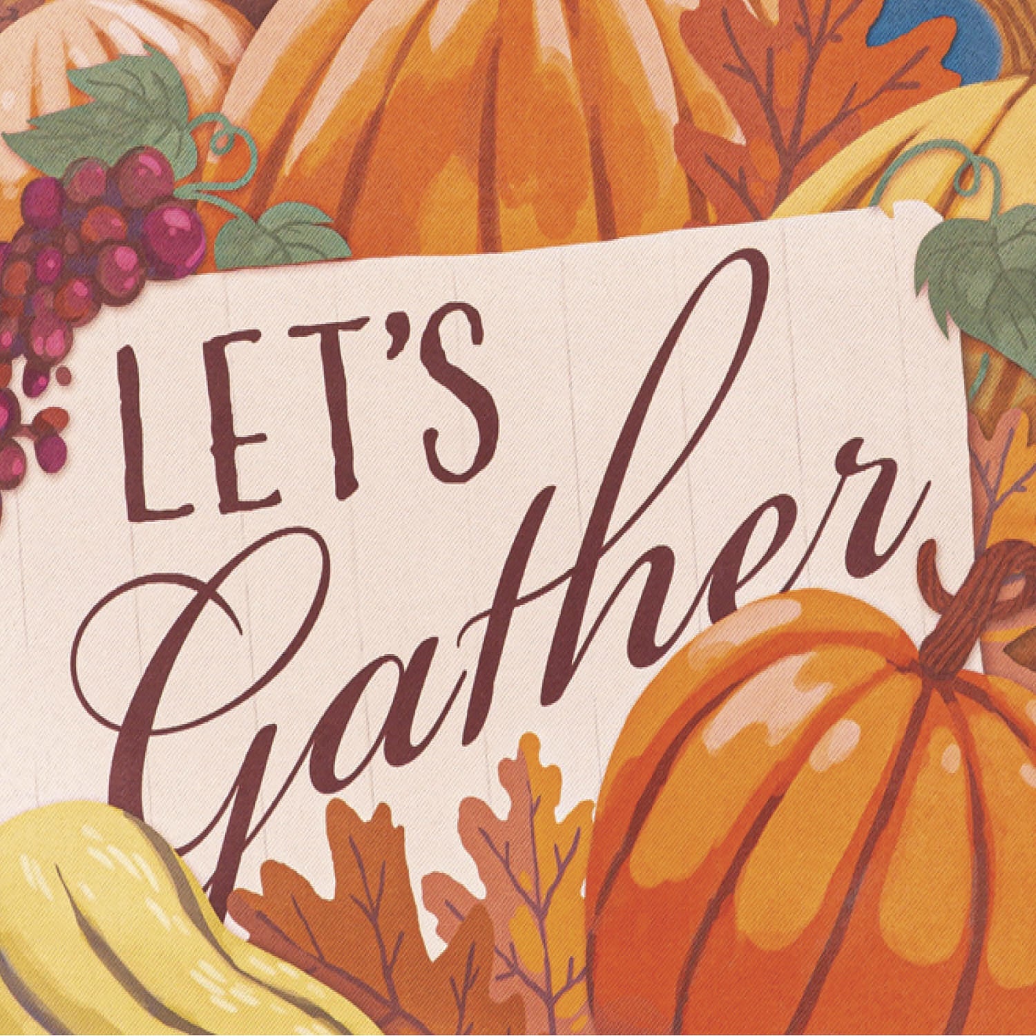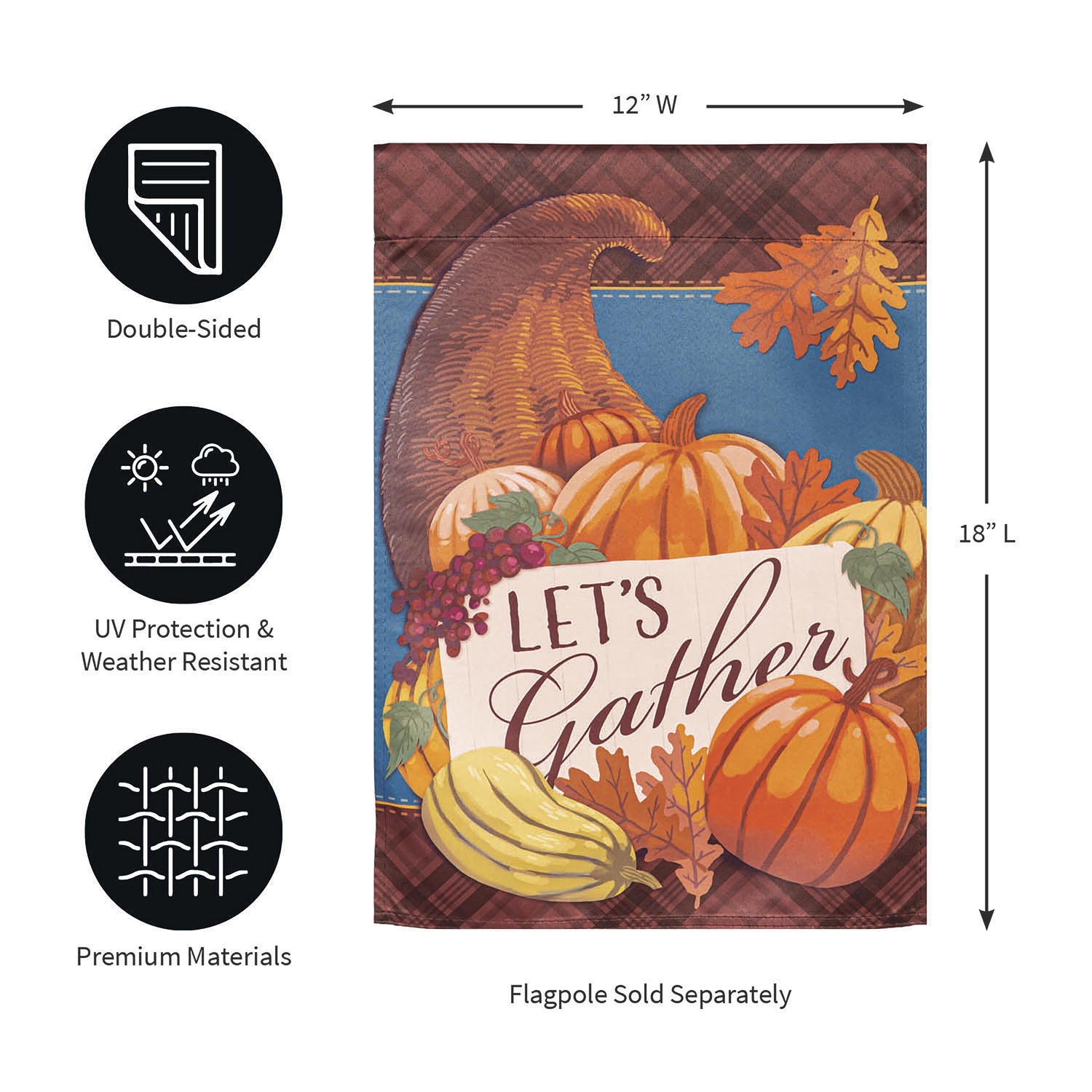 Welcome friends and family to the home with this suede garden flag. This flag features a cornucopia filled with pumpkins, grapes and other fall foliage. Its Lets gather message invites guests in. The eye-catching artwork is carefully heat transferred onto sun-blocking material, resulting in beautiful, high-quality finished product. Each Suede Reflection flag is made of weatherproof material that is soft yet durable. Our attention to detail and level craftsmanship ensure that the flag wont fade or fray, even with continued outdoor use.