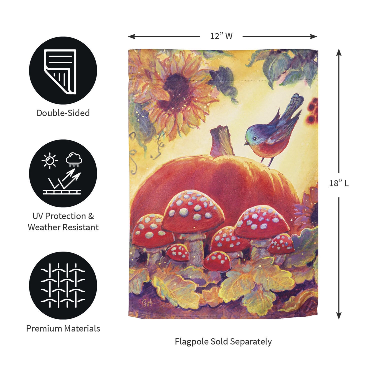 Welcome friends and family to the home with this suede garden flag. It features a darling bird sitting on a pumpkin surround by mushrooms and sunflowers. Light shines on this adorable to highlight the scenes beauty. The eye-catching artwork is carefully heat transferred onto sun-blocking material, resulting in beautiful, high-quality finished product. Each Suede Reflection flag is made of weatherproof material that is soft yet durable. Our attention to detail and level craftsmanship ensure that the flag wont fade or fray, even with continued outdoor use.