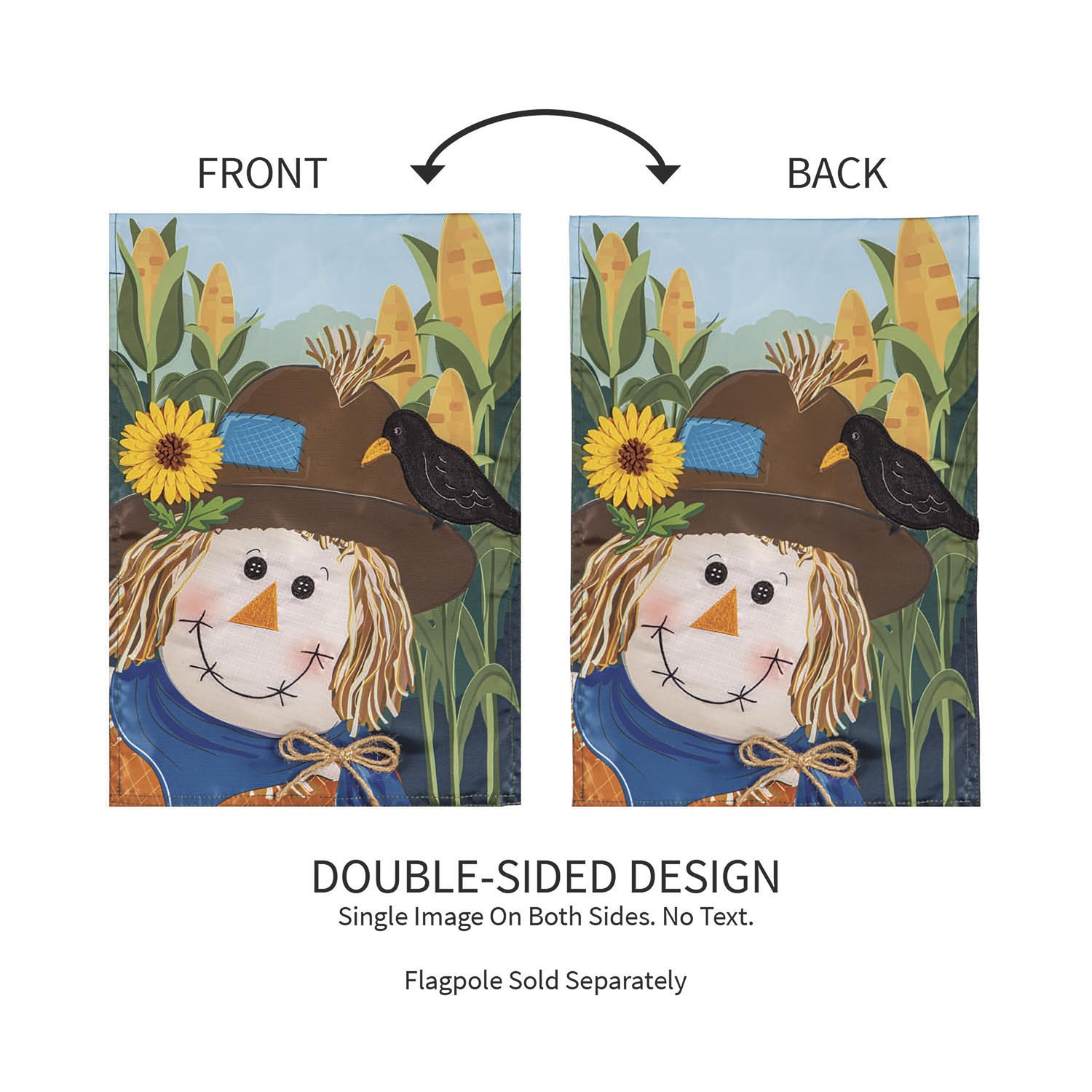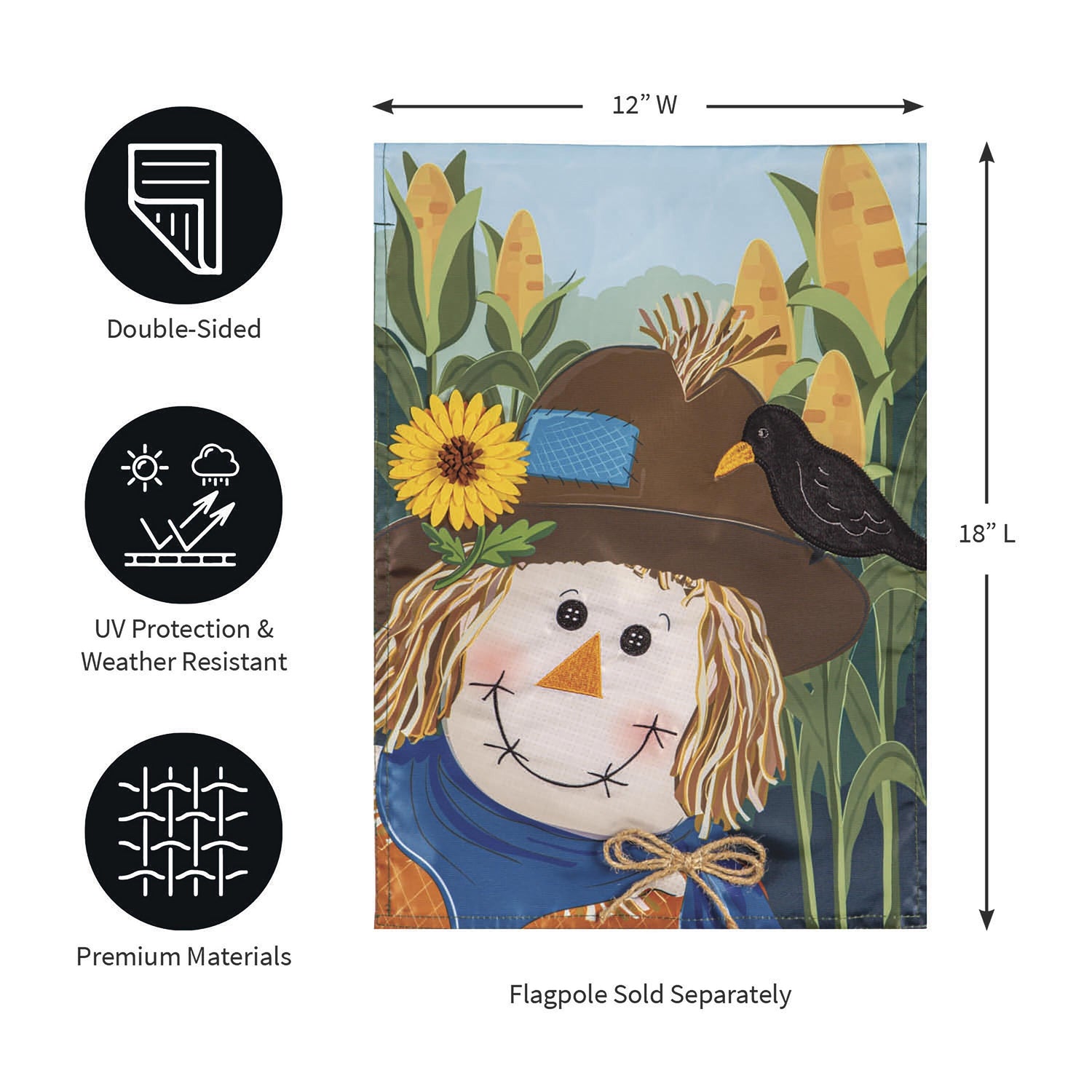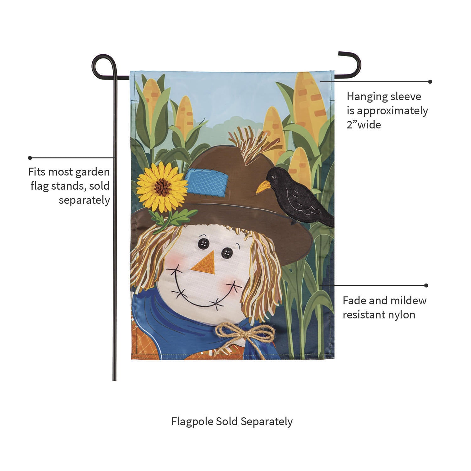 Welcome friends and family to the home with this applique garden flag. This flag features a happy scarecrow in a cornfield and a Welcome message to invite guests in. Each Evergreen applique flag is carefully crafted from multiple layers of durable material that can withstand a variety of weather conditions. We combine pieces of fade-resistant, strong fabric with tight, detailed stitching to create a dimensional mosaic effect. Spot clean only, never put in a dryer. When not in use, flag can be hung in a closet or placed in storage container.