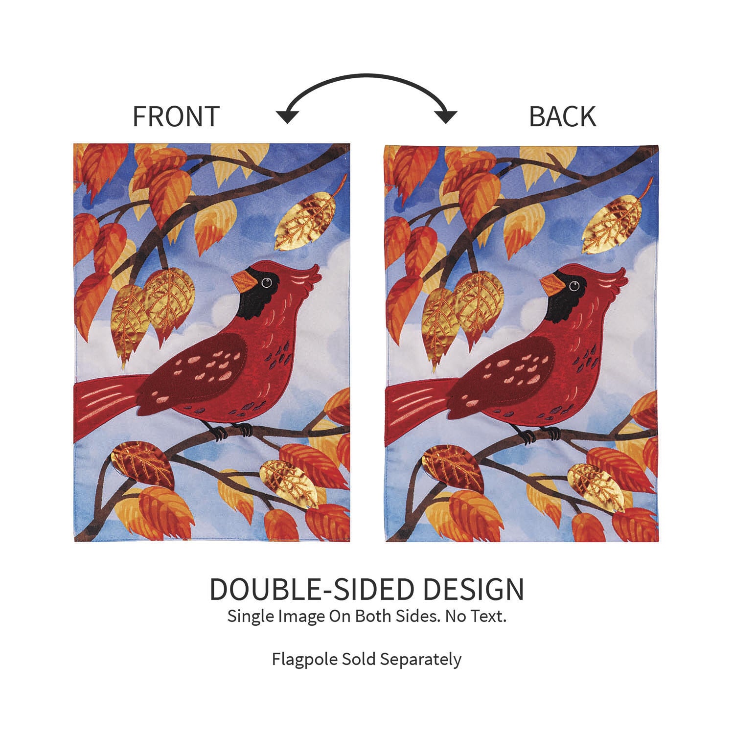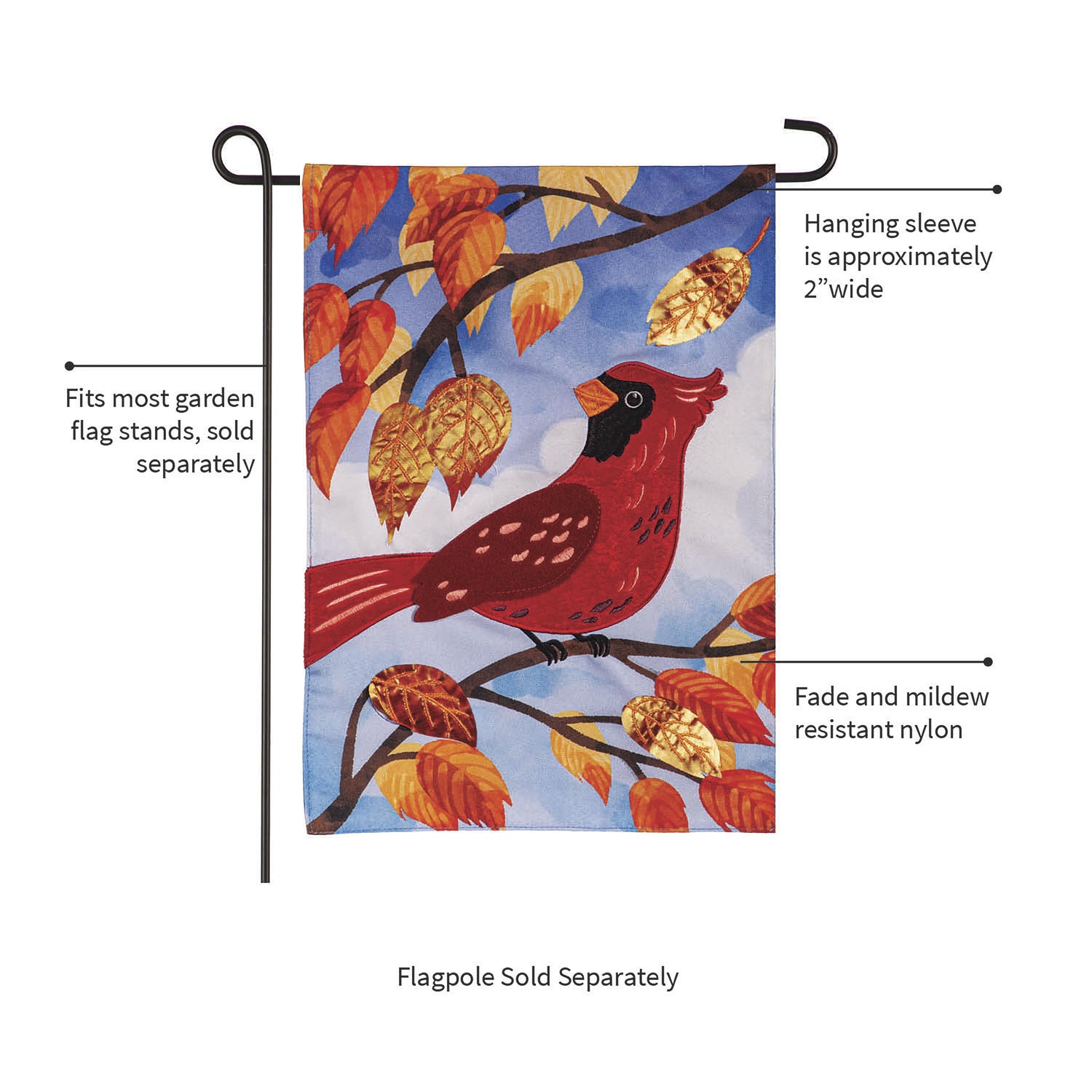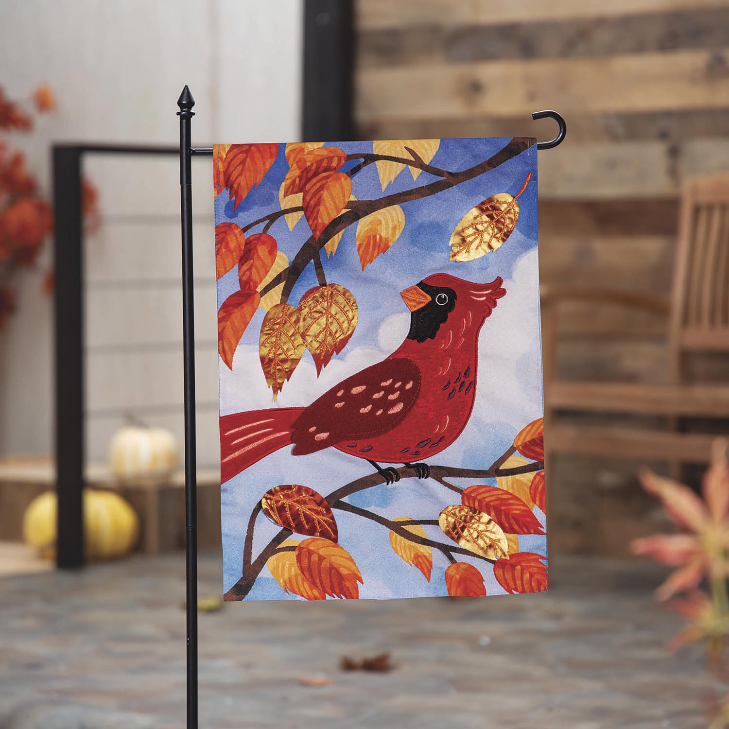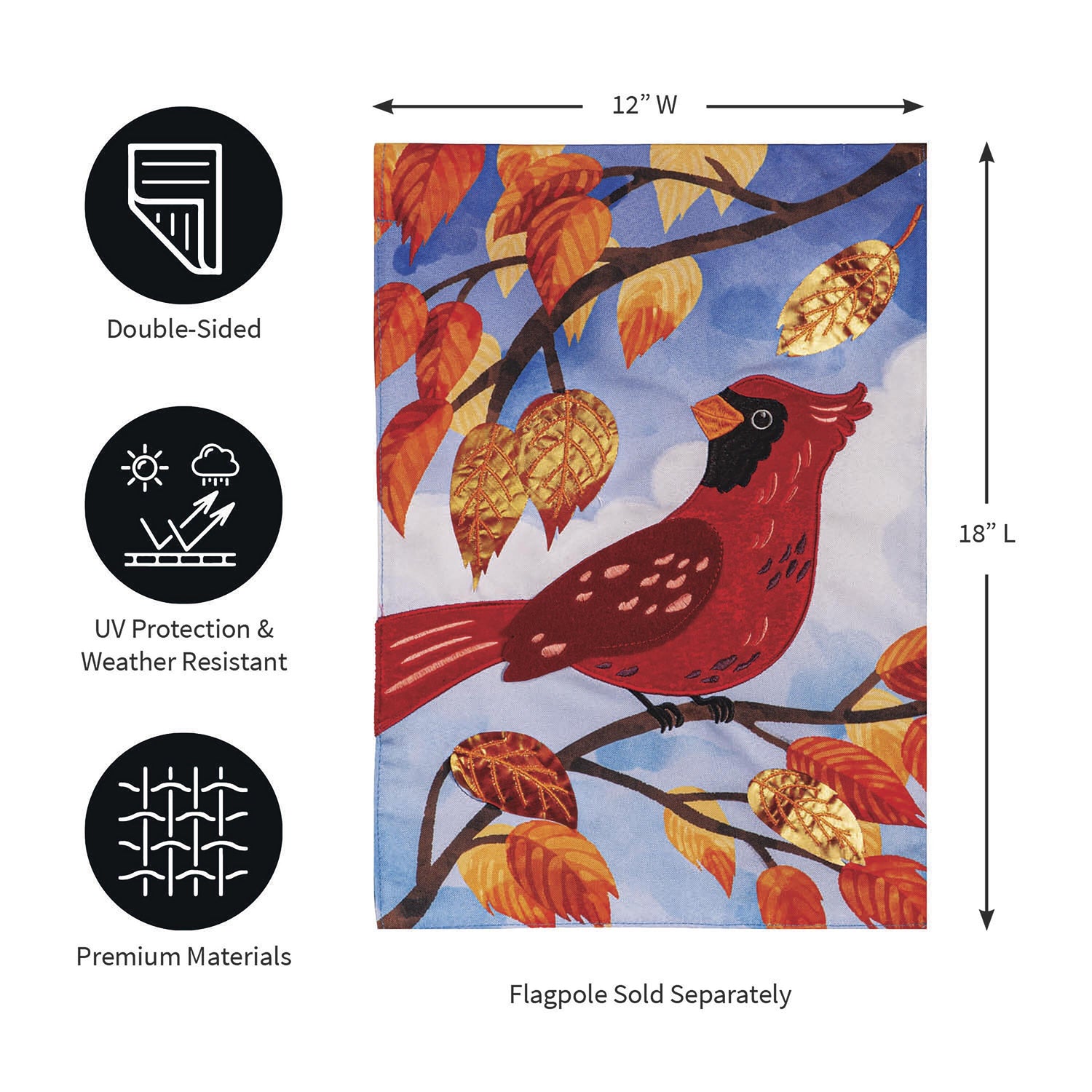 Welcome friends and family to the home with this applique garden flag. This flag features a beautiful cardinal sitting in a tree on a crisp fall day. Each Evergreen applique flag is carefully crafted from multiple layers of durable material that can withstand a variety of weather conditions. We combine pieces of fade-resistant, strong fabric with tight, detailed stitching to create a dimensional mosaic effect. Spot clean only, never put in a dryer. When not in use, flag can be hung in a closet or placed in storage container.