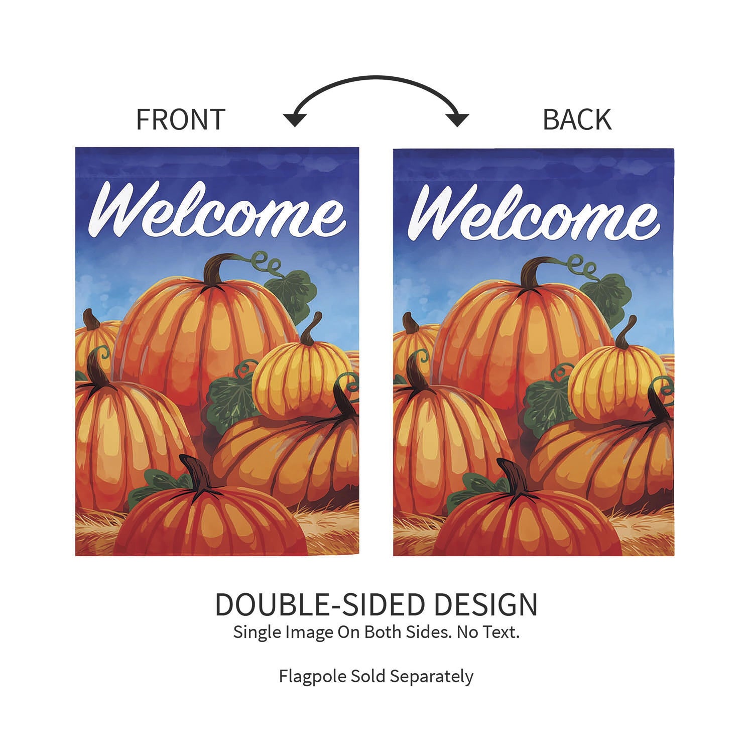 Welcome friends and family to the home with this applique garden flag. This flag features a scenic pumpkin patch with a rich blue sky in the background and a Welcome message. Each Evergreen applique flag is carefully crafted from multiple layers of durable material that can withstand a variety of weather conditions. We combine pieces of fade-resistant, strong fabric with tight, detailed stitching to create a dimensional mosaic effect. Spot clean only, never put in a dryer. When not in use, flag can be hung in a closet or placed in storage container.