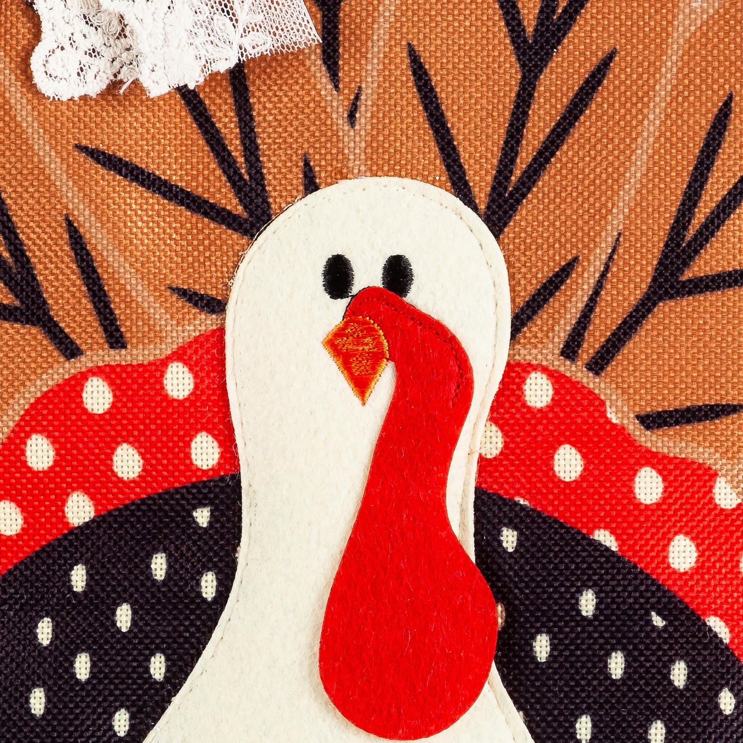 This Turkey Burlap Door Decor will greet guests in style during the fall season. The polka dot design boasts fall colors and a classic turkey with 3D accents. Its fall colors really come together to form a fulfilling piece that will look great when displayed on your door. This Burlap Door Hanger is crafted from a medium-weight, poly-burlap material with detailed stitching. The unique blend of fibers makes this door decor completely safe for outdoor use in all types of weather. Perfect for fall celebrations, the design hangs from a coordinating ribbon that compliments the overall design.