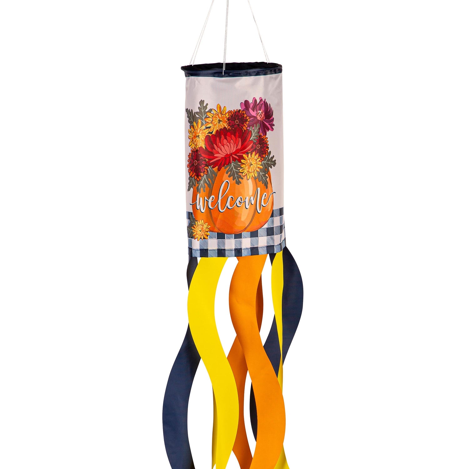 Breathe life into any garden or yard with this windstock. It features a beautiful bouquet of mums sitting in a pumpkin and a Welcome message to invite guests in. Watch the colorful tails with hemmed edges dance in the wind, bringing the design to life every time the wind blows. The artwork is heat sublimated onto weather-resistant nylon fabric with superior quality. A poly carbonate plastic hoop at the top opening holds the shape of the windstock. The attached bridle string and swivel snap make hanging easy.