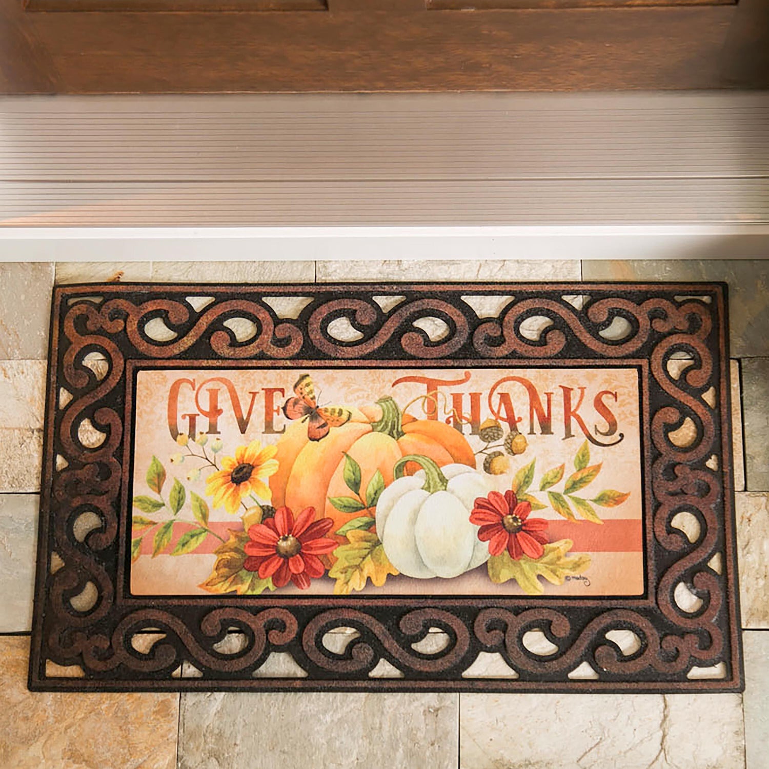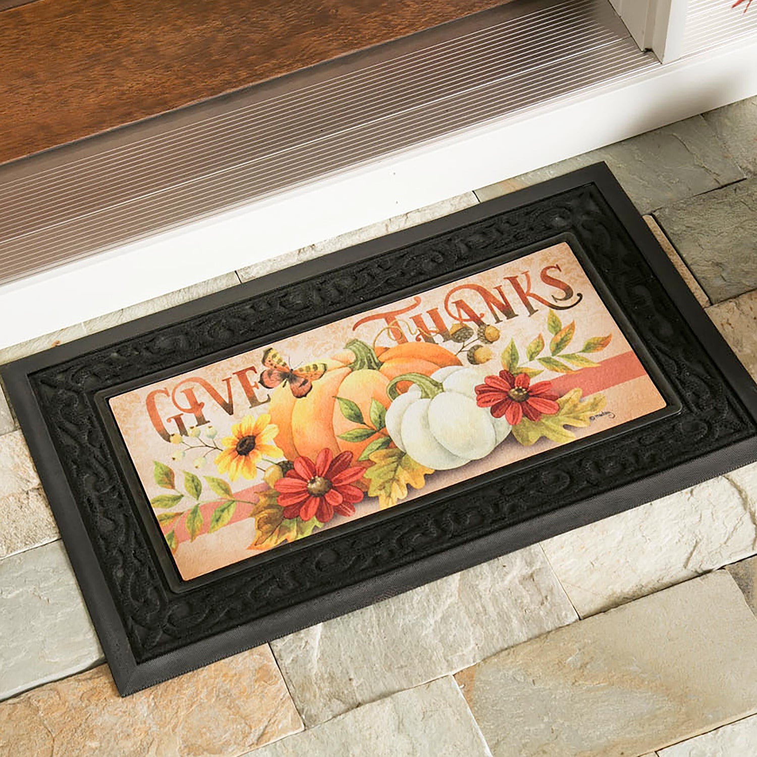 This Give Thanks Sassafras Switch Mat features beautiful harvest details of pumpkins and sunflowers. With its "Give Thanks" sentiment, this design is perfect for autumn and Thanksgiving. Greet guests with a doormat loaded with seasonal spirit that will last through the fall season. The durable insert is created for placement in a Sassafras mat frame or tray, sold separately. Swap mats seasonally to keep things fresh and fun. The charming design is heat sublimated onto the polyester and rubber insert. Suitable for indoor and outdoor use, the floor mat can also be used on its own as a stair tread or small floor mat. It is mildew resistant and features an anti-slip backing. Spot clean with soap and warm water or hose down. For best results, display your mat in a covered or sheltered area to prevent fading.