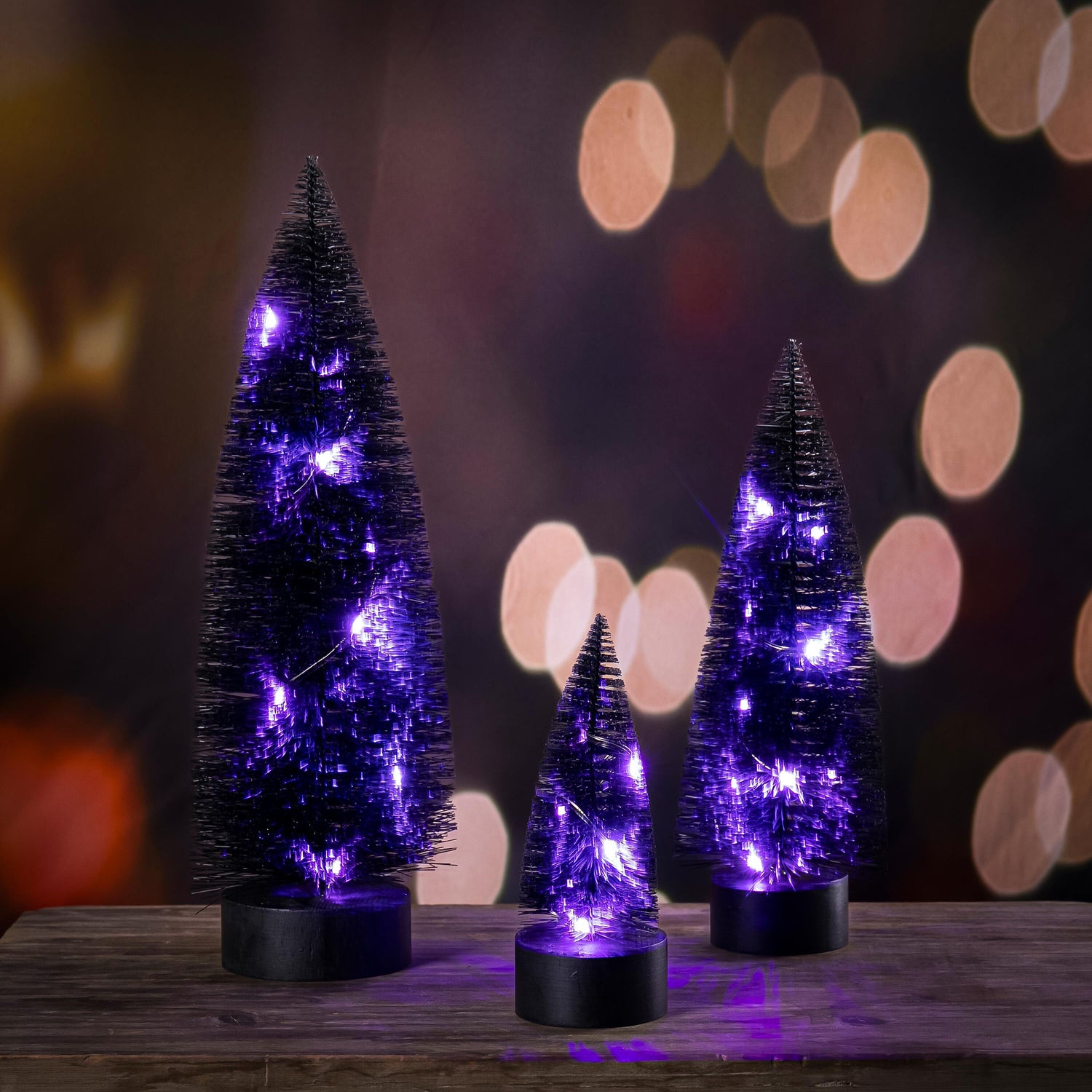 Light up any room with this LED Bottle Brush Tree Set. This spooktastic set features purple lights and a Halloween color palette. They can be set on a desk, table, or counter to add holiday spirit to any room. Add them a display of spooky houses to create a haunting scene. Theyre the perfect accent piece for anyone who loves the Halloween season. They require CR2032 batteries, which are included.