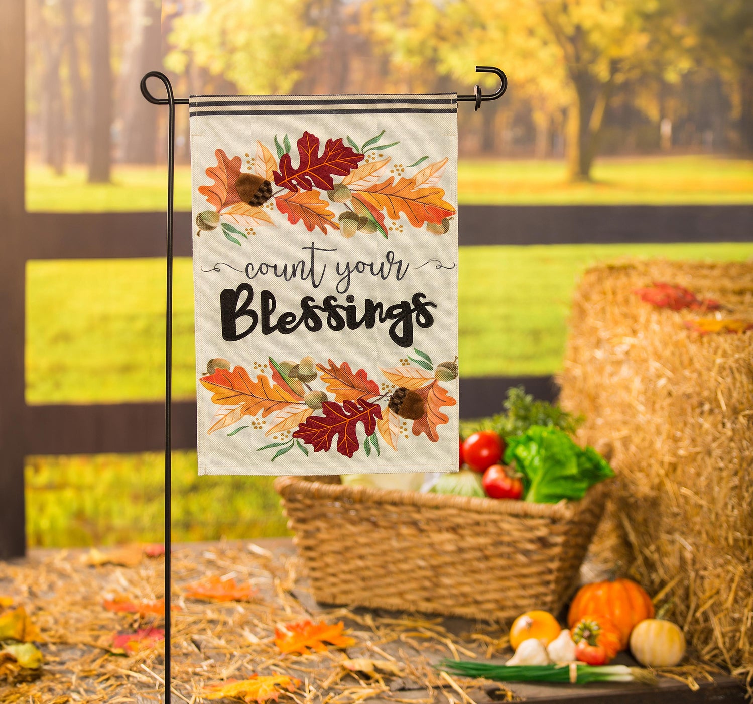 Spruce up your outdoor decor with this perfectly festive Count Your Blessings Garden Burlap Flag. The design features autumnal colors with textured acorn accents and a harvest season sentiment. It's "Count Your Blessings" message is sure to delight every passerby during fall months. Part of our Burlap Boutique Collection, this flag is made of medium-weight, soft polyester burlap fabric that has the look and feel of real burlap. Artwork is heat transferred onto both sides of the textured fabric to create a natural, crafted look. The poly-burlap is a durable and weatherproof material that will not fade or fray after continued use. All flags also feature a sleeve at top for use with any standard flagpole or stand, sold separately.