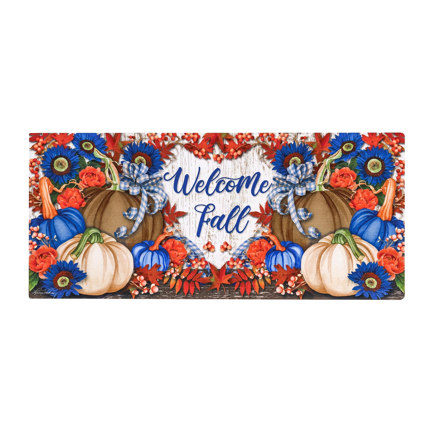 Our Welcome Fall door mat offers a friendly greeting to all who approach your door. Pumpkins in shades of blue, brown and white are surrounded with orange and blue flowers and foliage. Gingham bows add a distinctive farmhouse feel. This colorful door mat is designed to fit into a Sassafras mat tray, sold separately. Swap mats seasonally to keep things fresh and fun. The charming design is heat sublimated onto the polyester and rubber insert. Suitable for indoor and outdoor use, the floor mat can also be used on its own as a stair tread or small floor mat. It is mildew resistant and features an anti-slip backing. Spot clean with soap and warm water or hose down. For best results, display your mat in a covered or sheltered area to prevent fading.