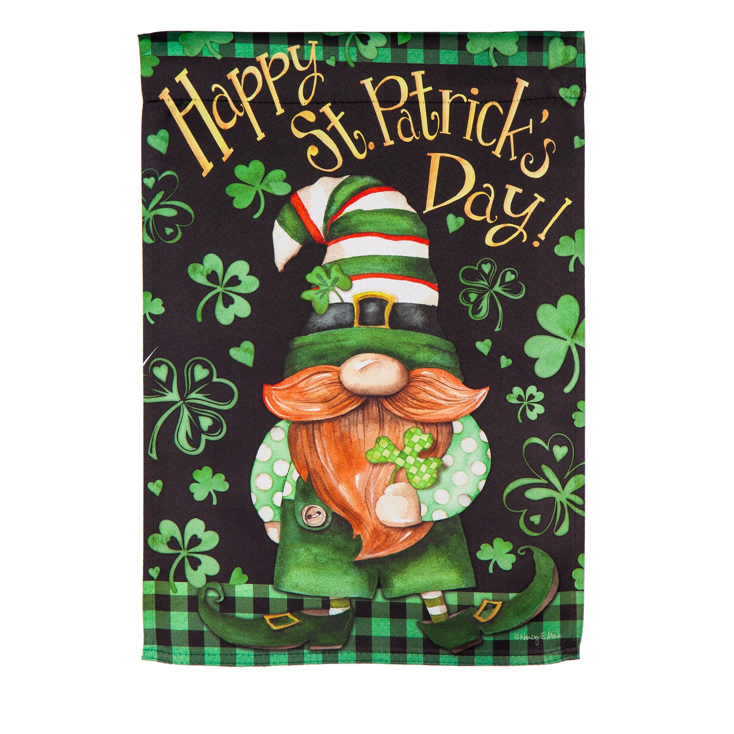 This charming flag adds an extra special touch to any home. Features lively colors and attractive Lucky Gnome design. Flag is crafted of medium-weight suede fabric made from recycled plastic that provides a soft and durable texture. Artwork is heat transferred onto the sun-blocking material so that it is easily viewed from both sides. The weatherproof flag will not fray or fade with continued outdoor use. This flag features a sleeve for use with any standard flagpole or stand, sold separately.