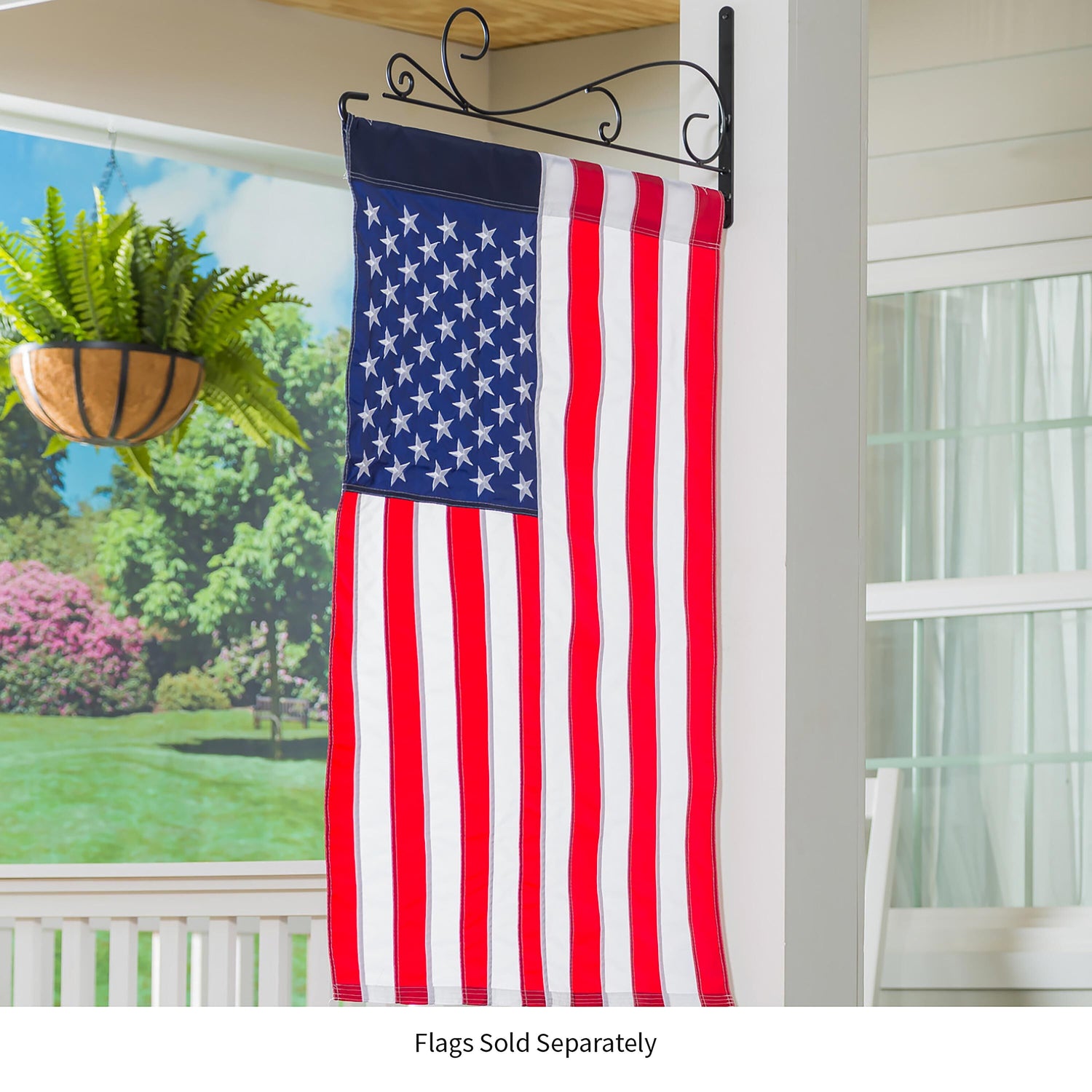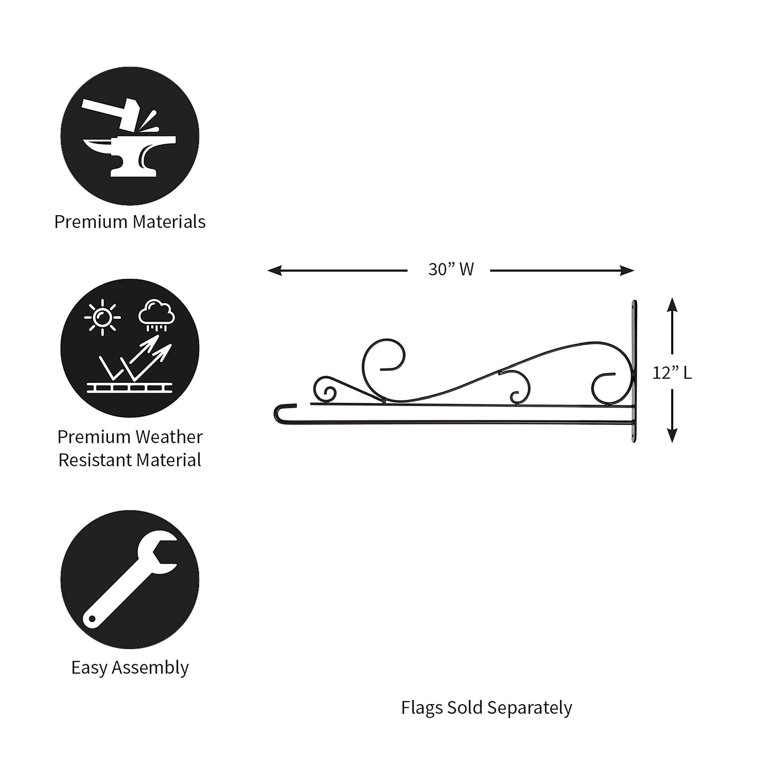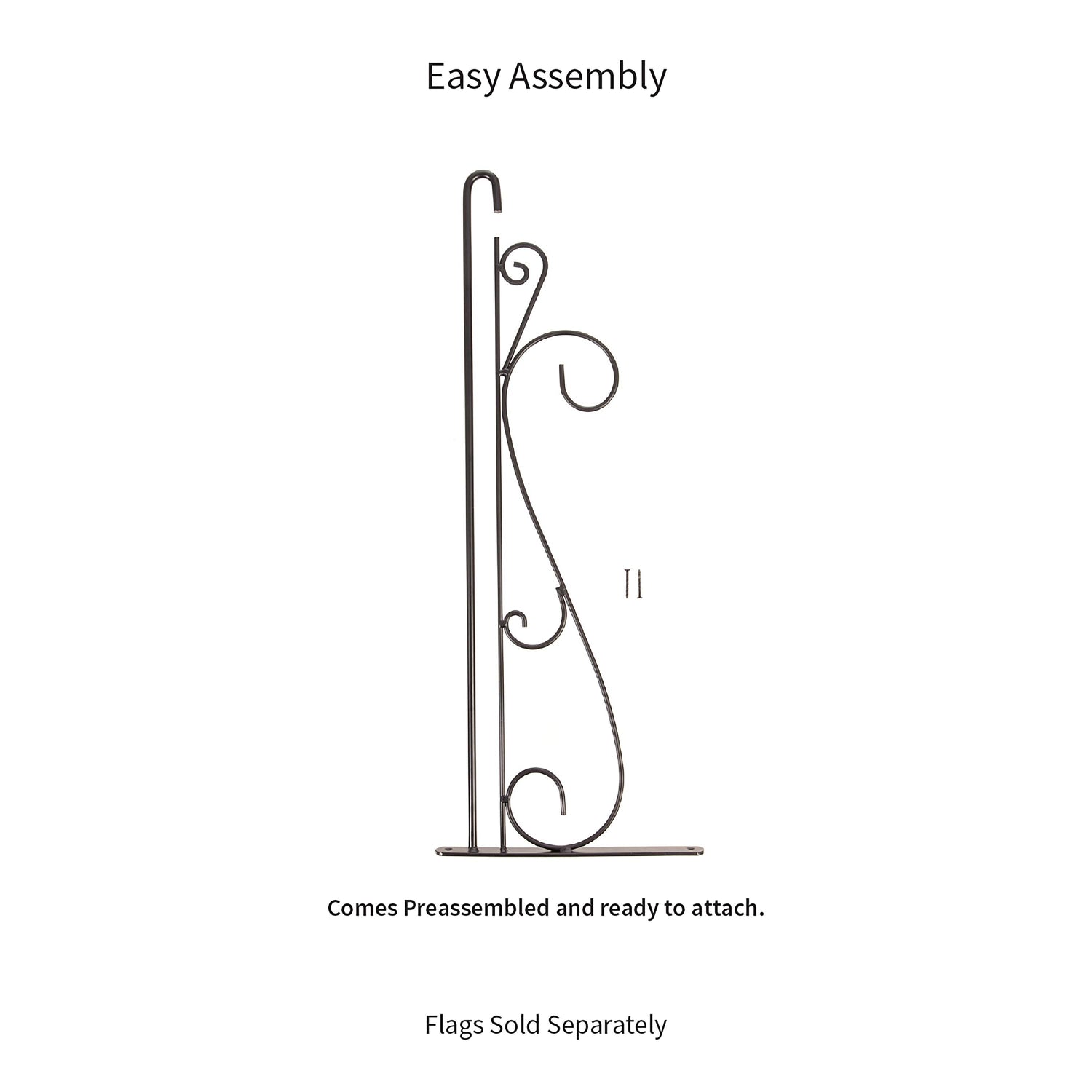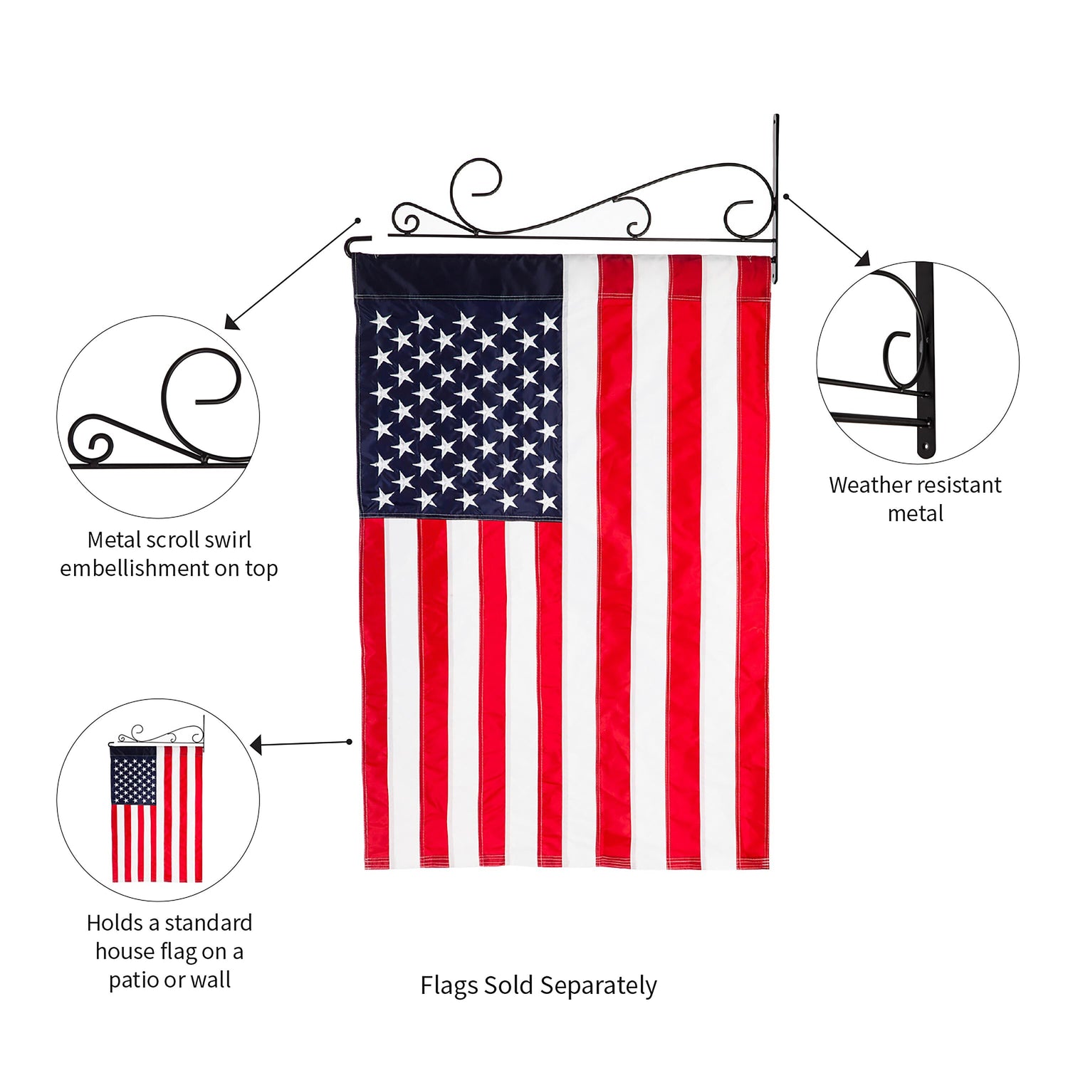 Mount this swirl metal garden flag hanger on any wall to showcase your favorite design! Crafted from powder-coated, weather-resistant metal, the design is perfect for outdoor use. The black metal wall-mounted bracket is designed to hold a standard house flag on a patio or wall. With its swirled scroll embellishment, this hanger is an elegant addition to any home. Hanging hardware is included.