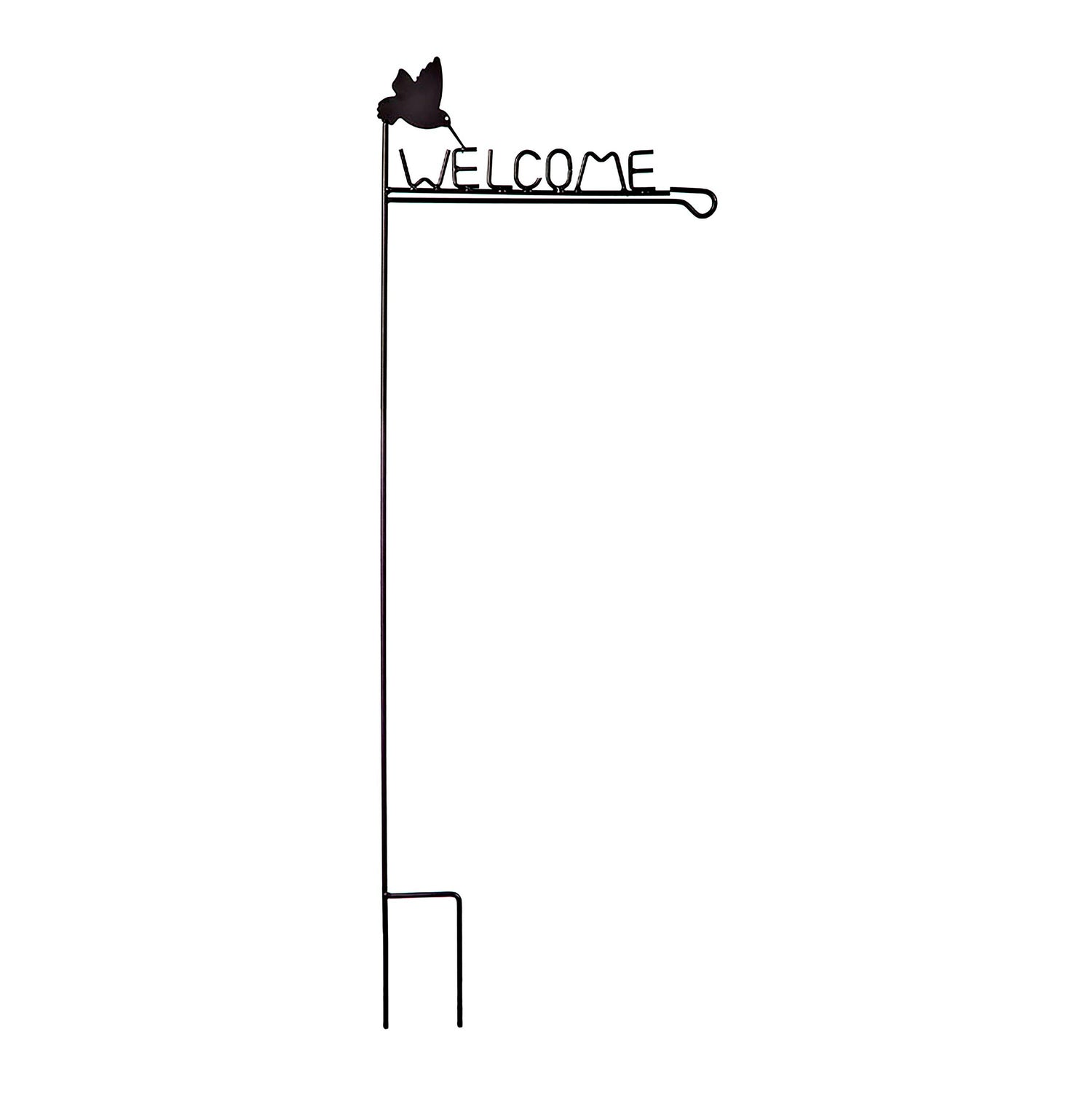 Add a welcoming touch to any of your garden flags with this metal flag stand. The word "Welcome" and a hummingbird appear on the top of the flag stand, crafted out of durable metal. Flag stand will hold most standard size garden flags and stakes easily into the ground.