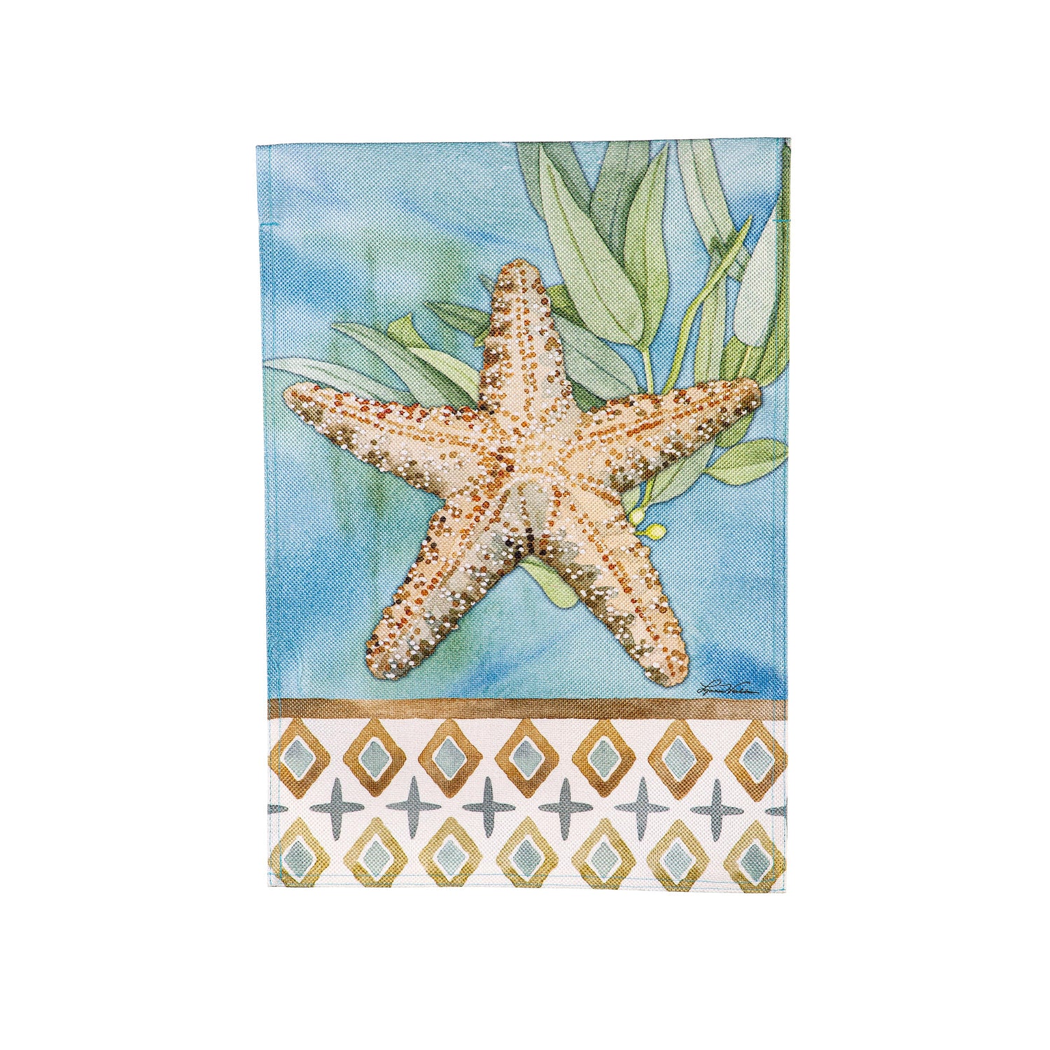 This eye-catching flag adds an extra special touch to any garden or outdoor space. With its vibrant, cheerful looks and Coastal Starfish design, this flag welcomes friends and family in beautiful style. This flag is made of medium-weight, soft burlap fabric that's made from recyled plastic that has the look and feel of real burlap. Artwork is heat transferred onto both sides of the textured fabric to create a natural, crafted look. The flag is durable and weatherproof and will not fade or fray after continued display. This flag features a sleeve for use with any standard flagpole or stand, sold separately.