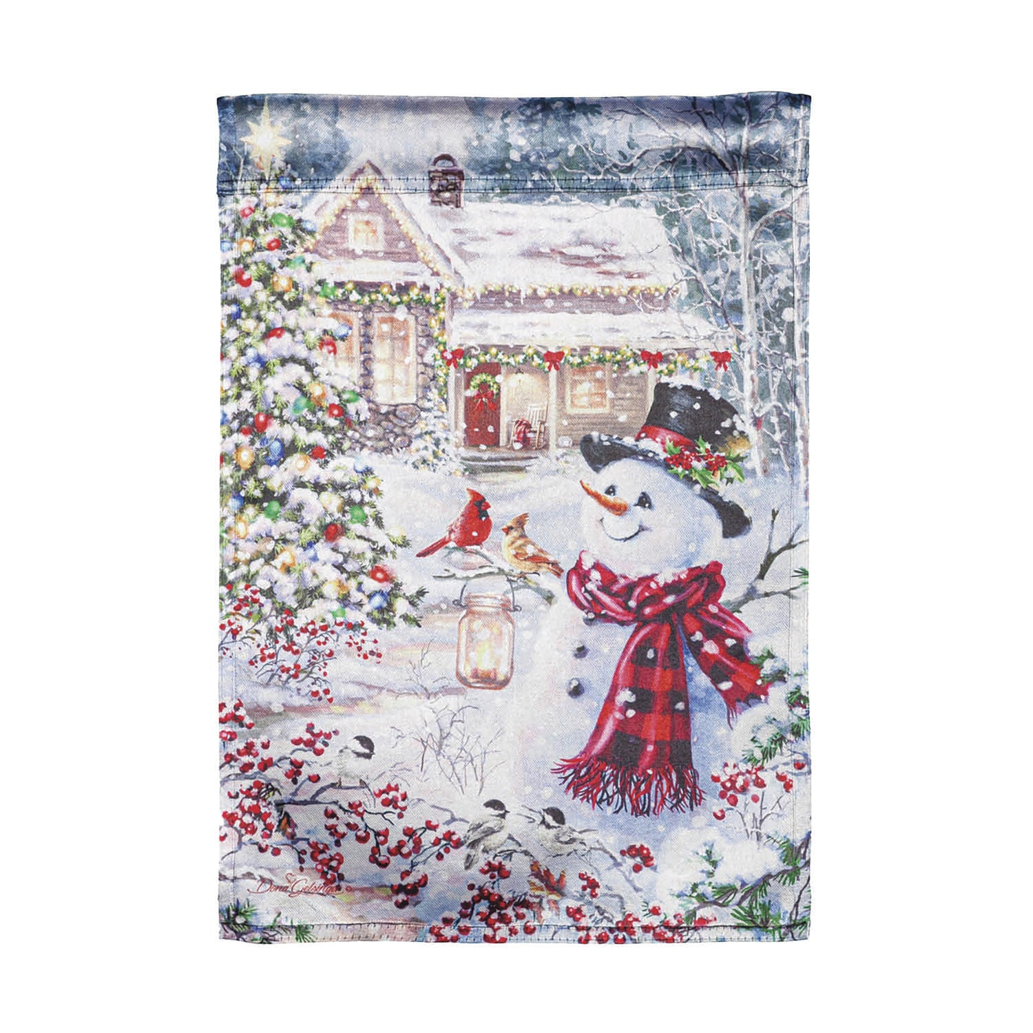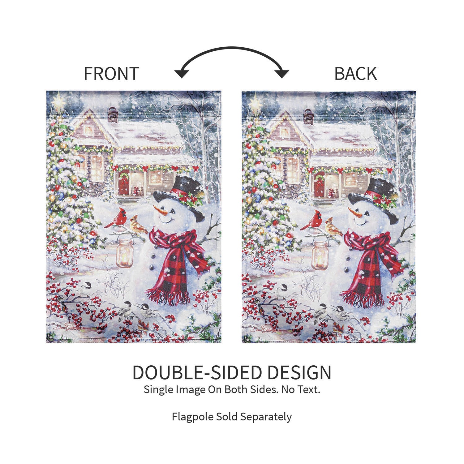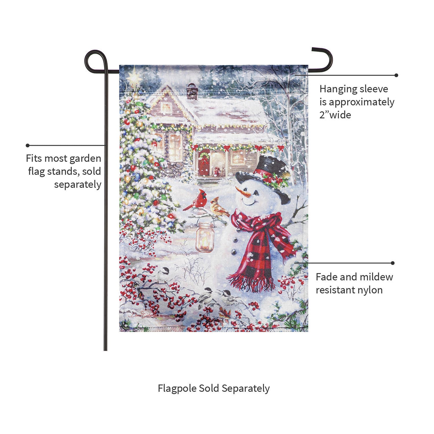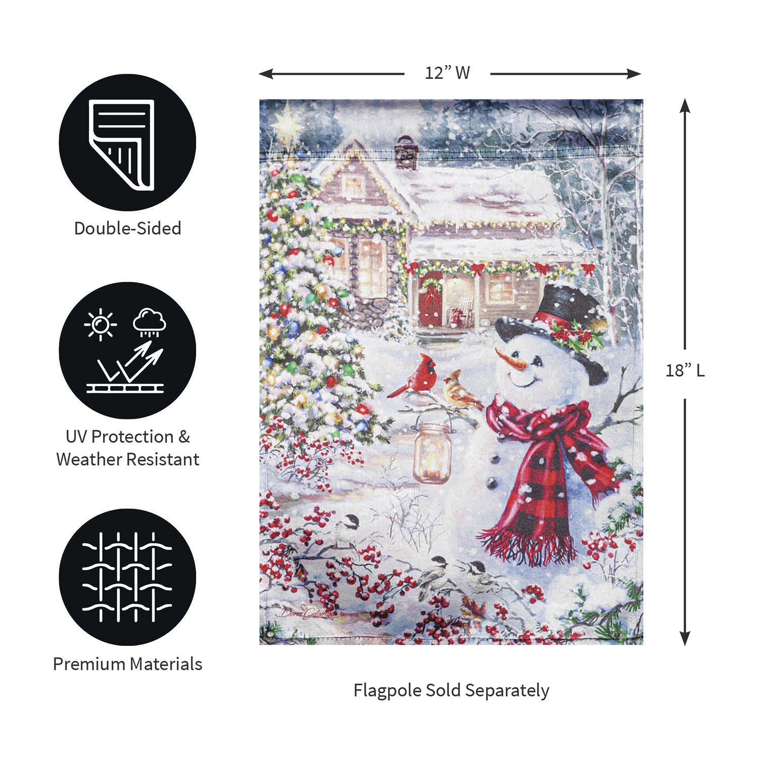 Turn your outdoor space into a winter wonderland with this Cottage in the Snow Garden Lustre Flag. This design shows a charming snowman wearing a top hat and a cardinal couple perched on his branch arm holding a lantern. A decorated cottage and Christmas tree provide the perfect backdrop to this cozy holiday scene. Made of premium satin polyester fabric with the highest sheen on the market, our Lustre Flags shimmer in the sunlight to mesmerize neighbors and guests. Artwork is heat transferred onto both sides of the flag to guarantee the UV dyes are locked in. These two-sided designs use our sun-blocking technology to minimize fading and fraying, ensuring they remain vibrant and protected against the elements season after season.