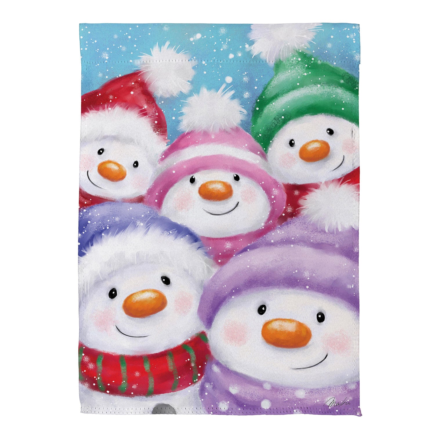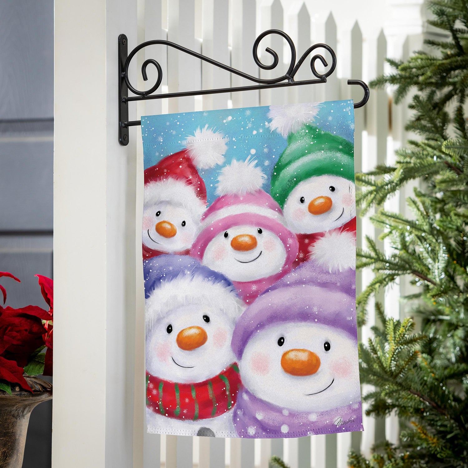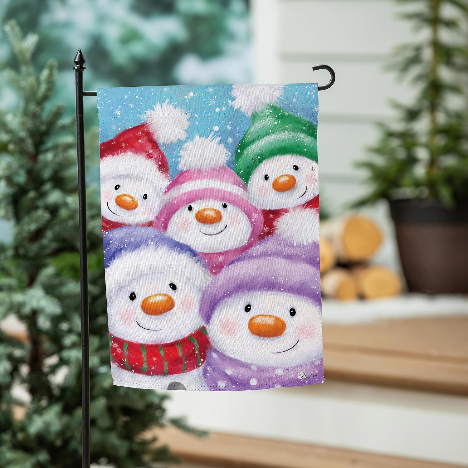 Add magic and wonder to any garden or yard when you hang up this beautiful flag. Featuring an adorable snowman family, this flag is perfect for the festive season. Flag is crafted of medium-weight suede fabric made from recycled plastic that provides a soft and durable texture. Artwork is heat transferred onto the sun-blocking material so that it is easily viewed from both sides. The weatherproof flag will not fray or fade with continued outdoor use. This flag features a sleeve for use with any standard flagpole or stand, sold separately.